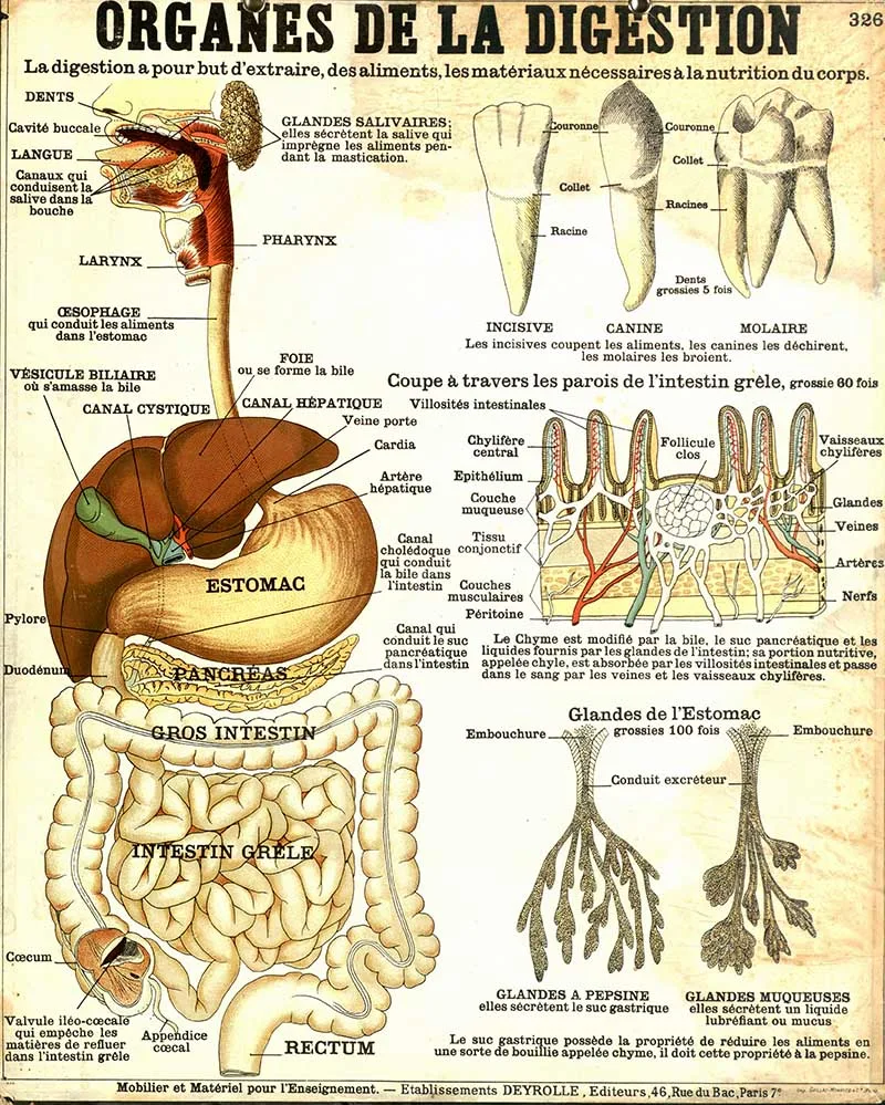 This Deyrolle poster illustrates the human digestive system from the mouth and teeth, esophagus, stomach, intestines, right through to the rectum.