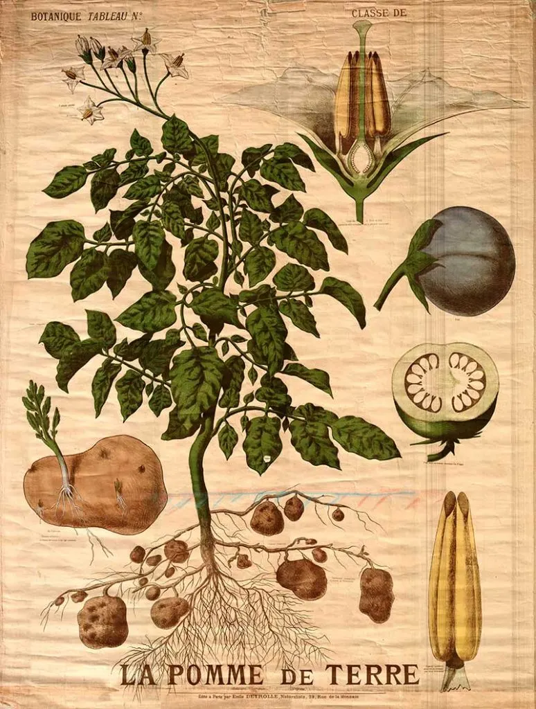Vintage classroom poster showing the anatomy of the potato. Pomme De Terre literally translates as “apple of the earth.”