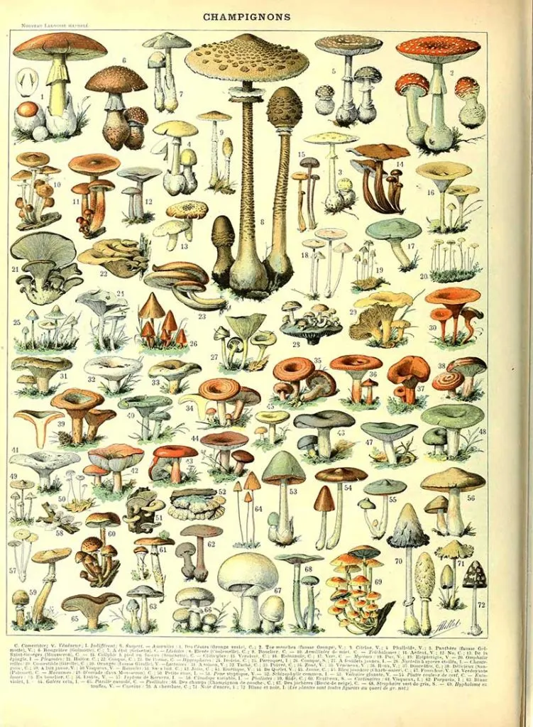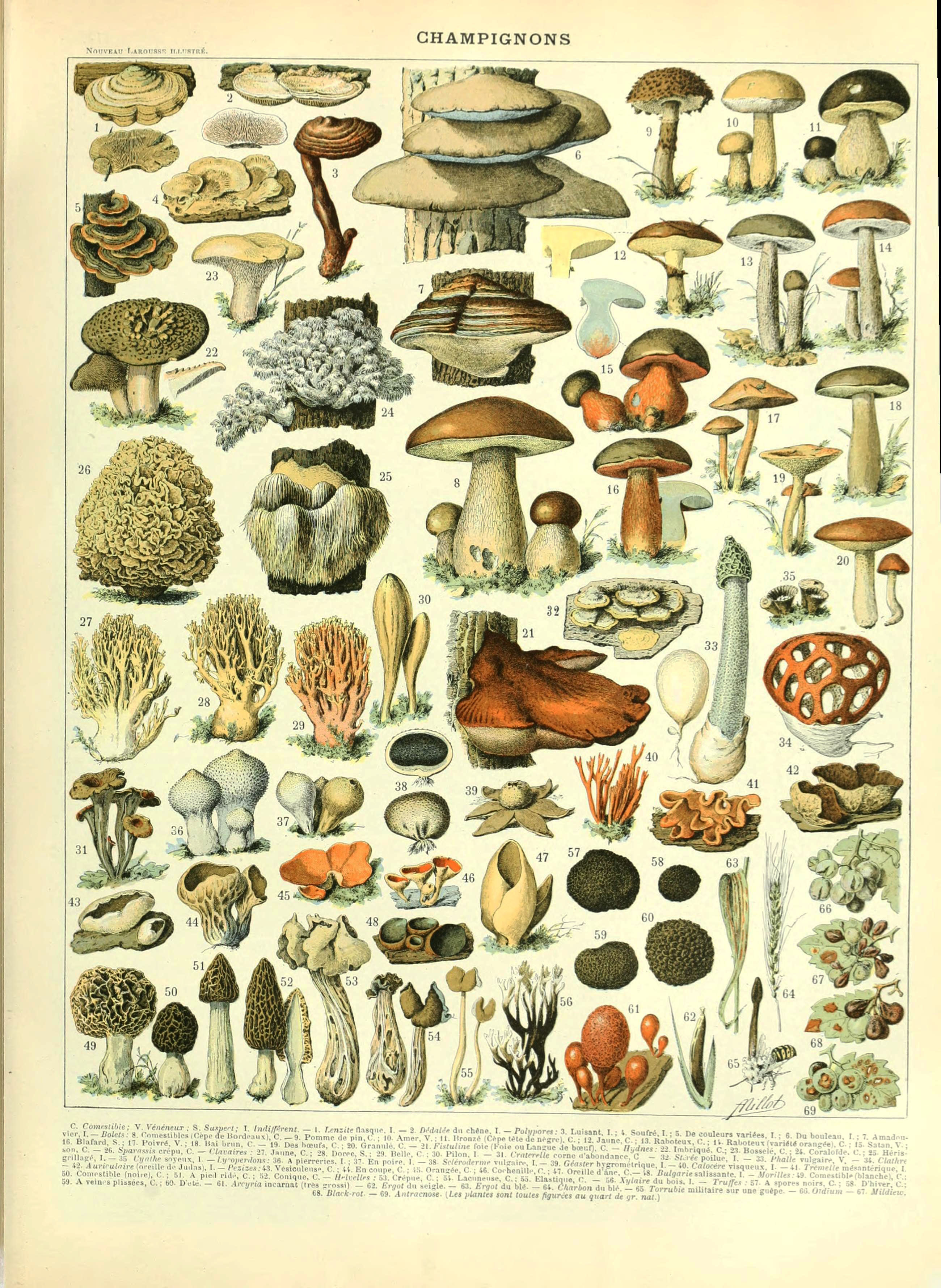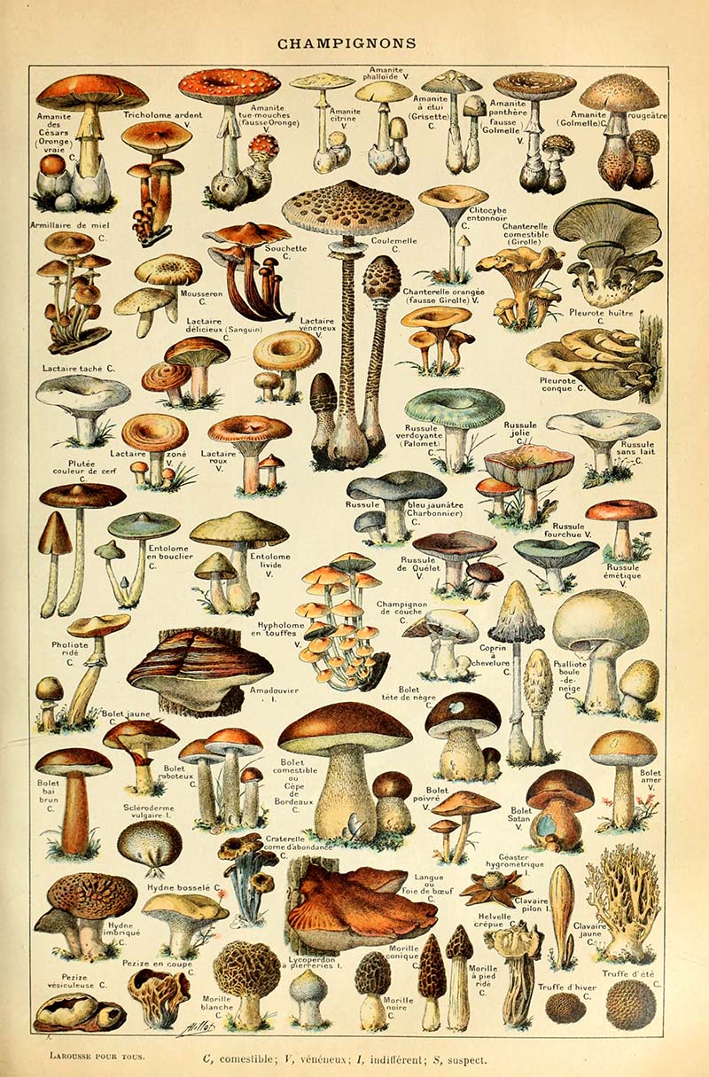 A lovely identification botanical poster of over 40 mushrooms, toadstools, fungi and truffles. A handy key at the bottom indicates whether the poster’s mushroom illustrations are consumable, poisonous, indifferent or suspect ( comestible, vénéneux, indifférent, suspect.)