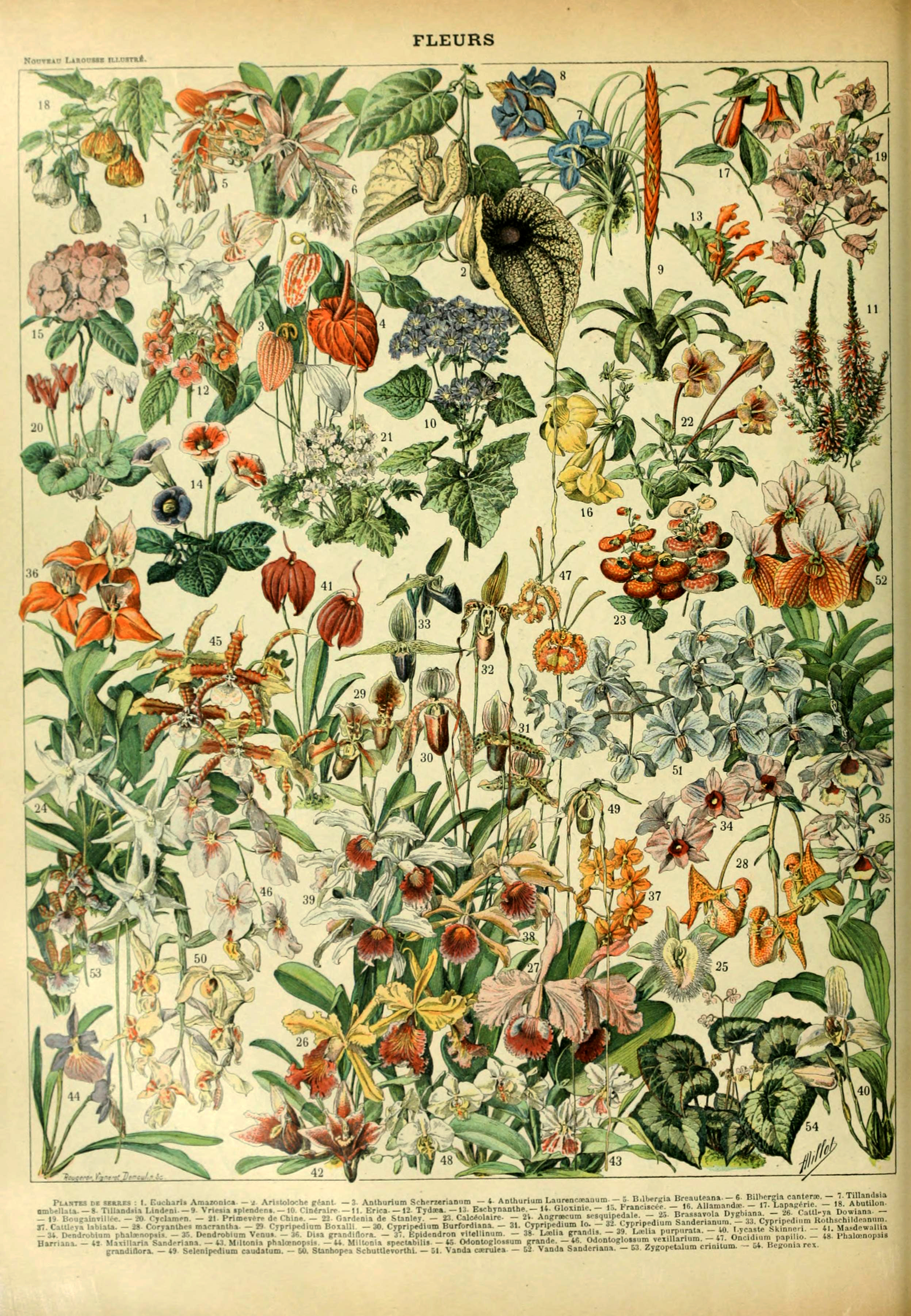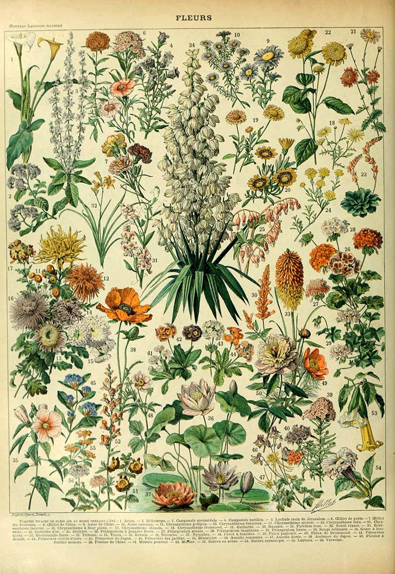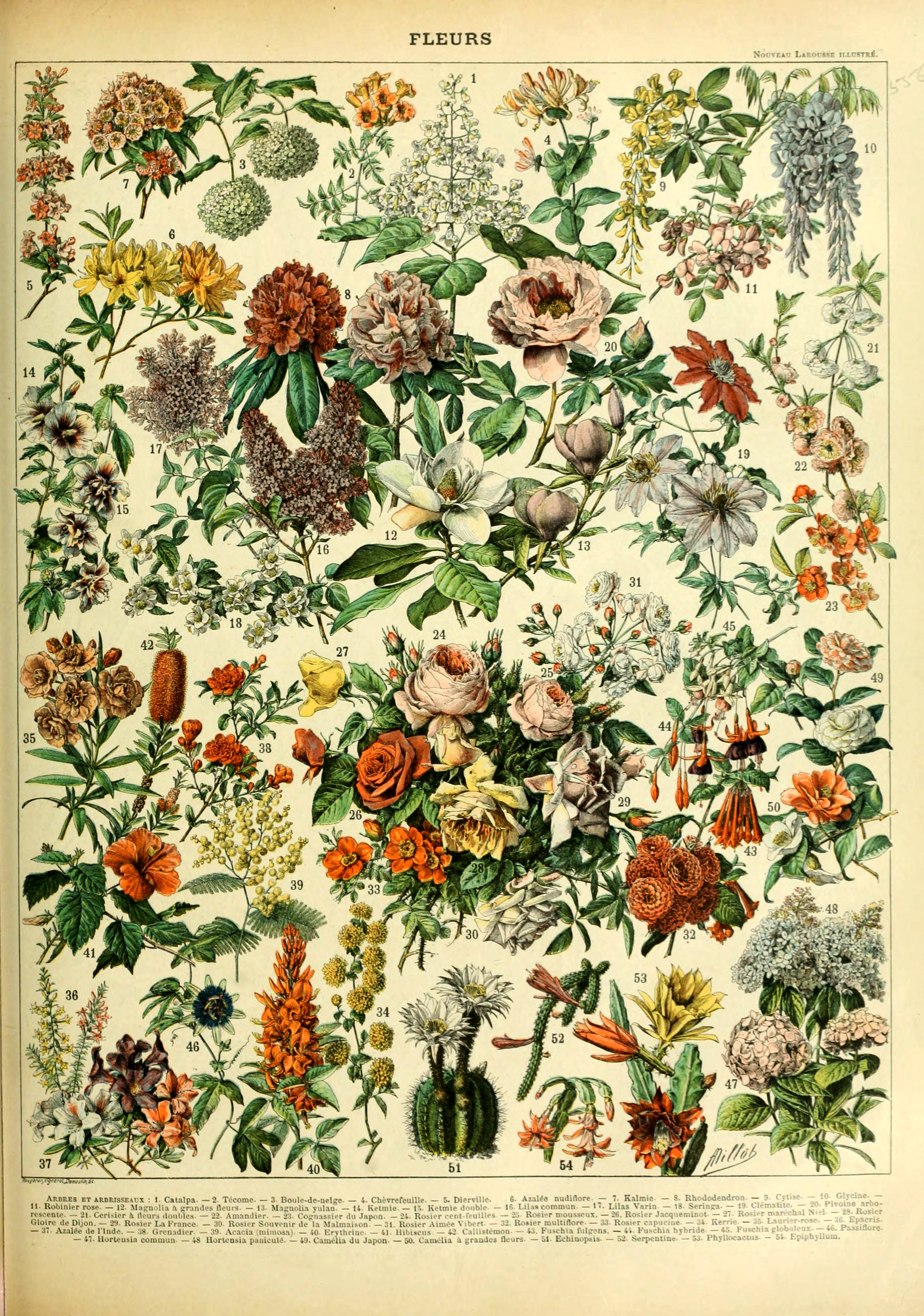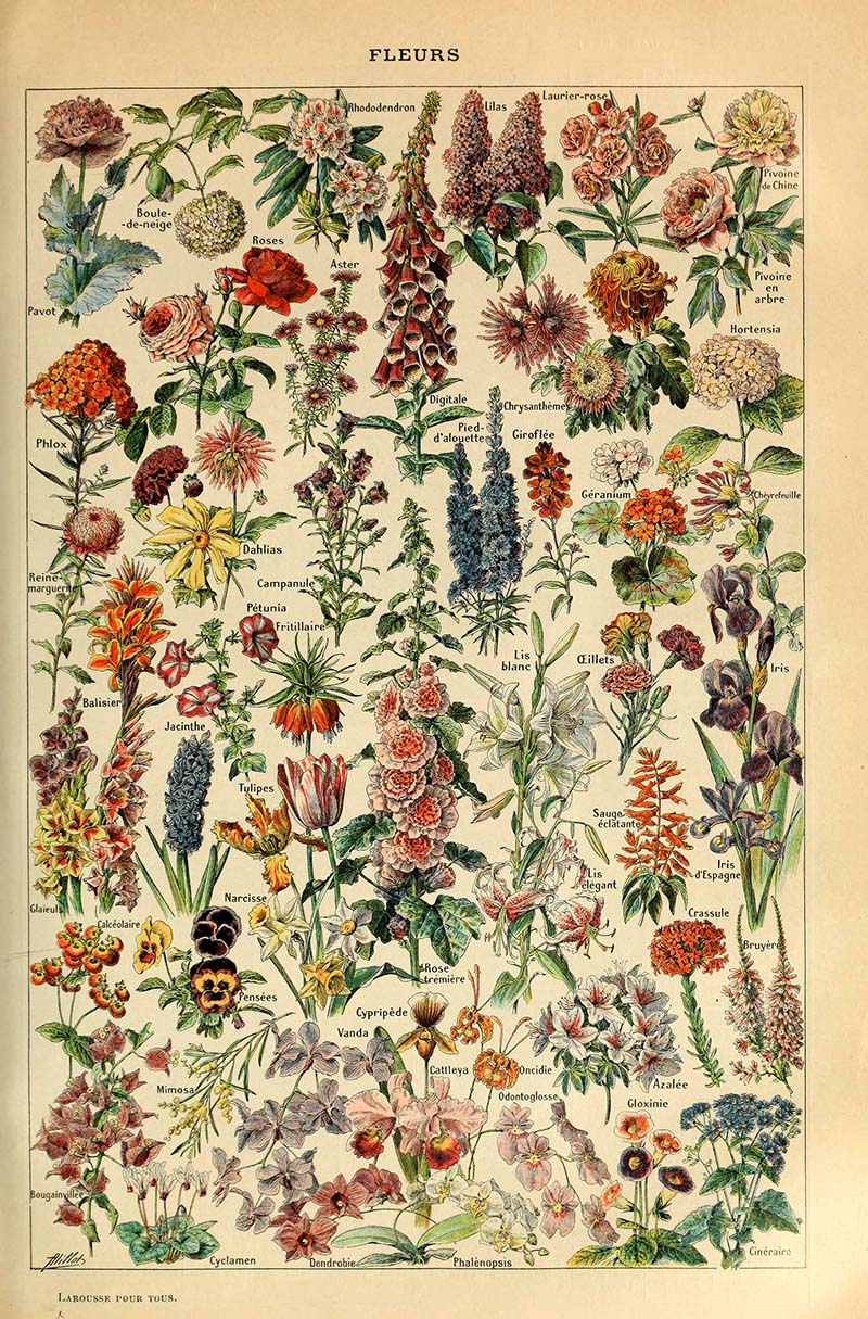 An Adolphe Millot botanical poster of flowers from “Le Larousse pour tous“. A fantastic poster of pretty flowers. Instead of a key at the bottom, the name of each flower is written next to it.