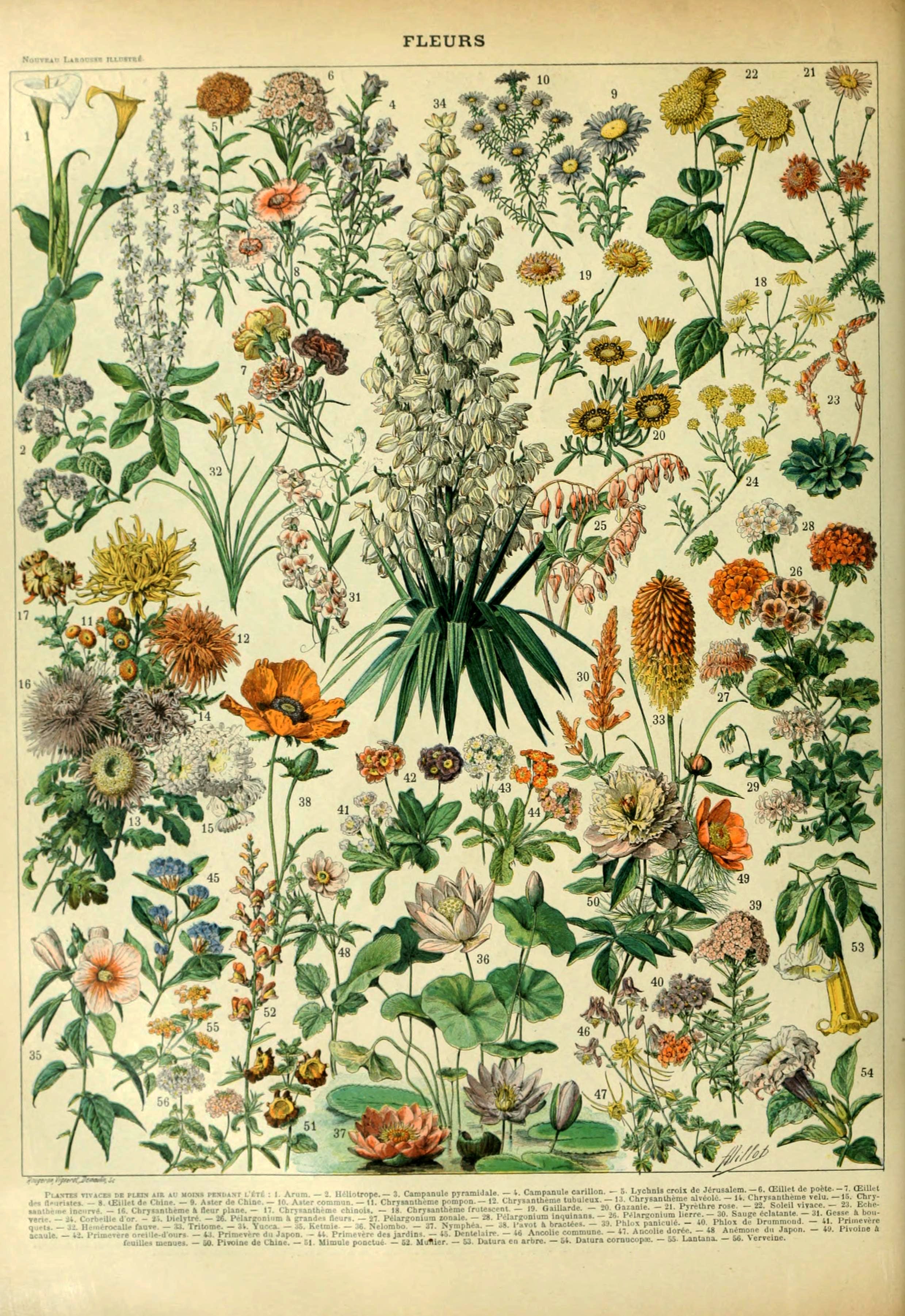 This is the second of four flower botanical posters. “Plantes vivaces de plein air au moins pendant l’été“, summer outdoor perennials. A perennial plant lives for more than two years.
