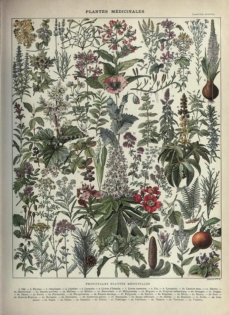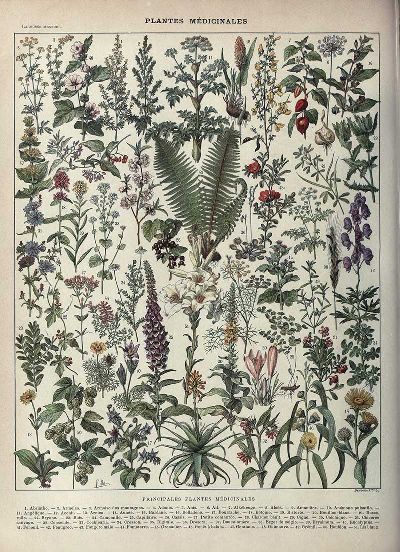 An attractive black and white drawing of a vast range of botanicals by Adolphe Millot that featured in the Larousse Illustrated Dictionary.