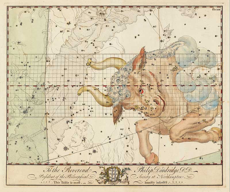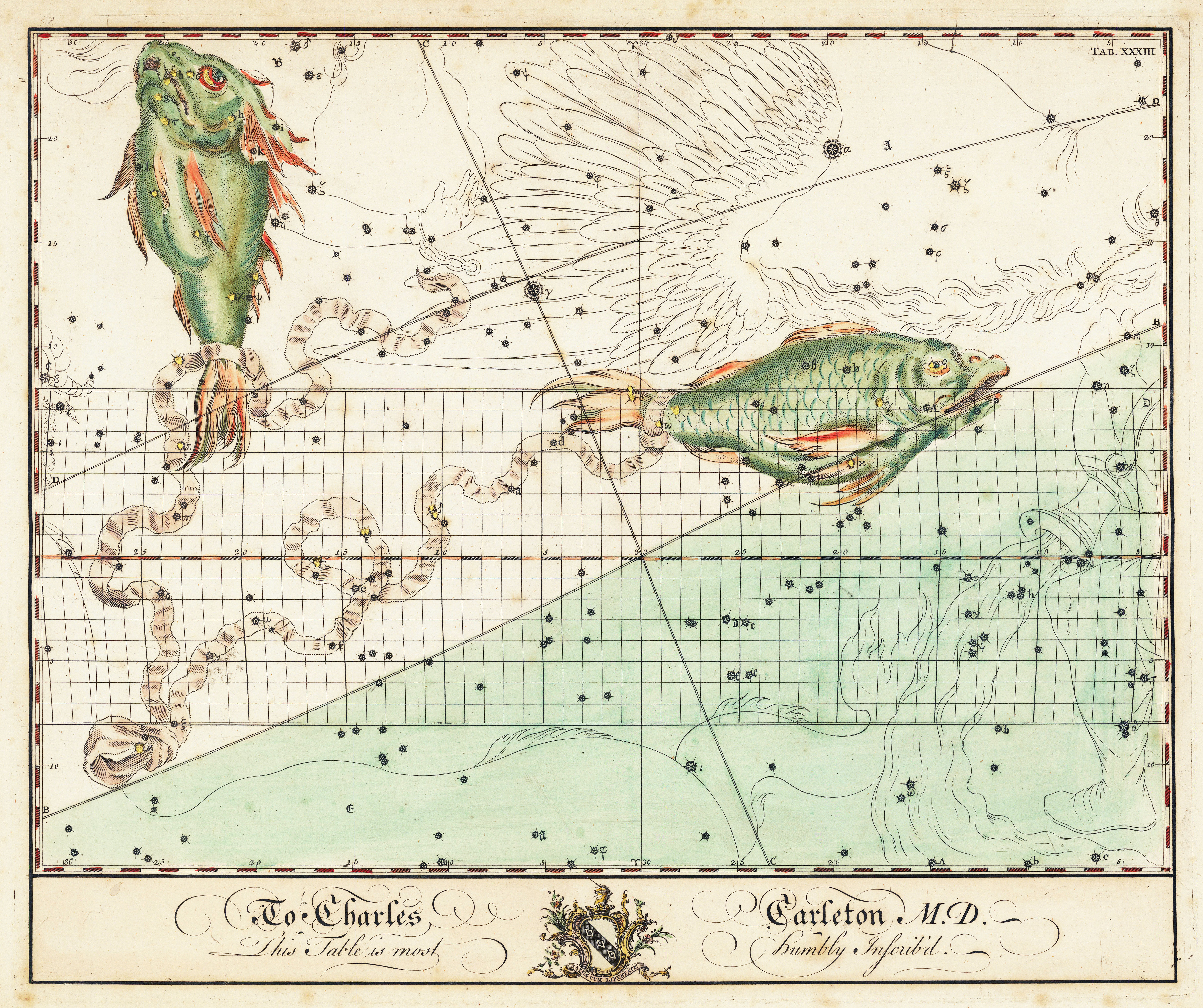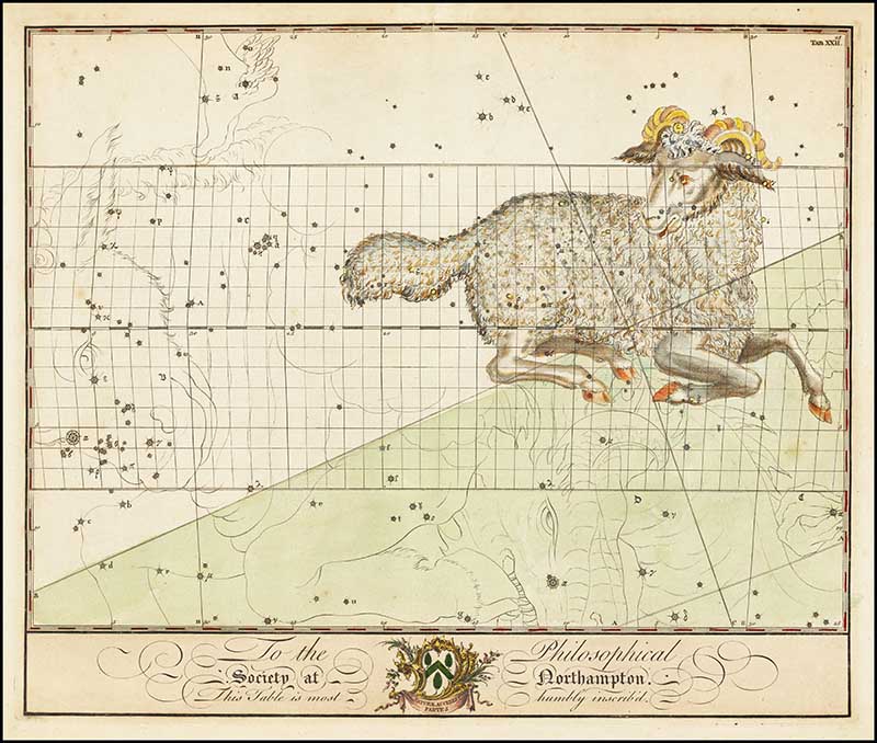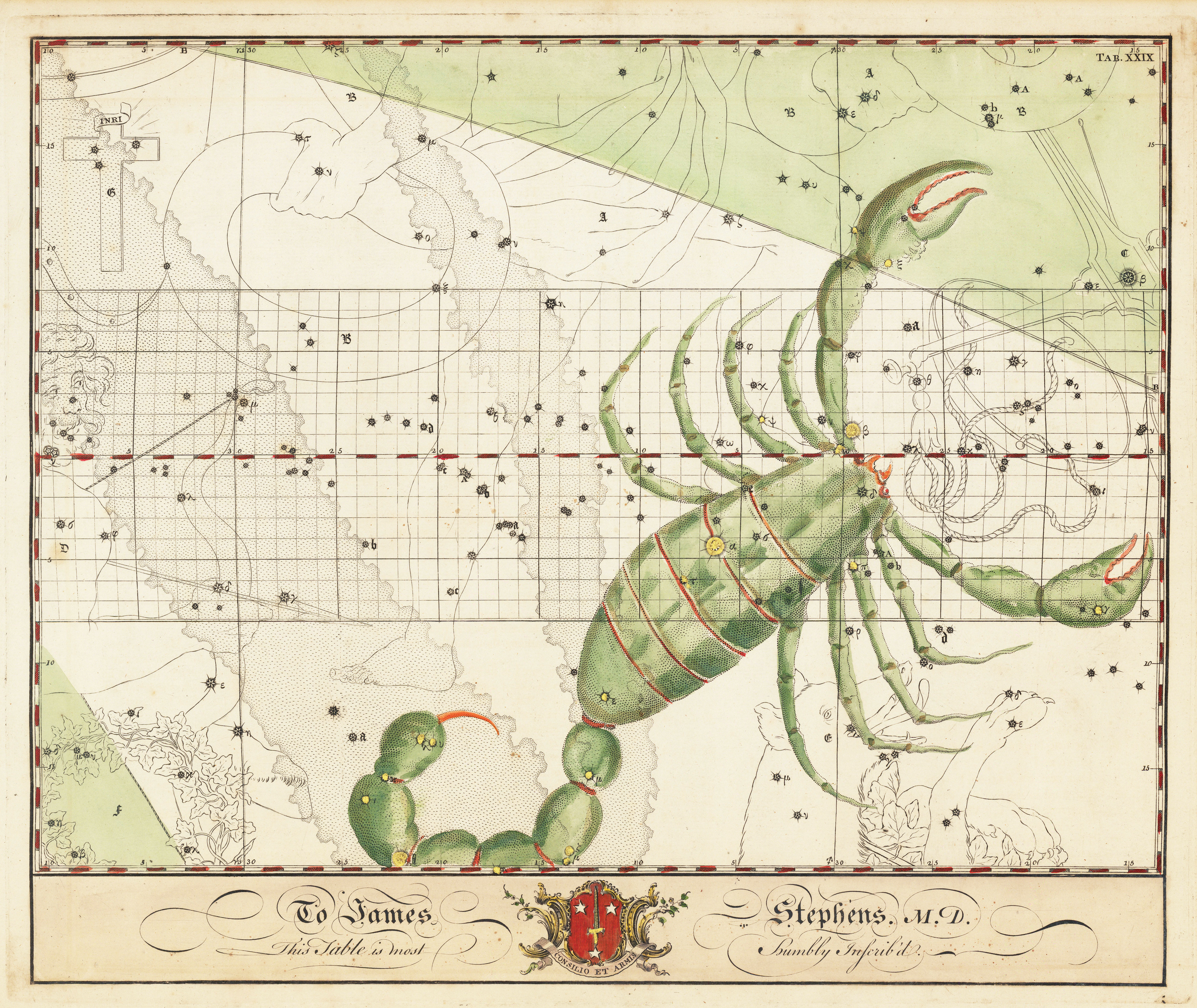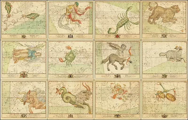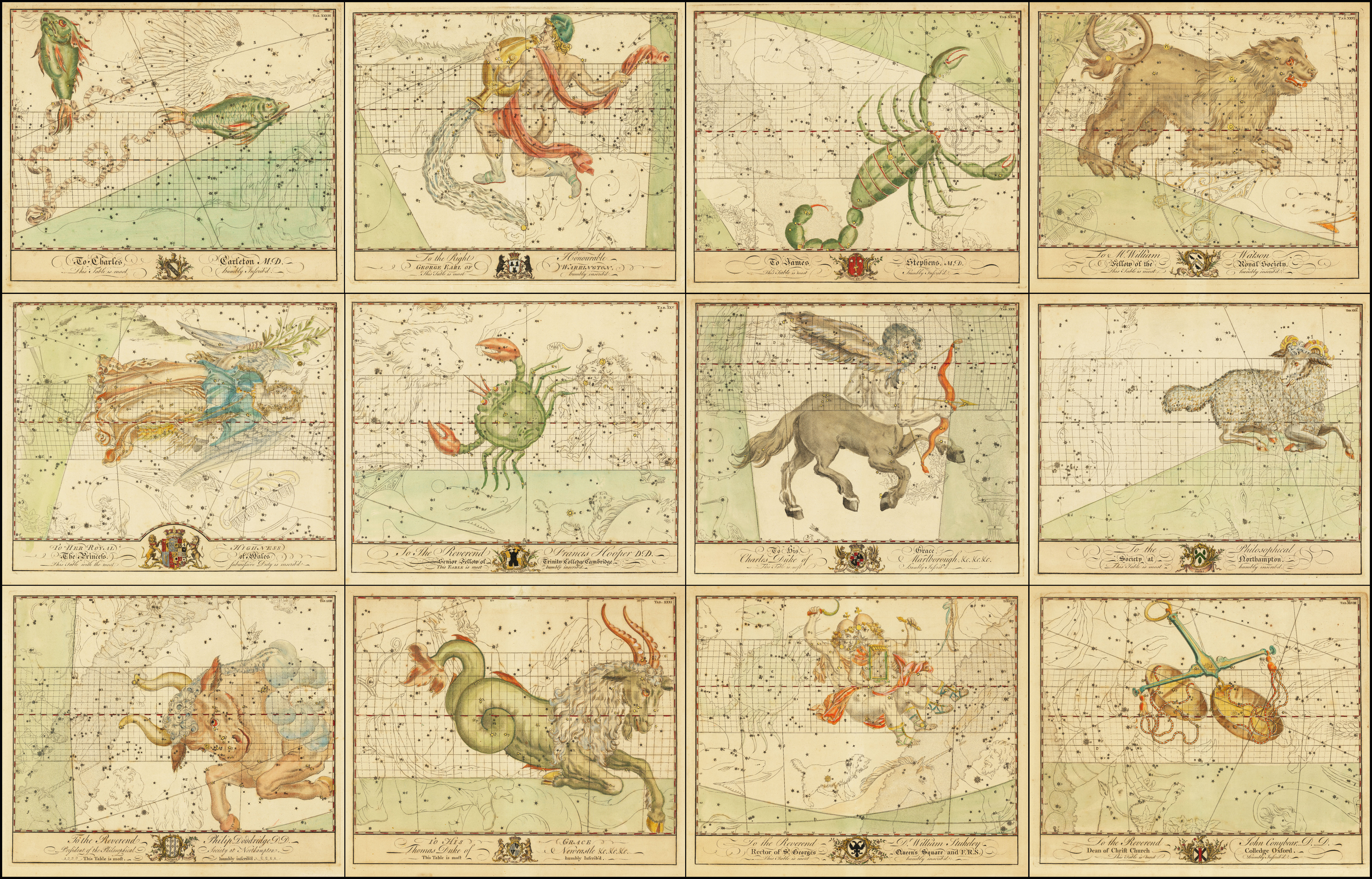 John Bevis’s star charts predate the Sidney Hall zodiac signs by over 30 years. The Zodiac Star Charts are from his book Uranographia Britannica.