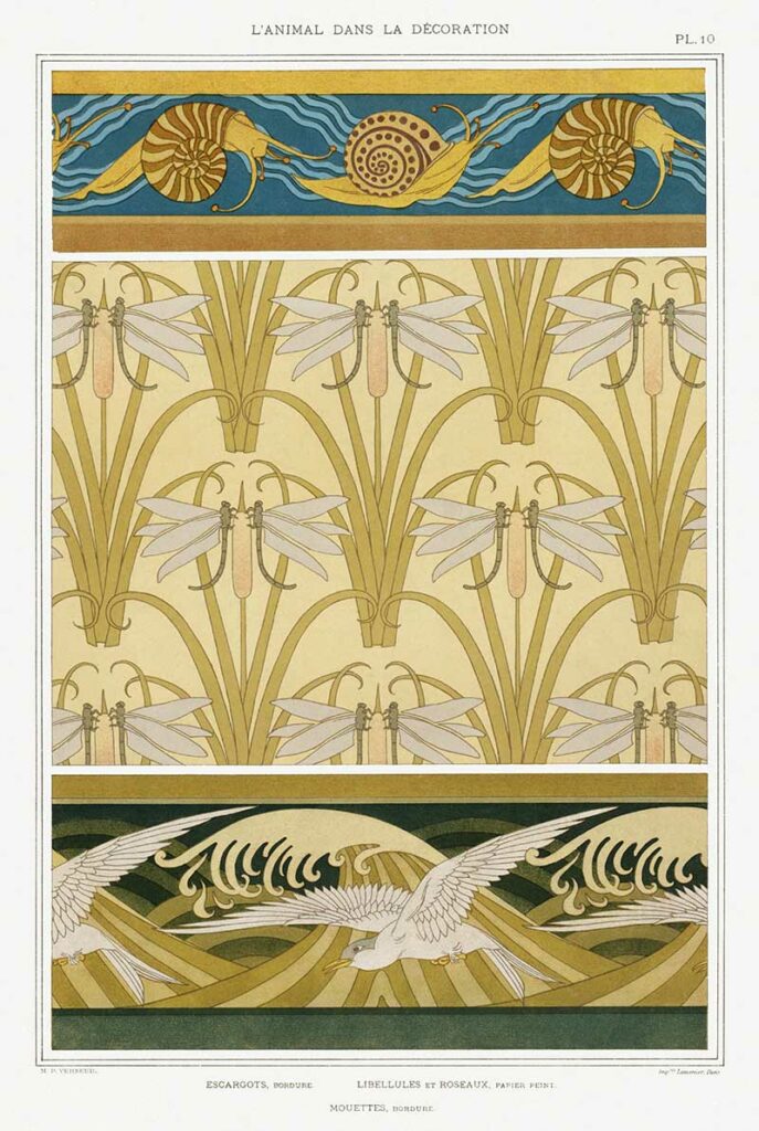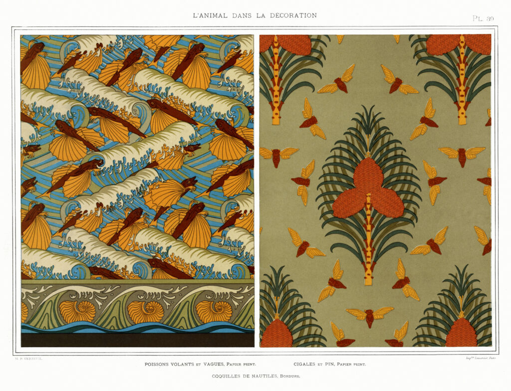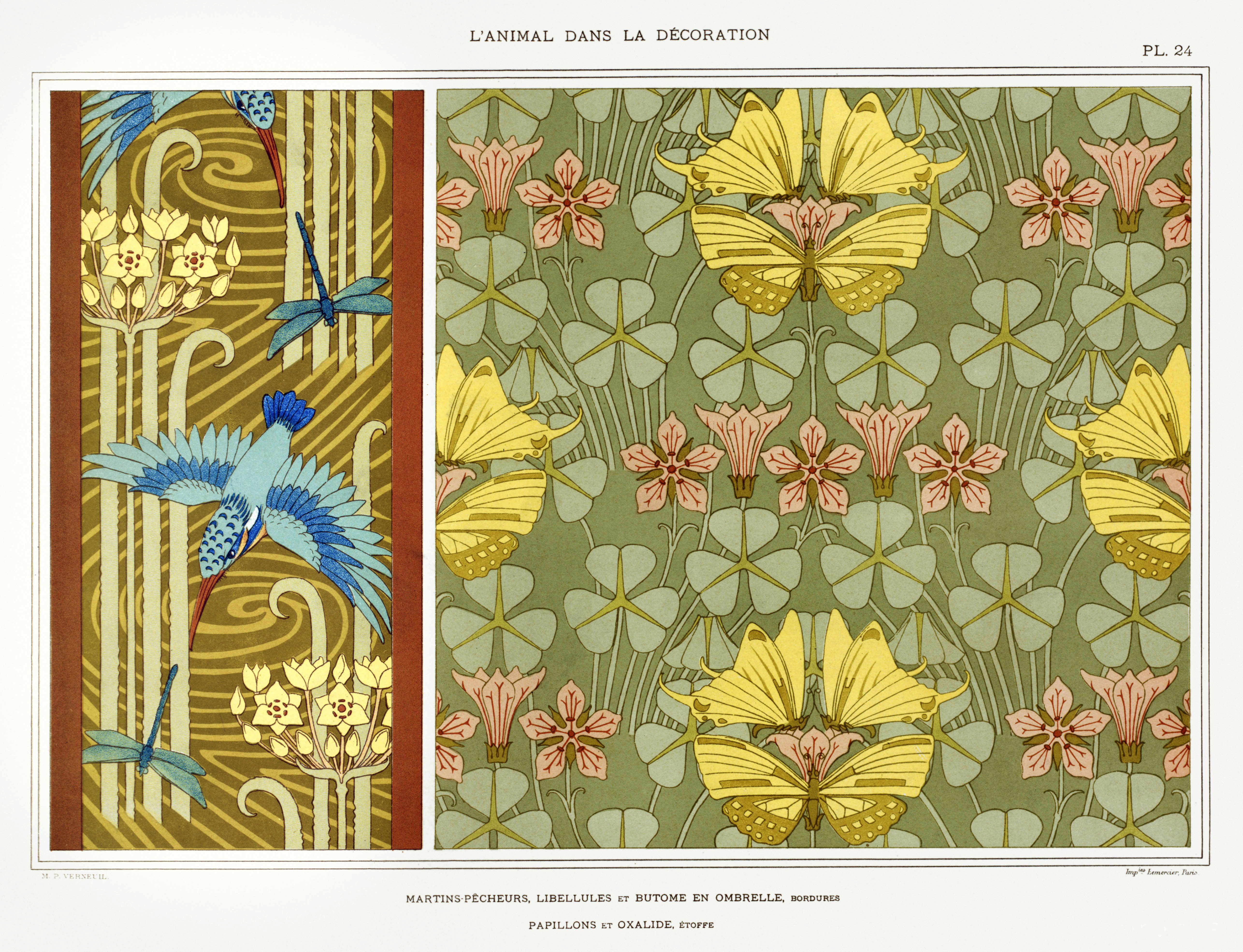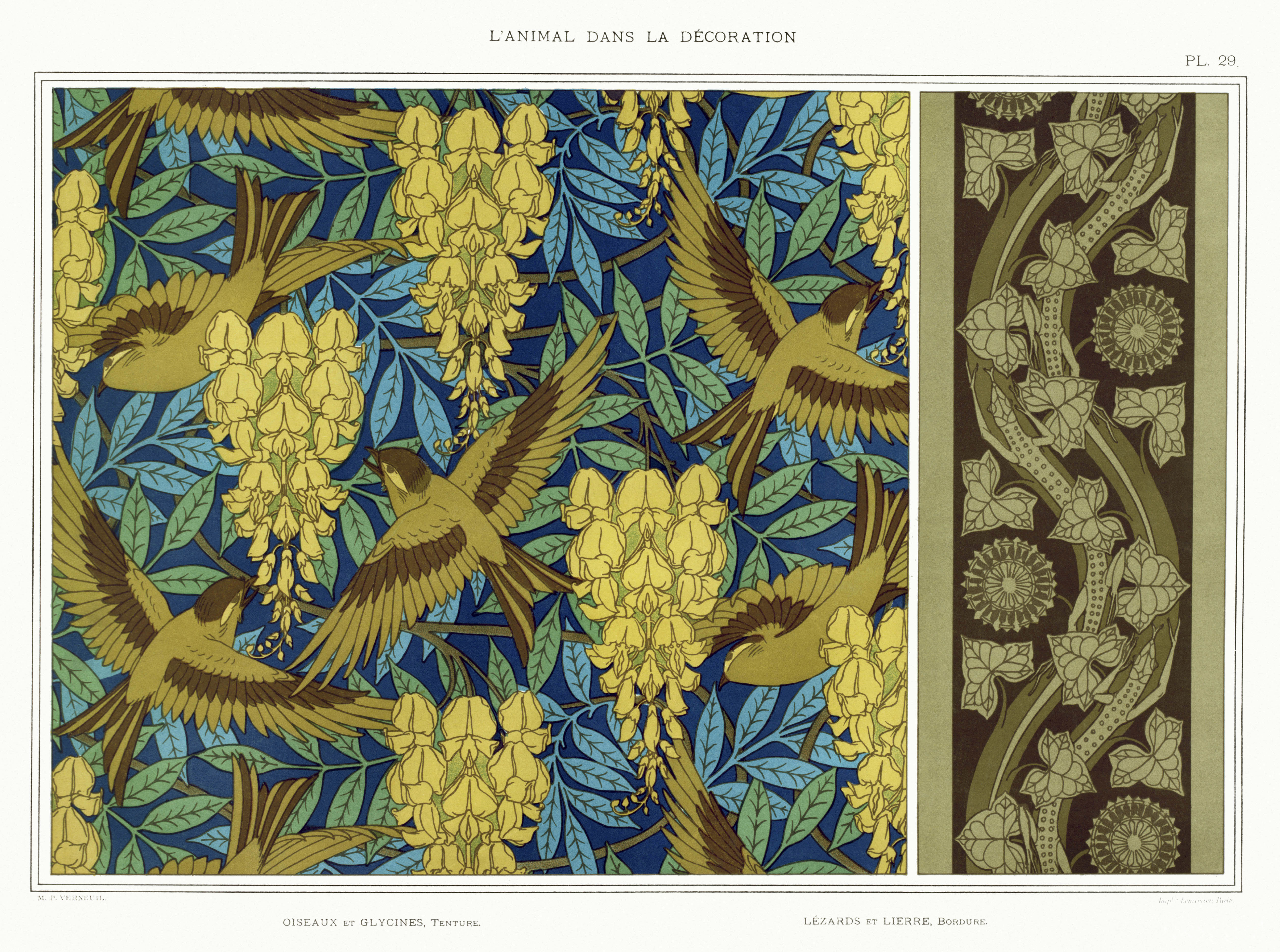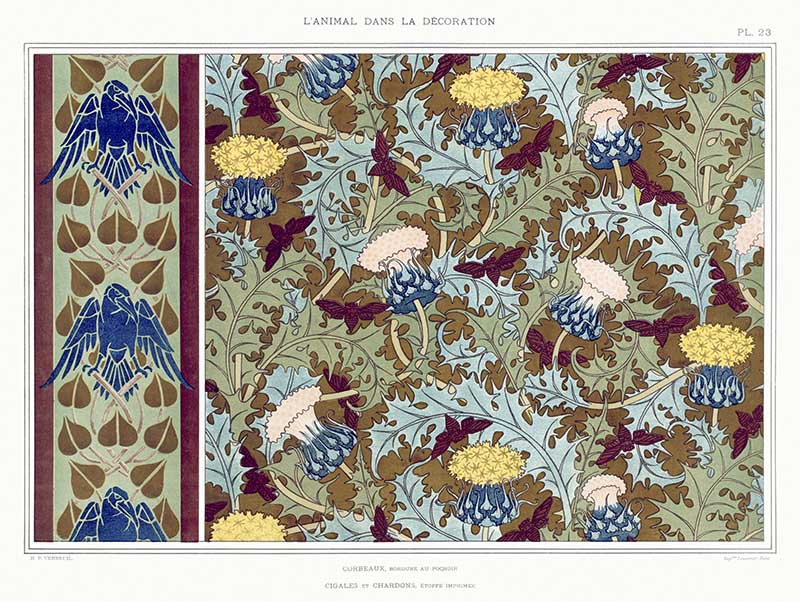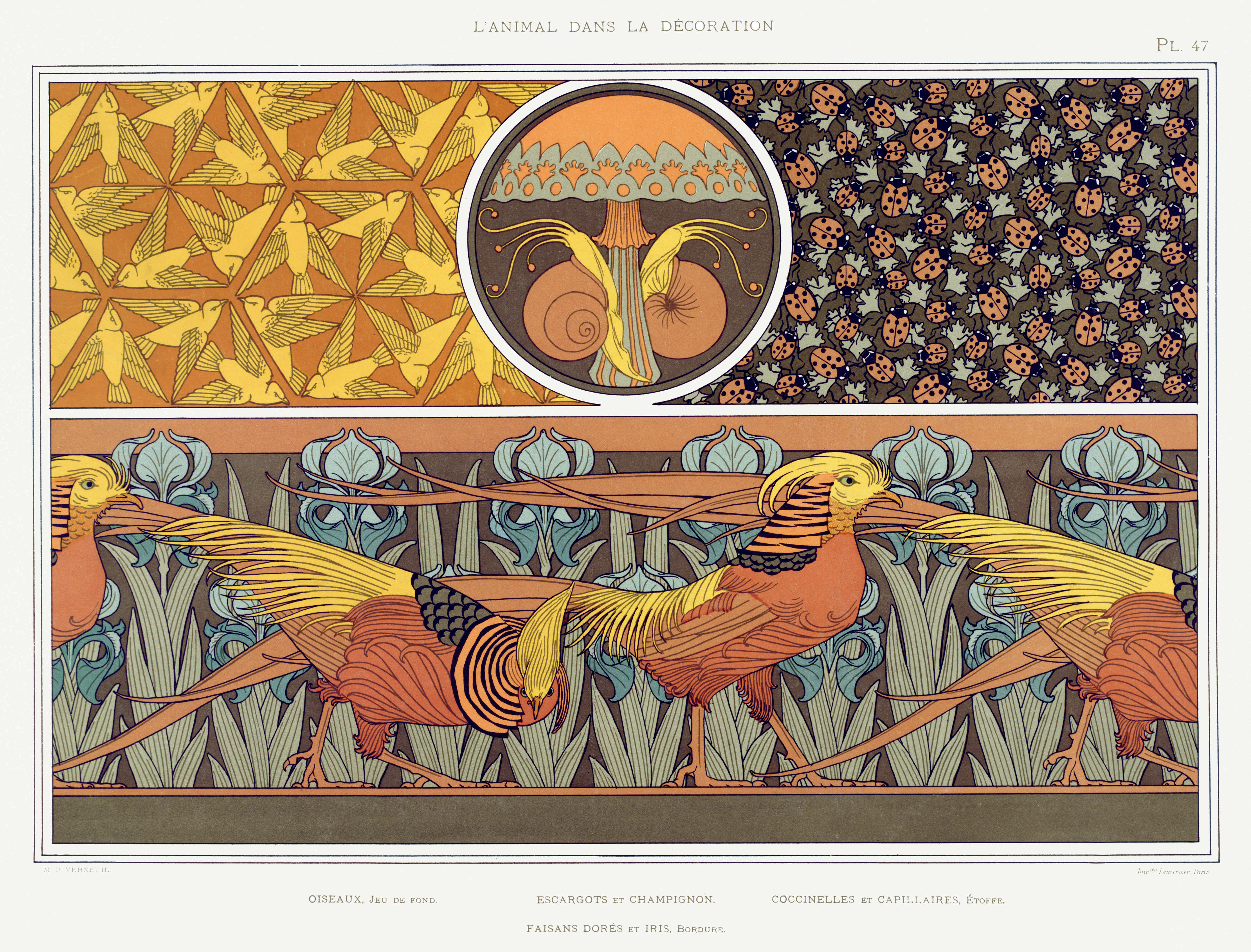 The collection here is the Maurice Pillard Verneuil designs and patterns inspired by the animal kingdom. These art nouveau prints celebrate the wide variety of designs in nature. They are heavily influenced by plant and animal forms such as birds, fish, insects, flowers, trees and other living creatures.