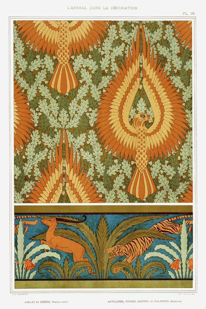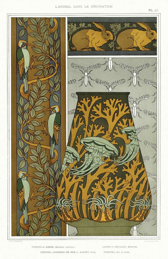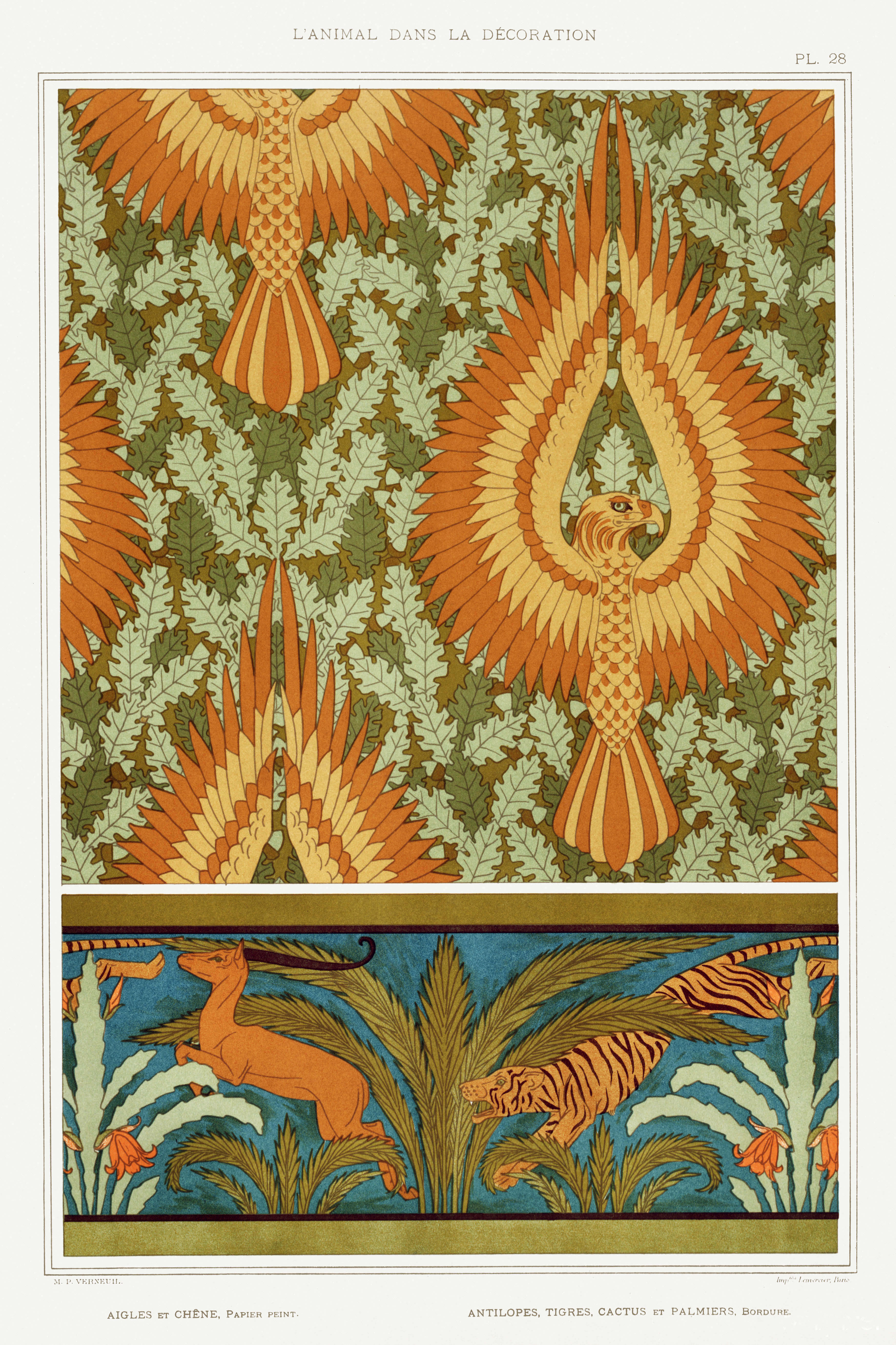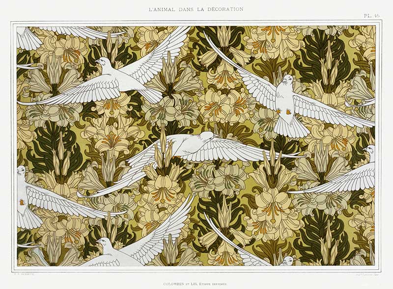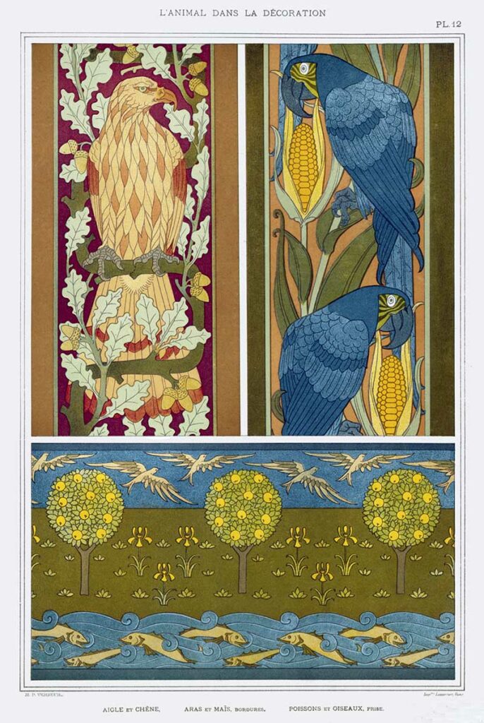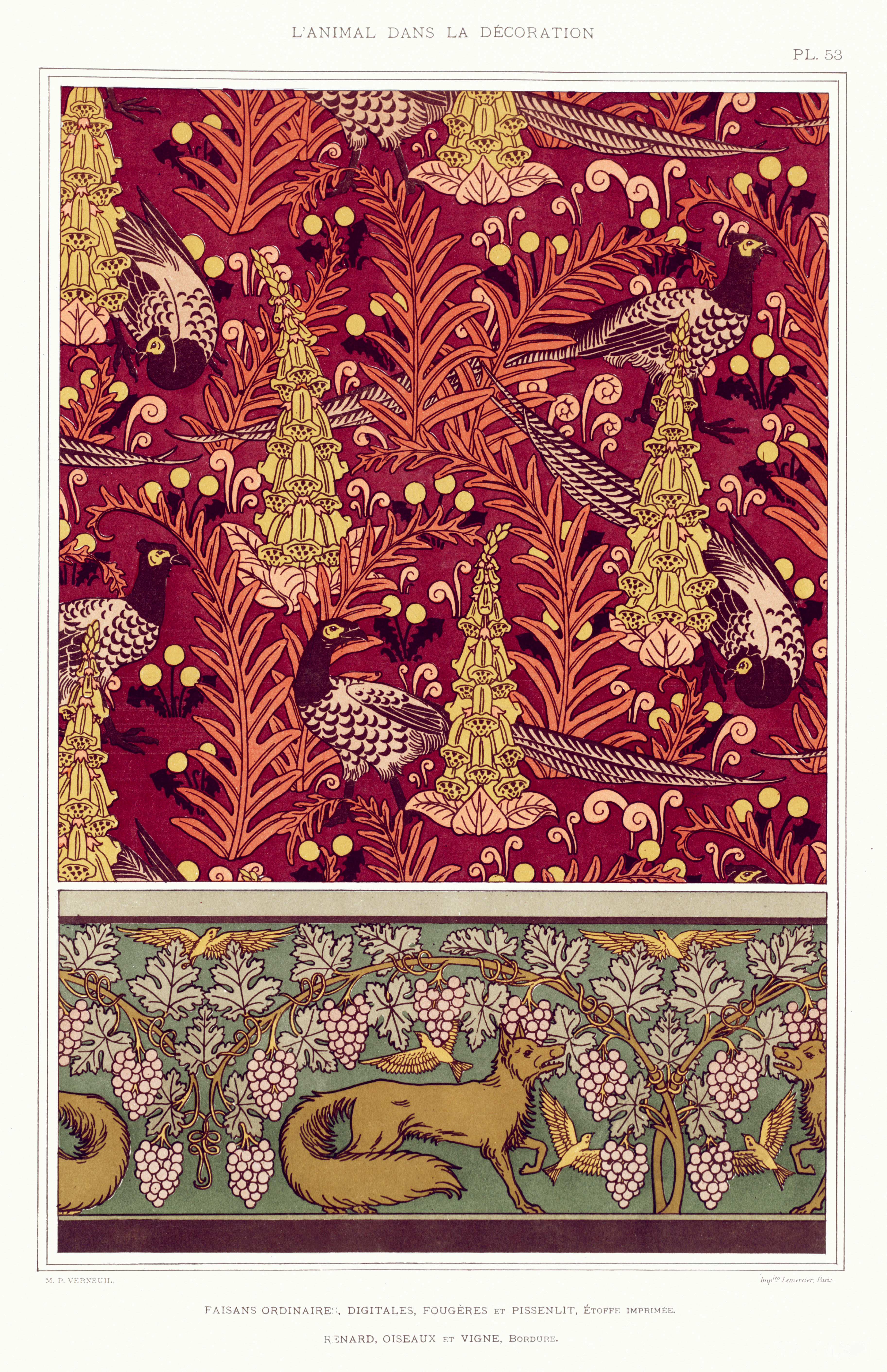 The collection here is the Maurice Pillard Verneuil designs and patterns inspired by the animal kingdom. These art nouveau prints celebrate the wide variety of designs in nature. They are heavily influenced by plant and animal forms such as birds, fish, insects, flowers, trees and other living creatures.