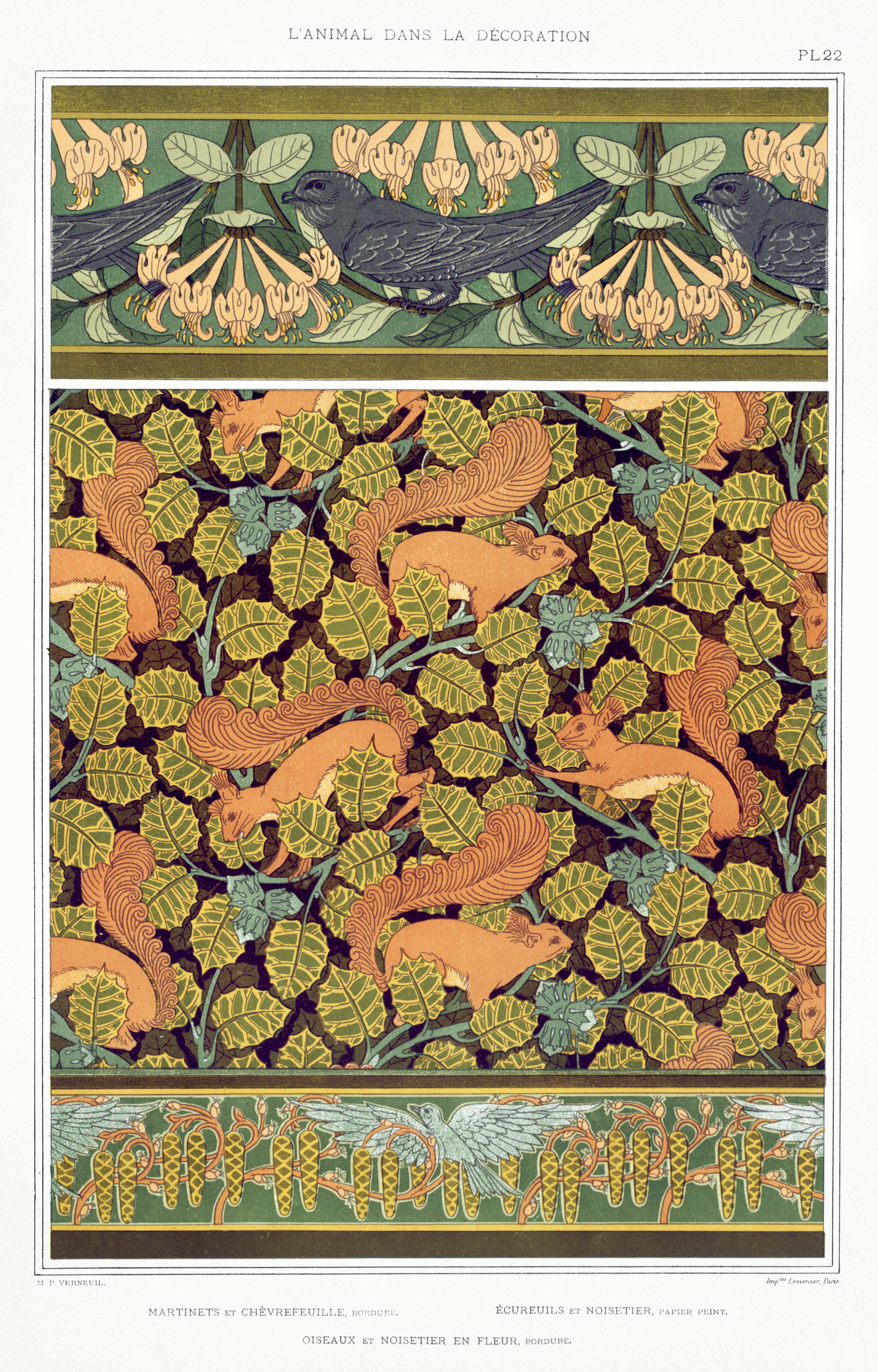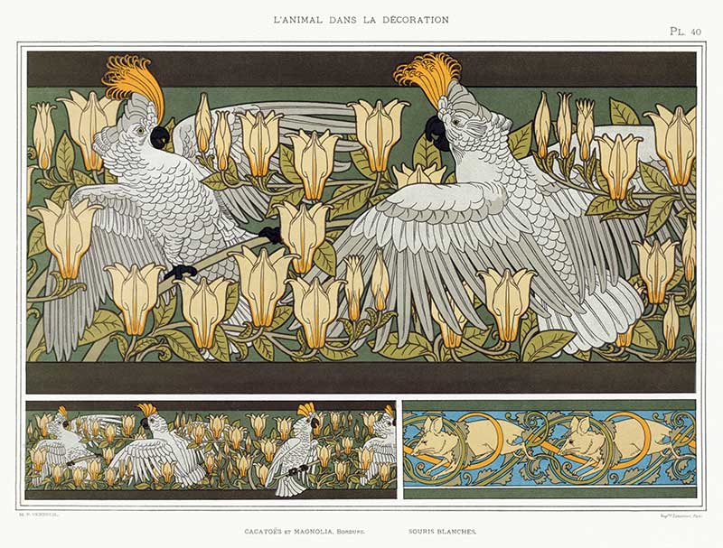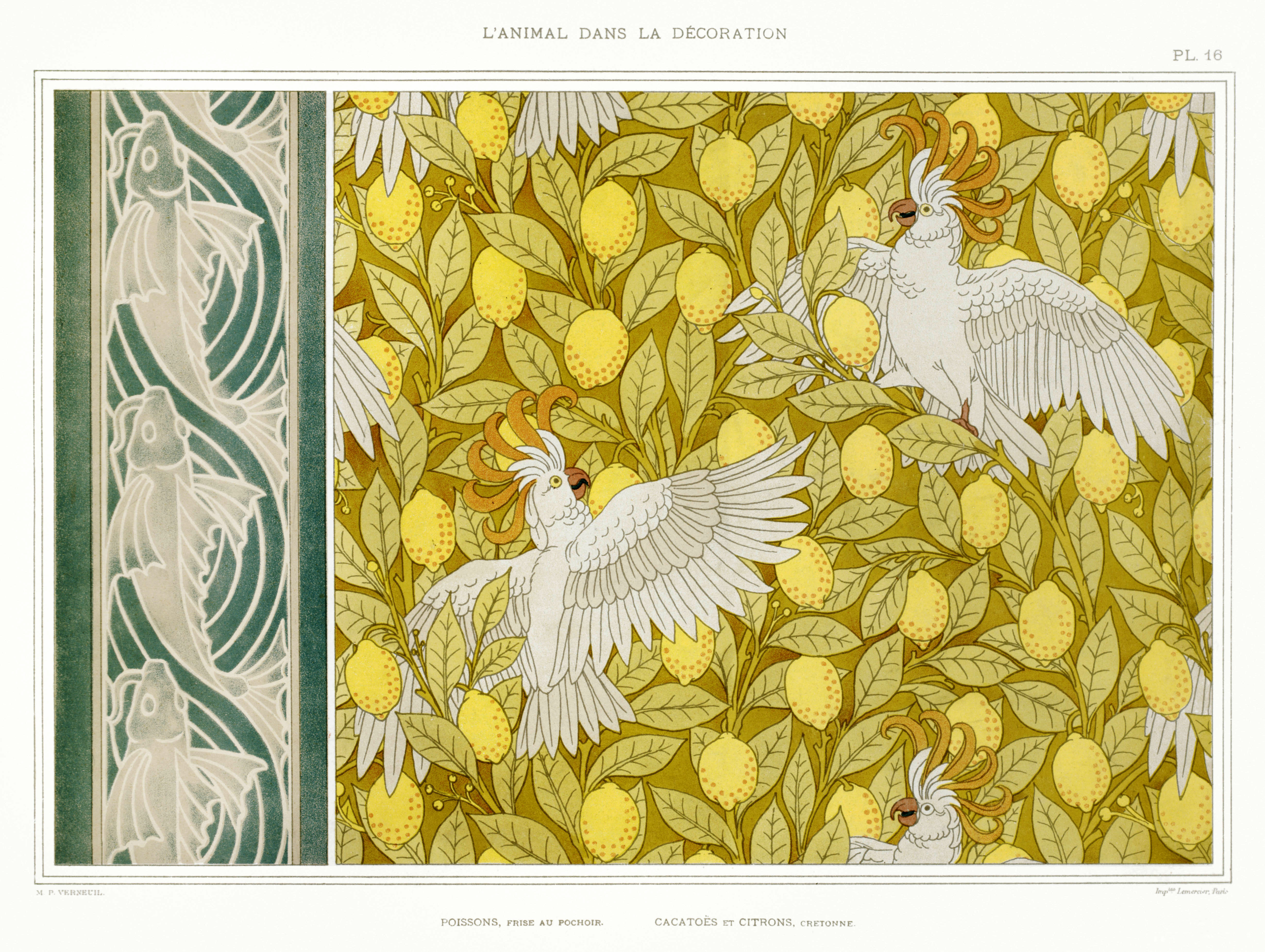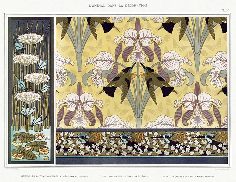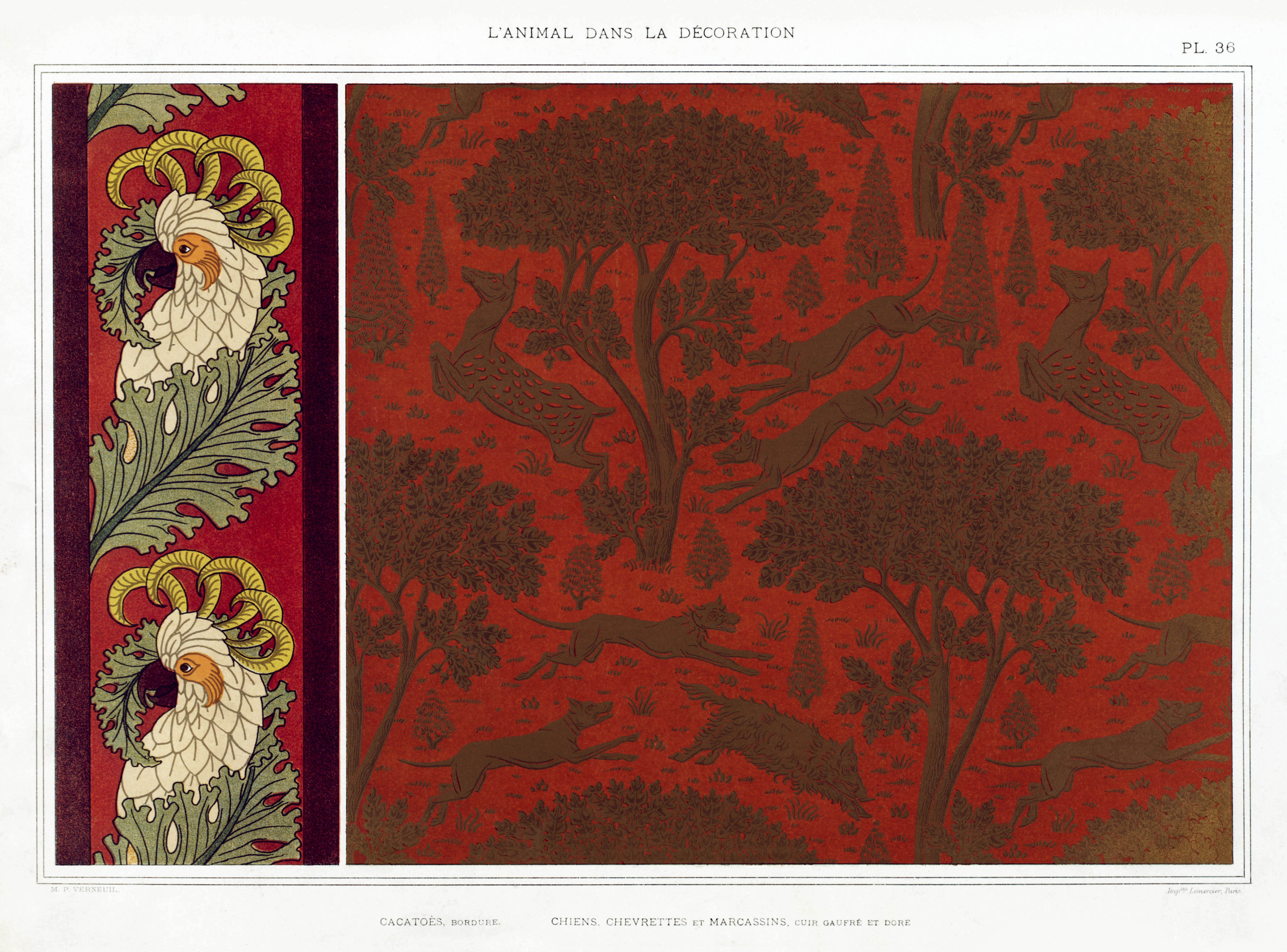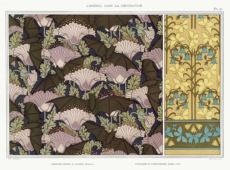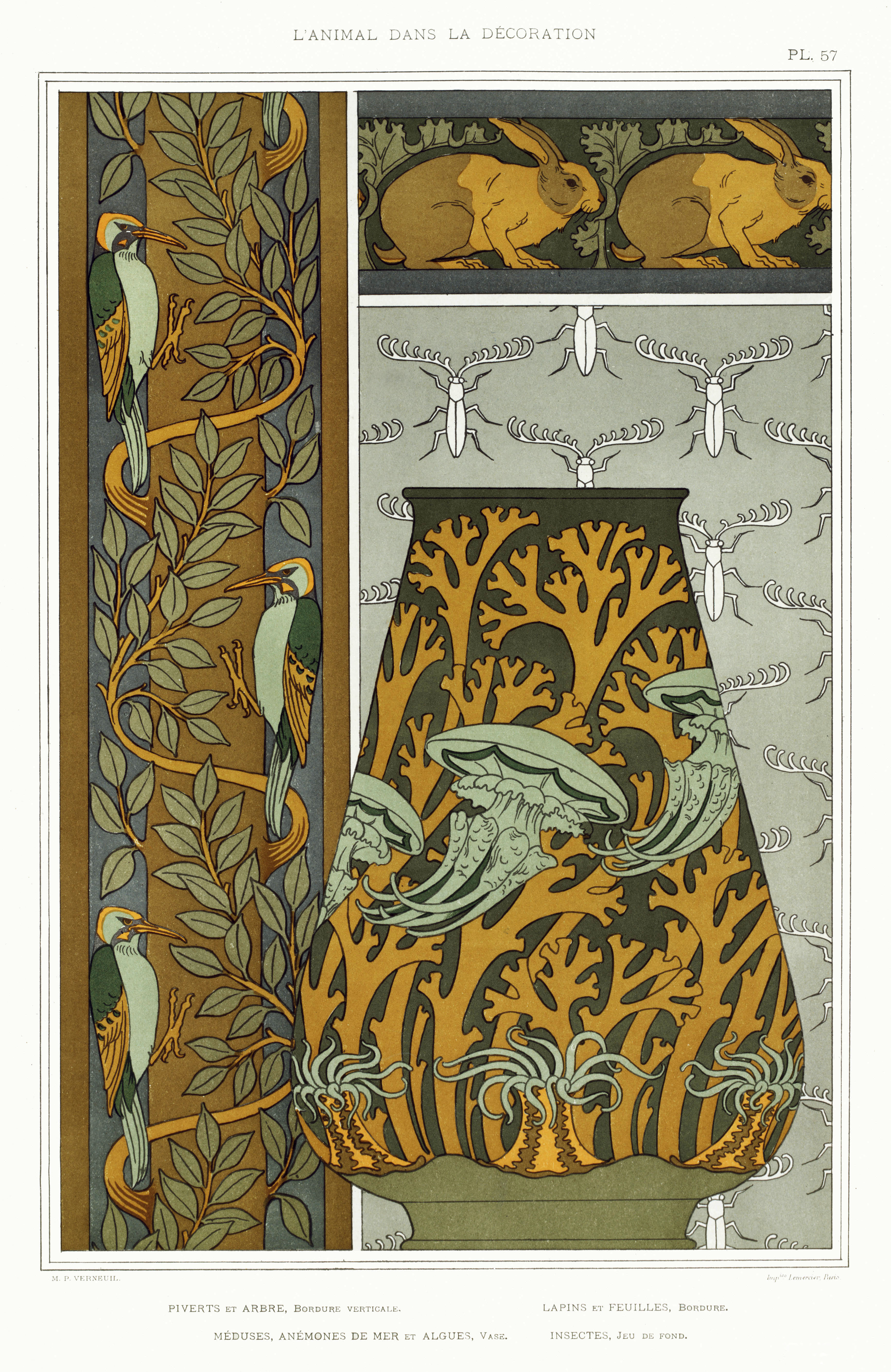 The collection here is the Maurice Pillard Verneuil designs and patterns inspired by the animal kingdom. These art nouveau prints celebrate the wide variety of designs in nature. They are heavily influenced by plant and animal forms such as birds, fish, insects, flowers, trees and other living creatures.