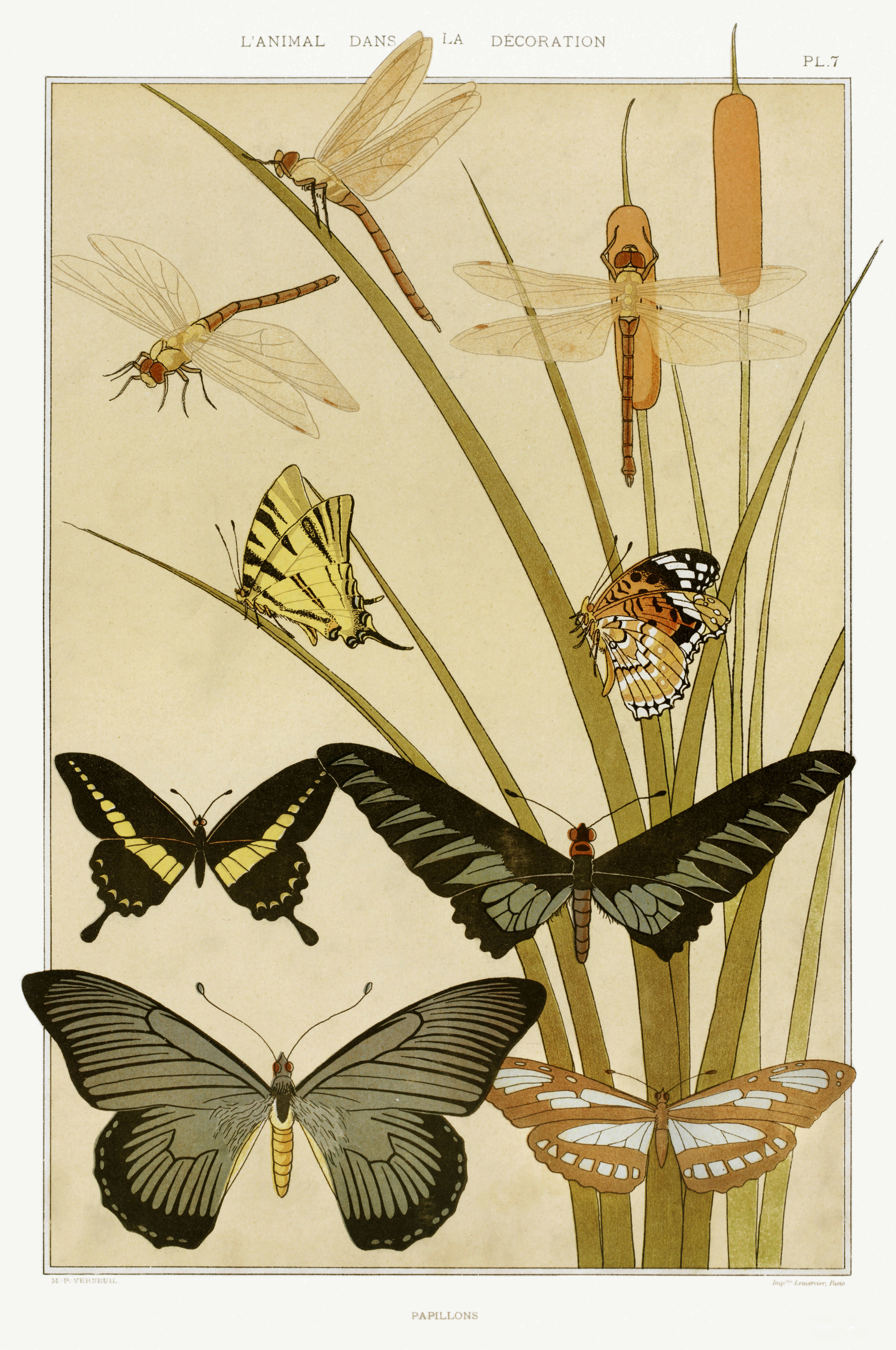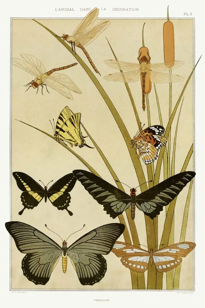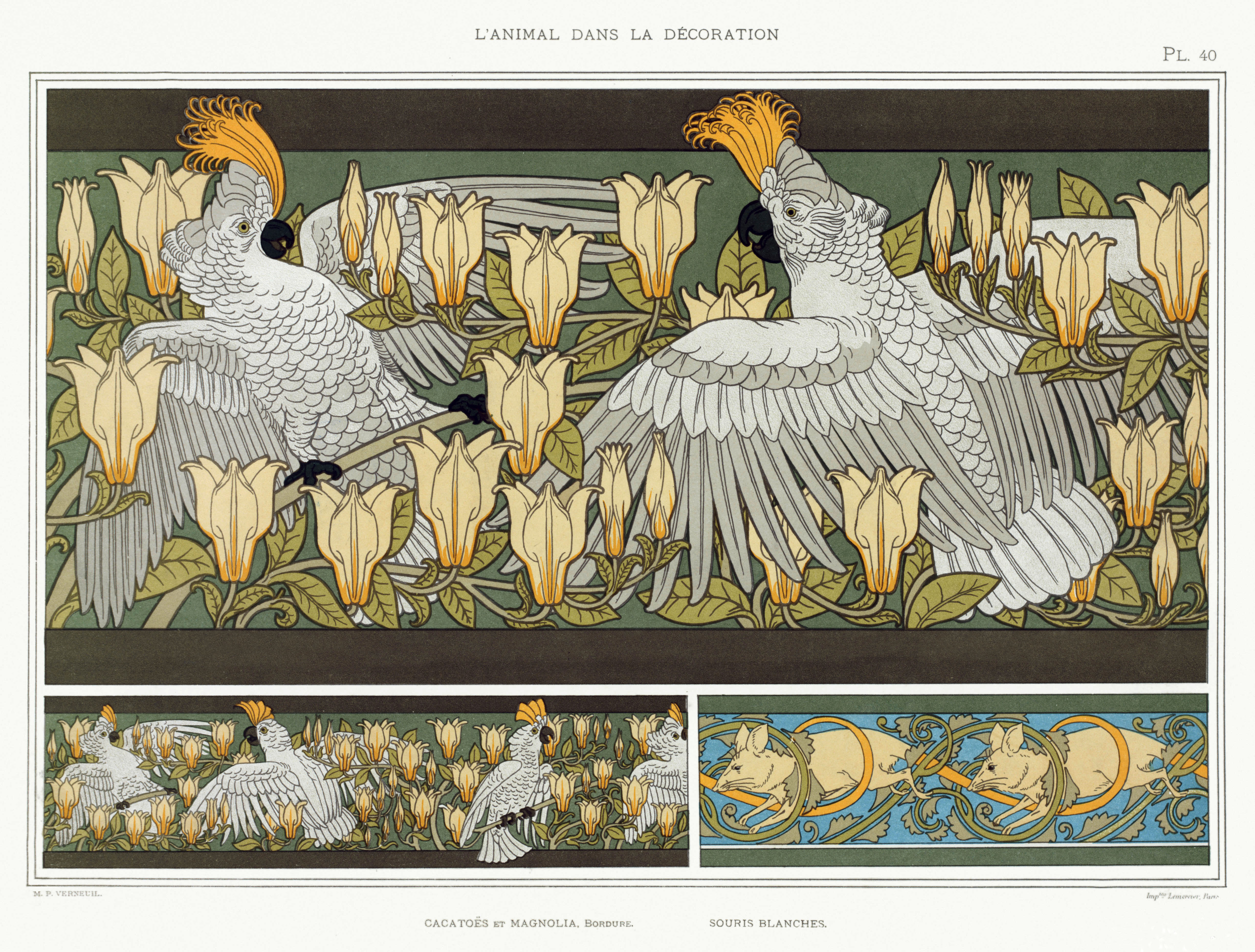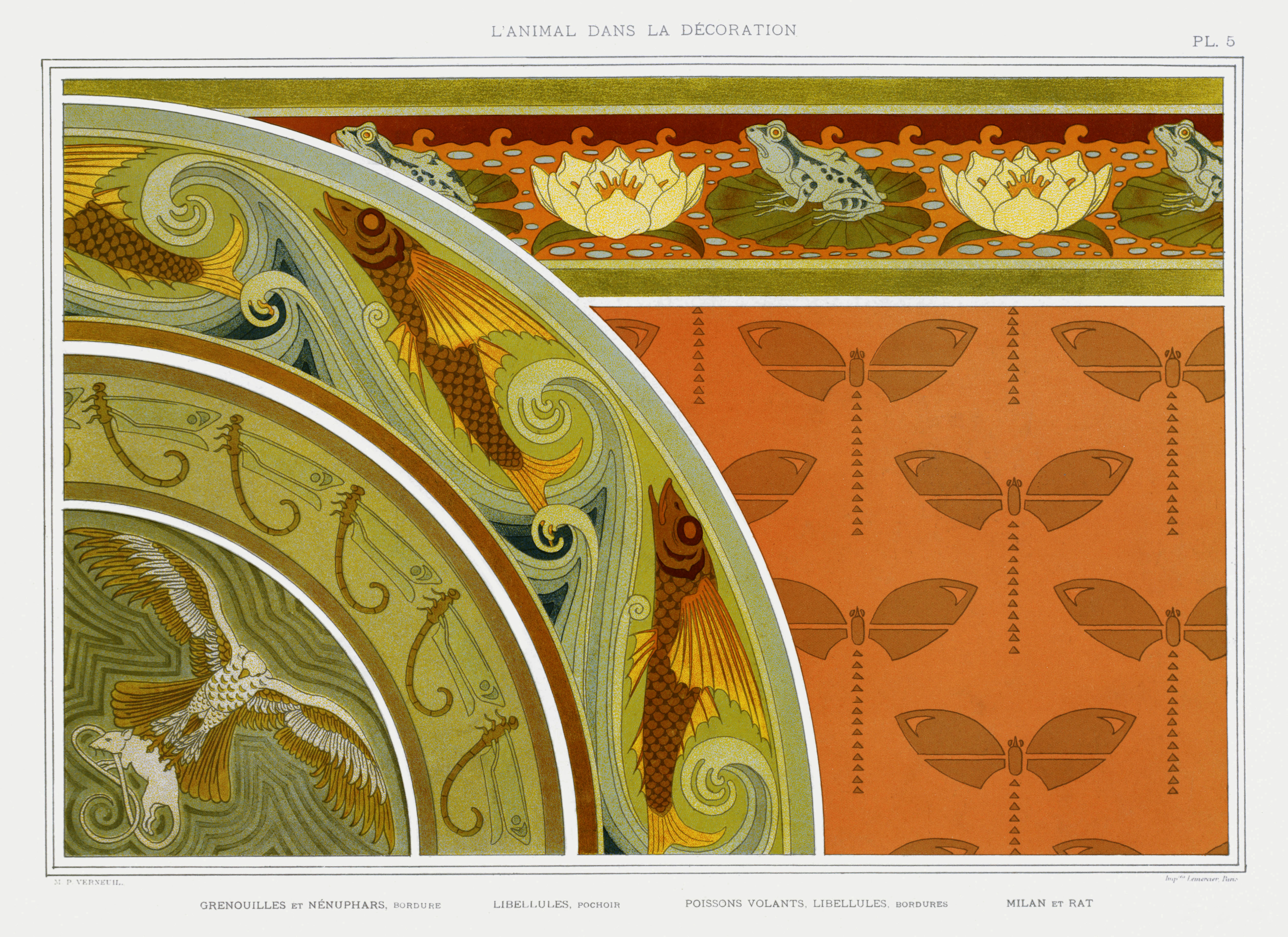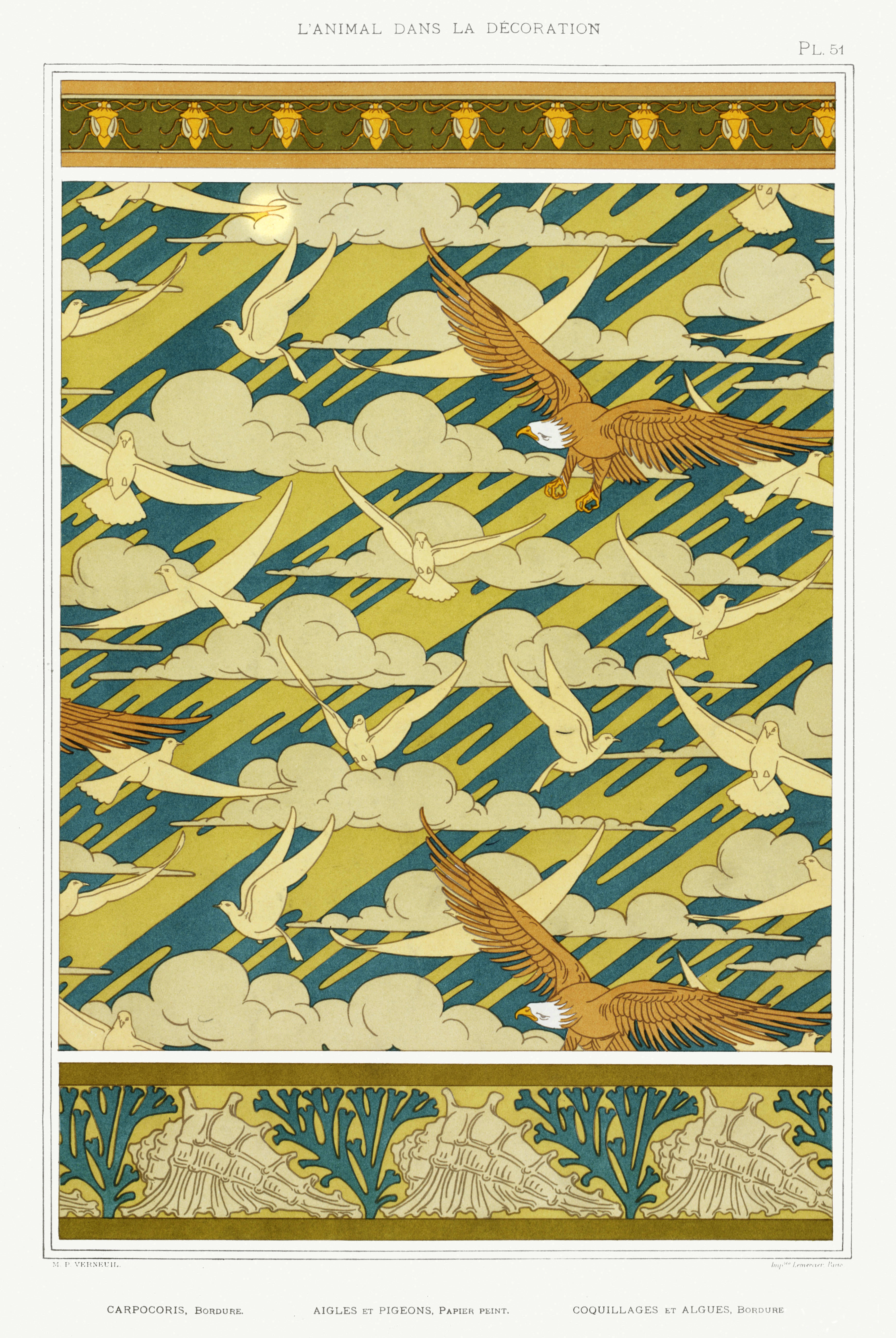 The collection here is the Maurice Pillard Verneuil designs and patterns inspired by the animal kingdom. These art nouveau prints celebrate the wide variety of designs in nature. They are heavily influenced by plant and animal forms such as birds, fish, insects, flowers, trees and other living creatures.