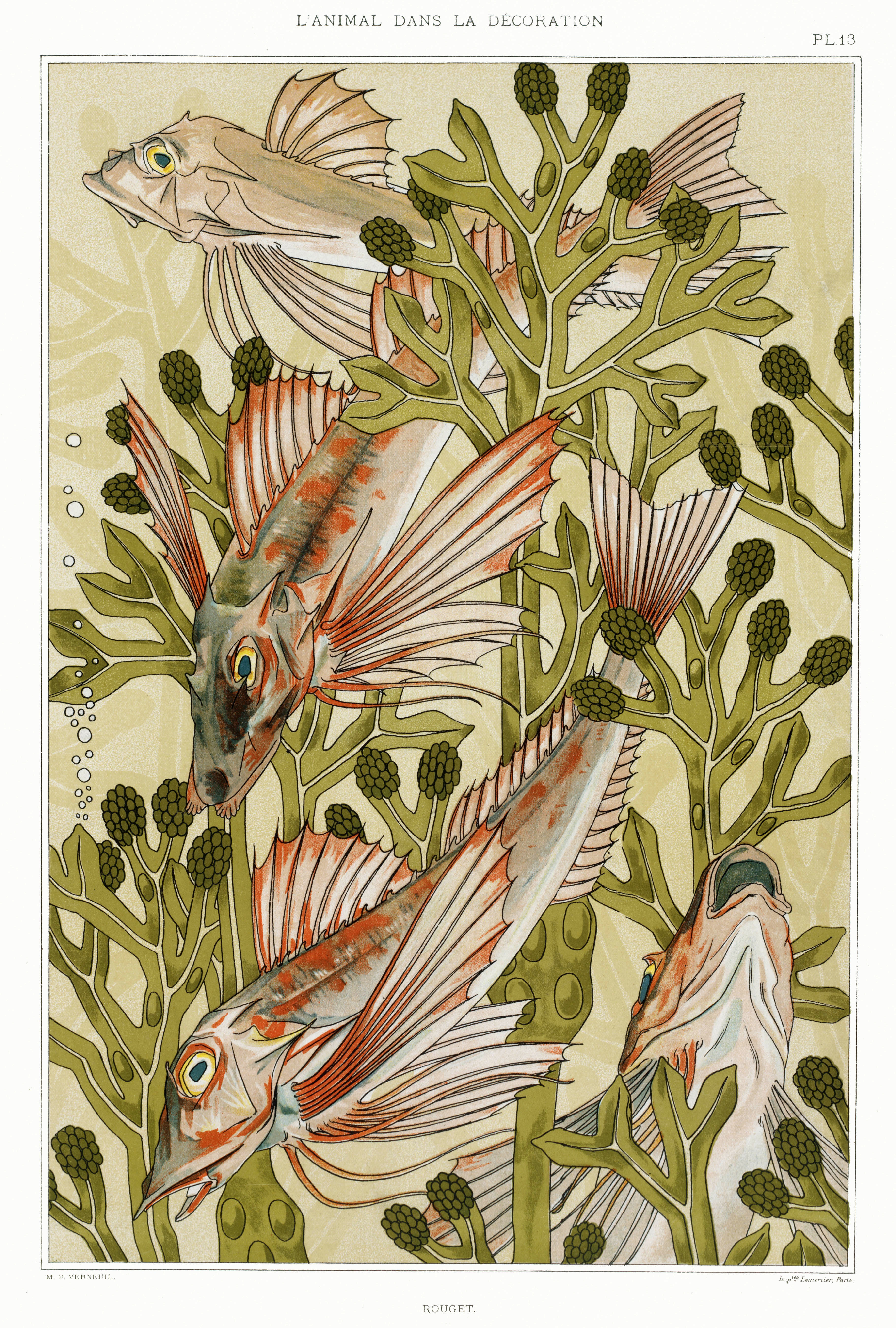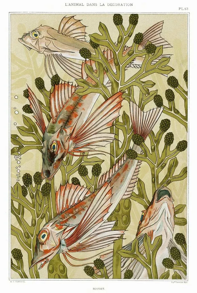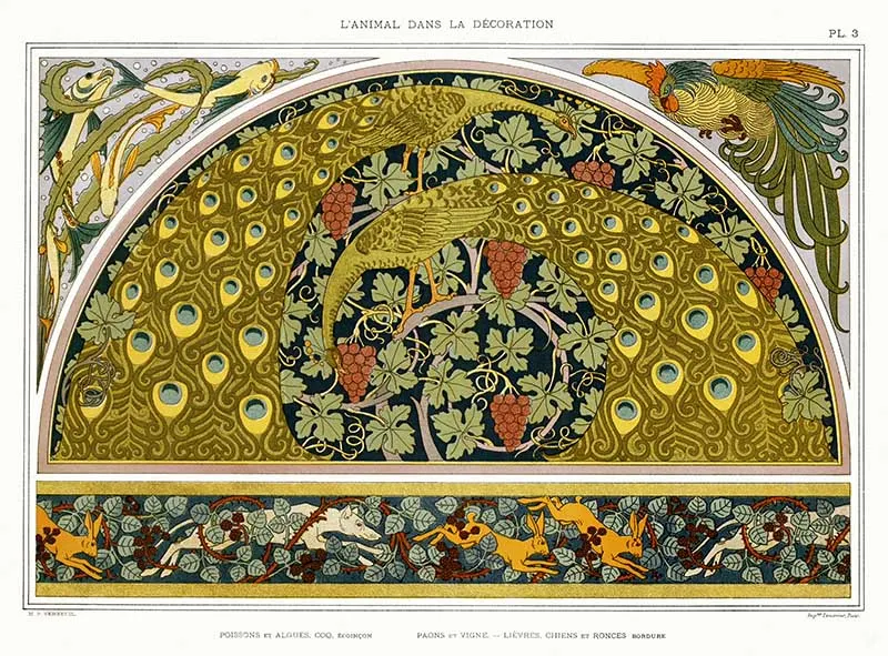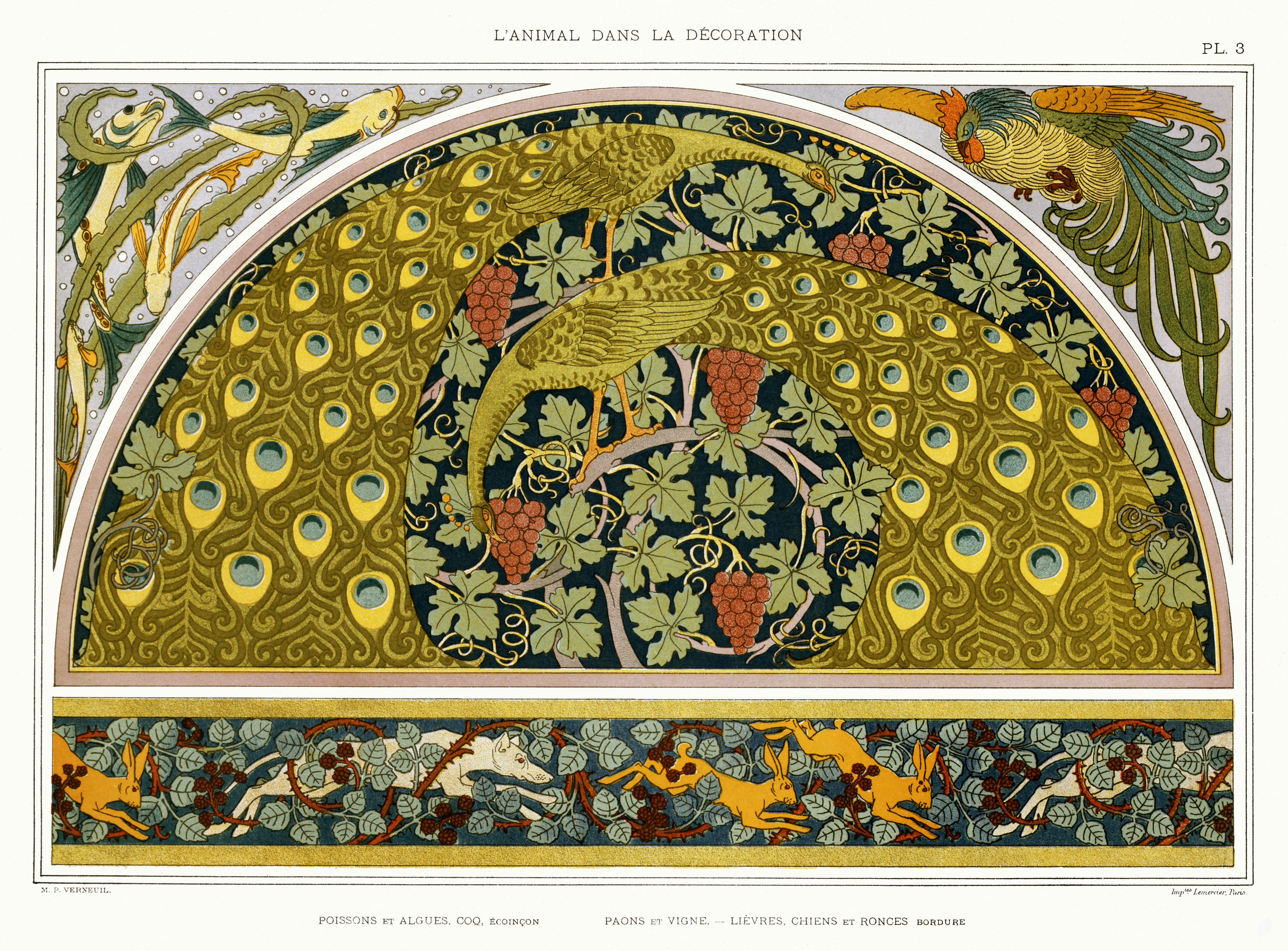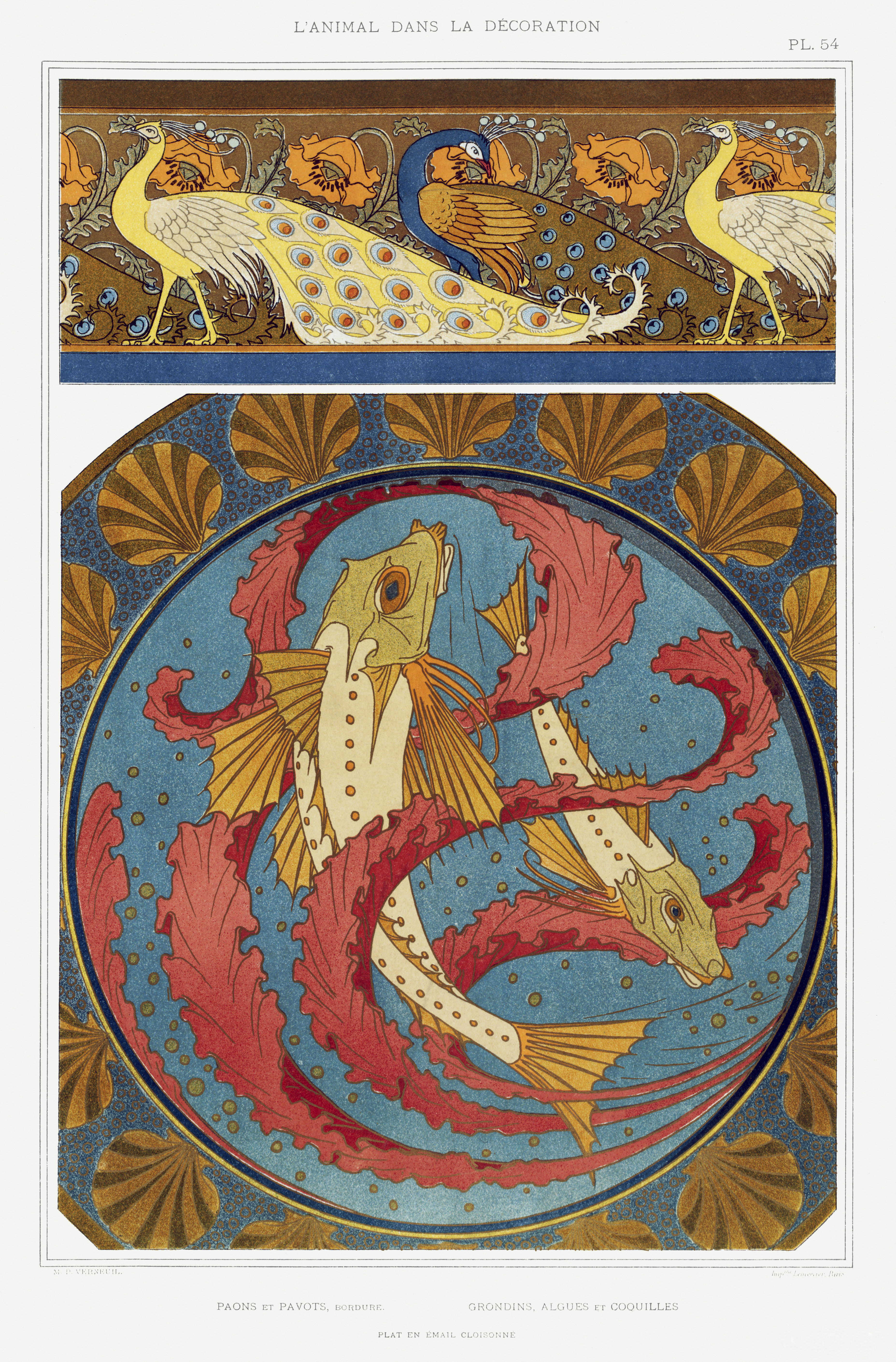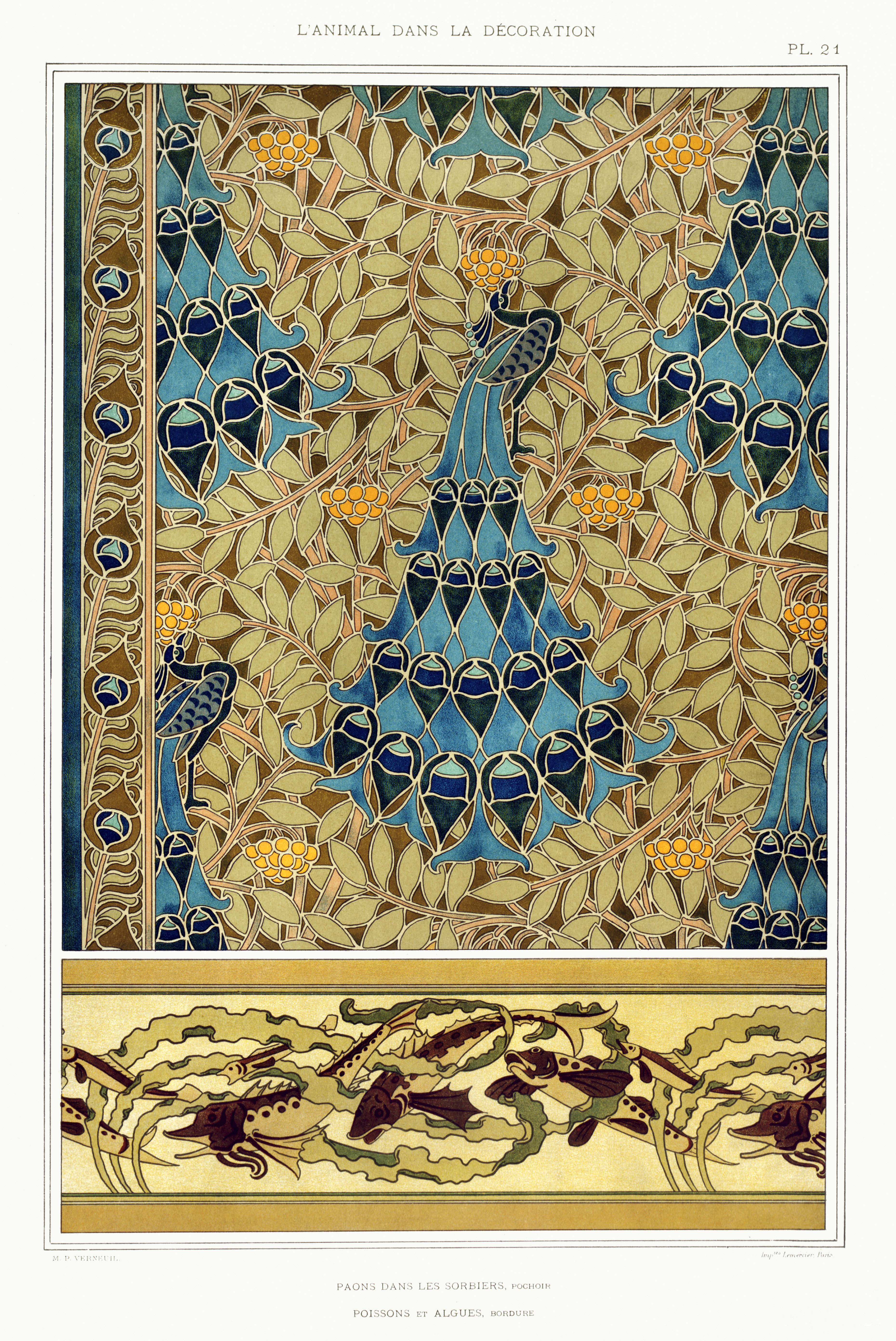 Peacocks in rowan trees, stencil; fish and seaweed, border from L’ animal dans la Décoration (1897) illustrated by Maurice Pillard Verneuil.
