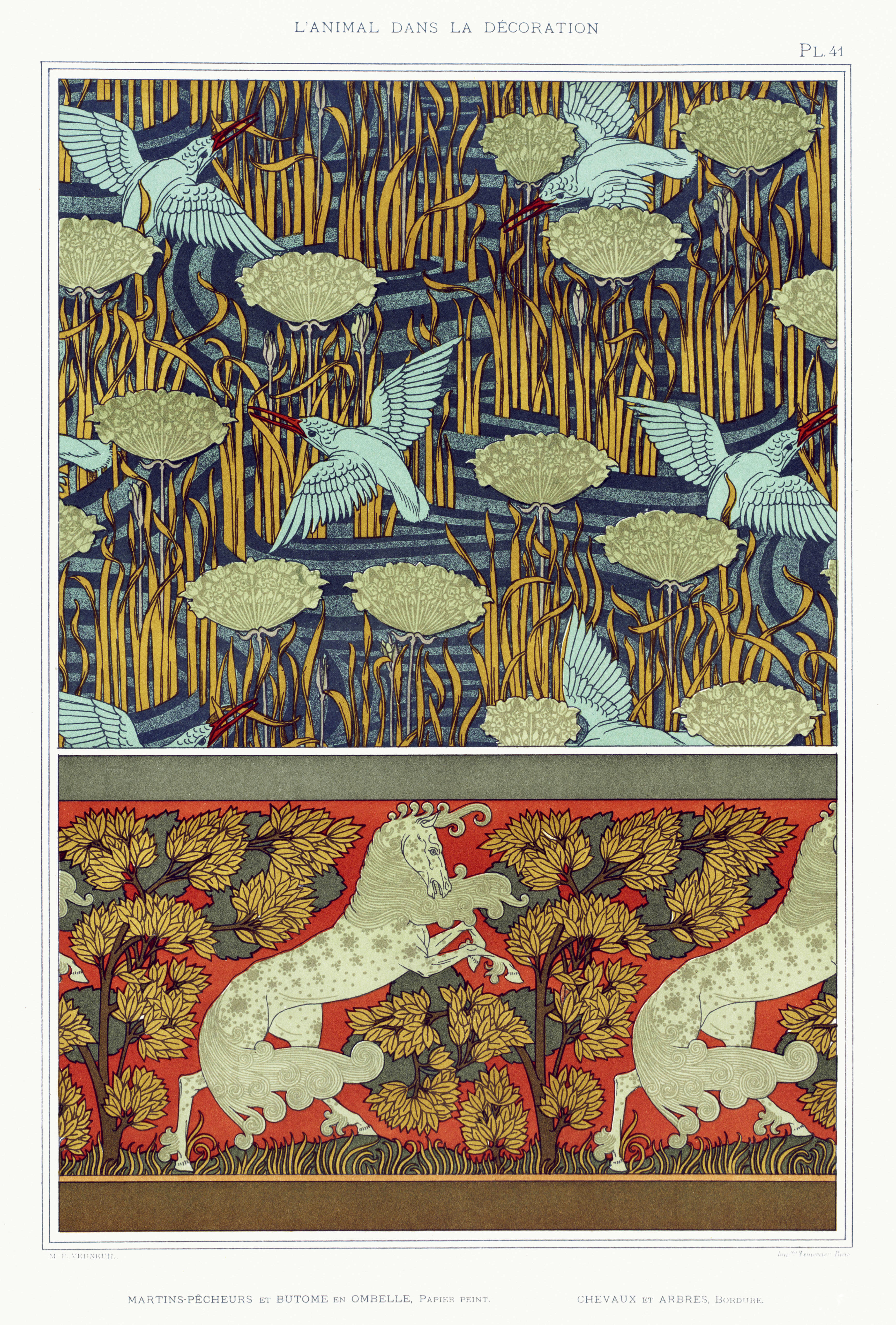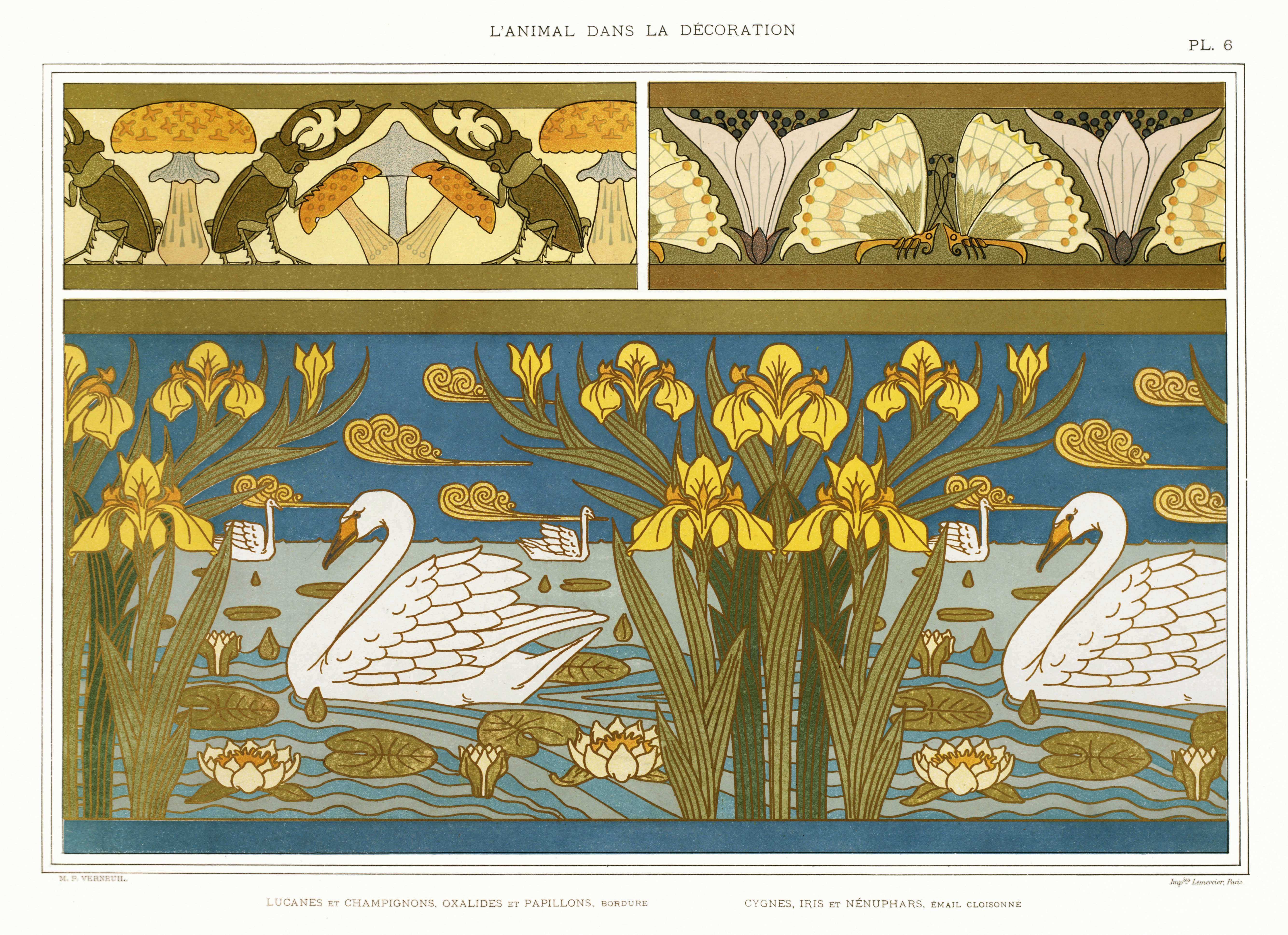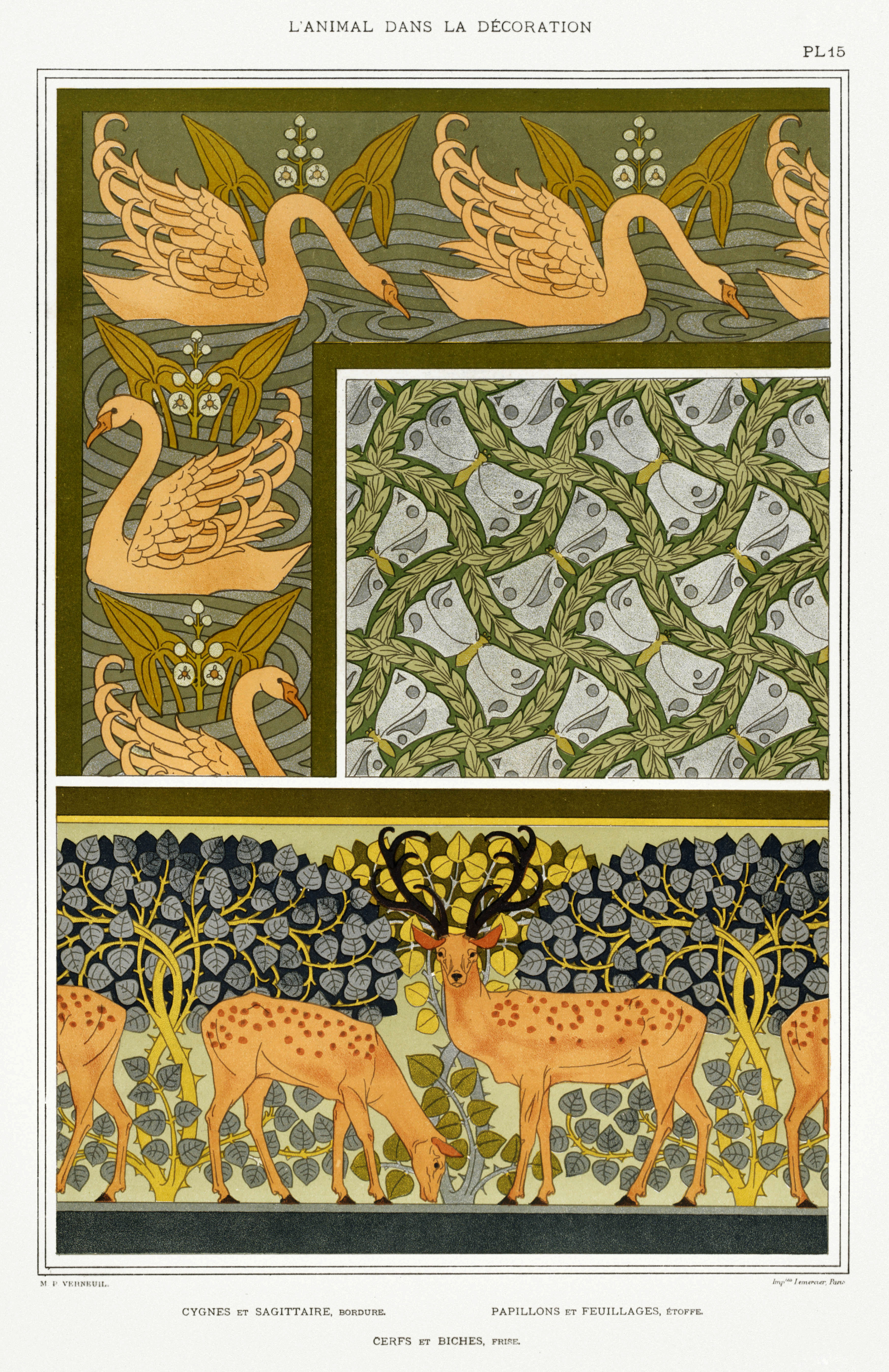 Swans border. Butterflies and foliage, fabric. Deer and hinds, frieze from L’animal dans la Décoration (1897) illustrated by Maurice Pillard Verneuil.