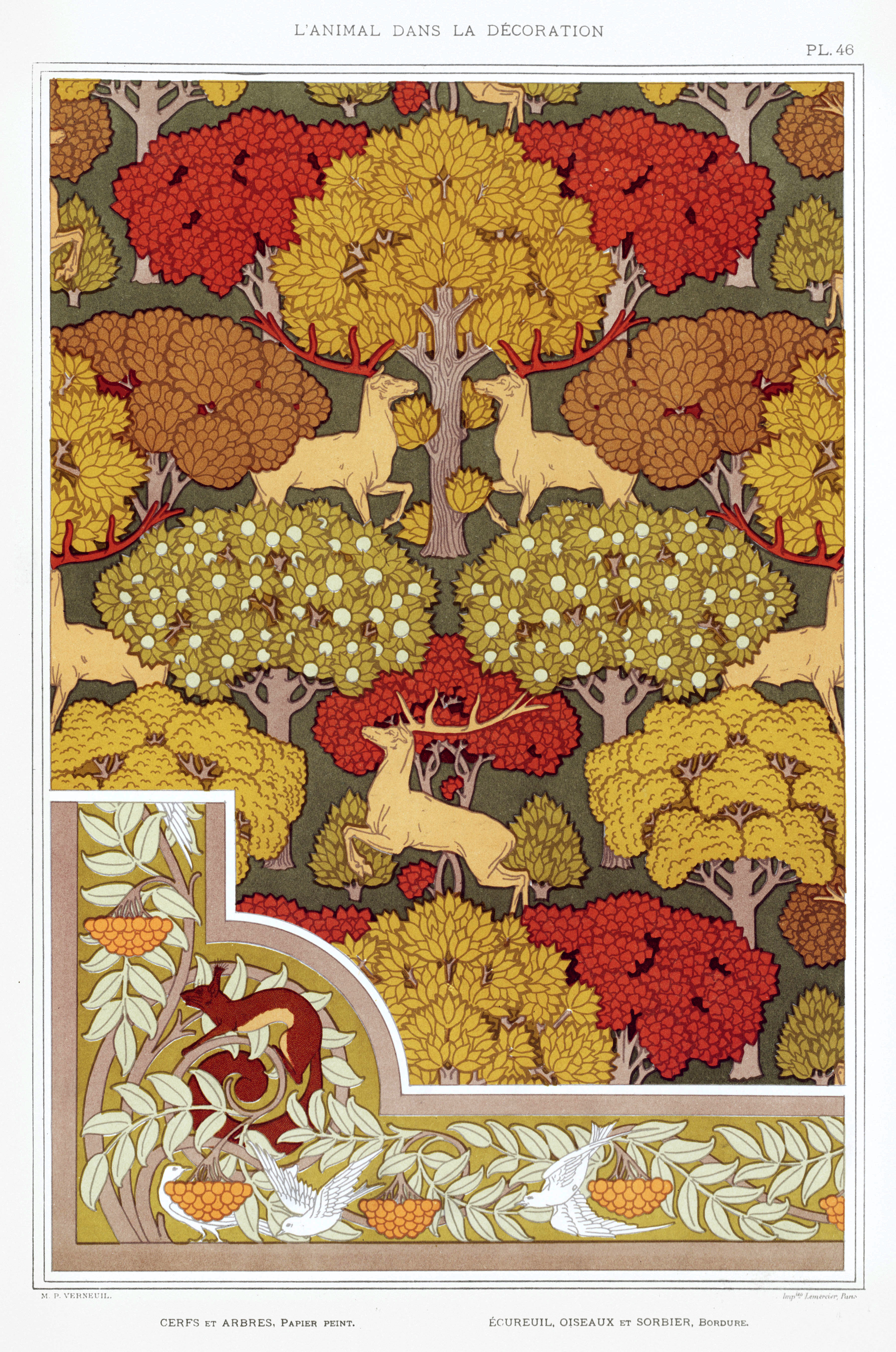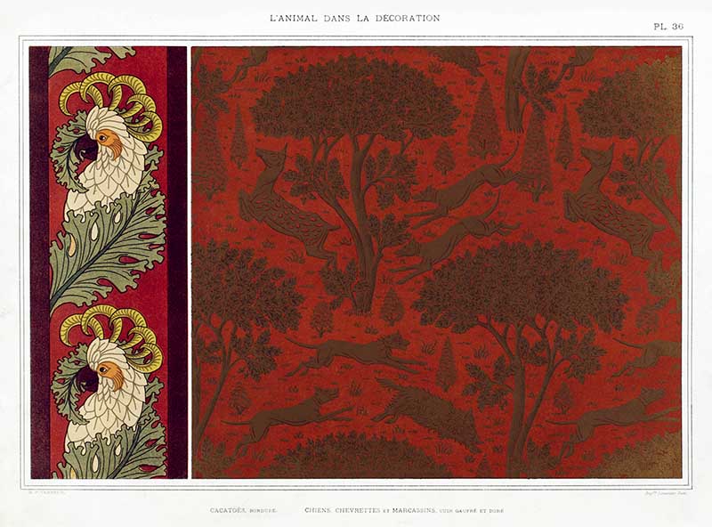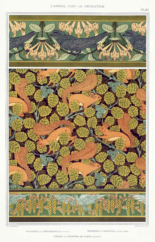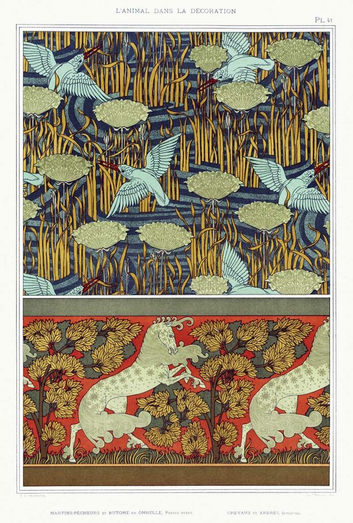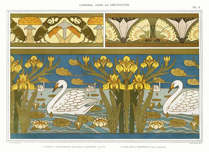 Swans border. Butterflies and foliage, fabric. Deer and hinds, frieze from L’animal dans la Décoration (1897) illustrated by Maurice Pillard Verneuil.