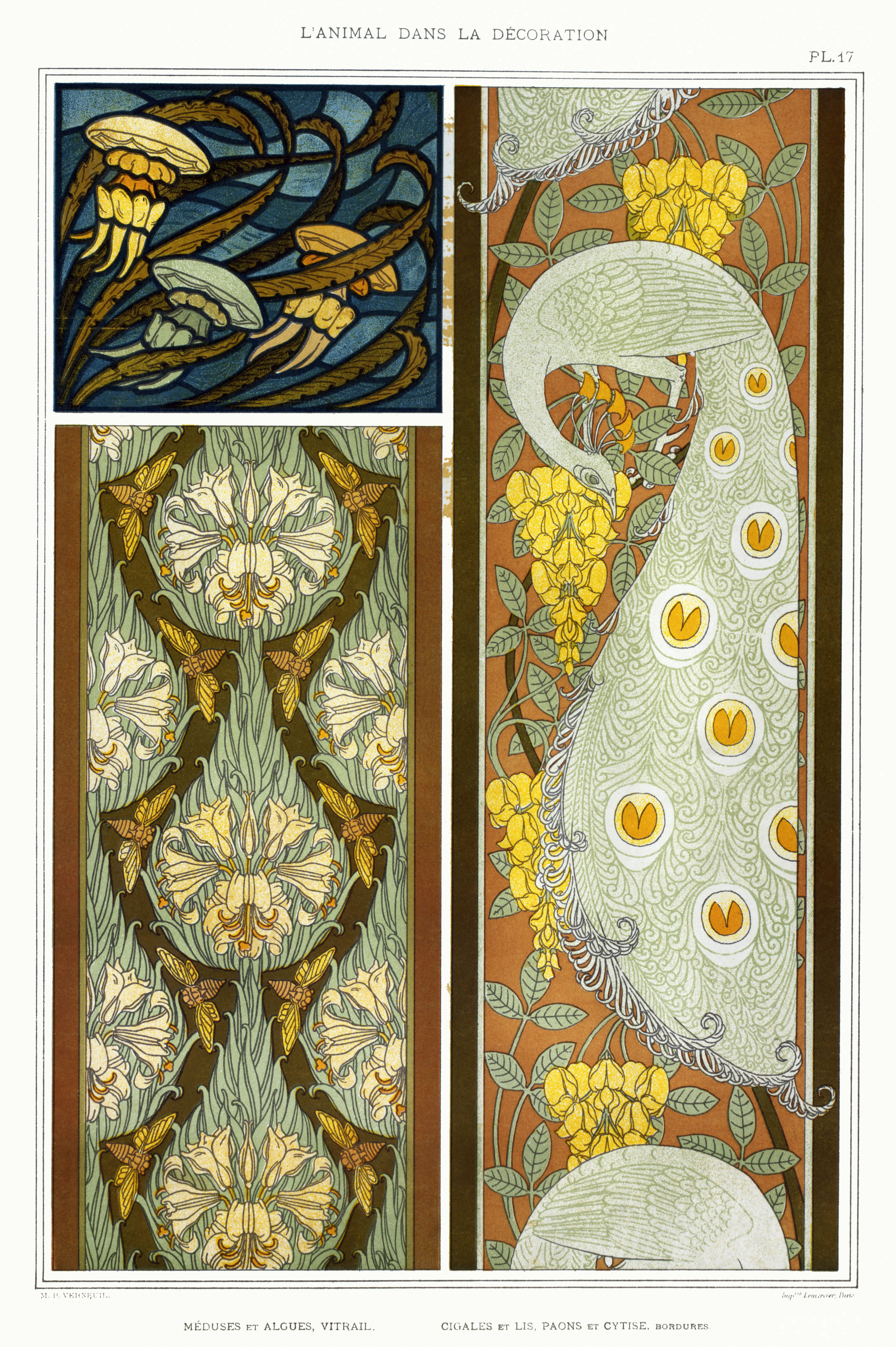An art nouveau animal design of jellyfish and seaweed, stained glass. Cicadas and lilies, peacocks and laburnum, borders.