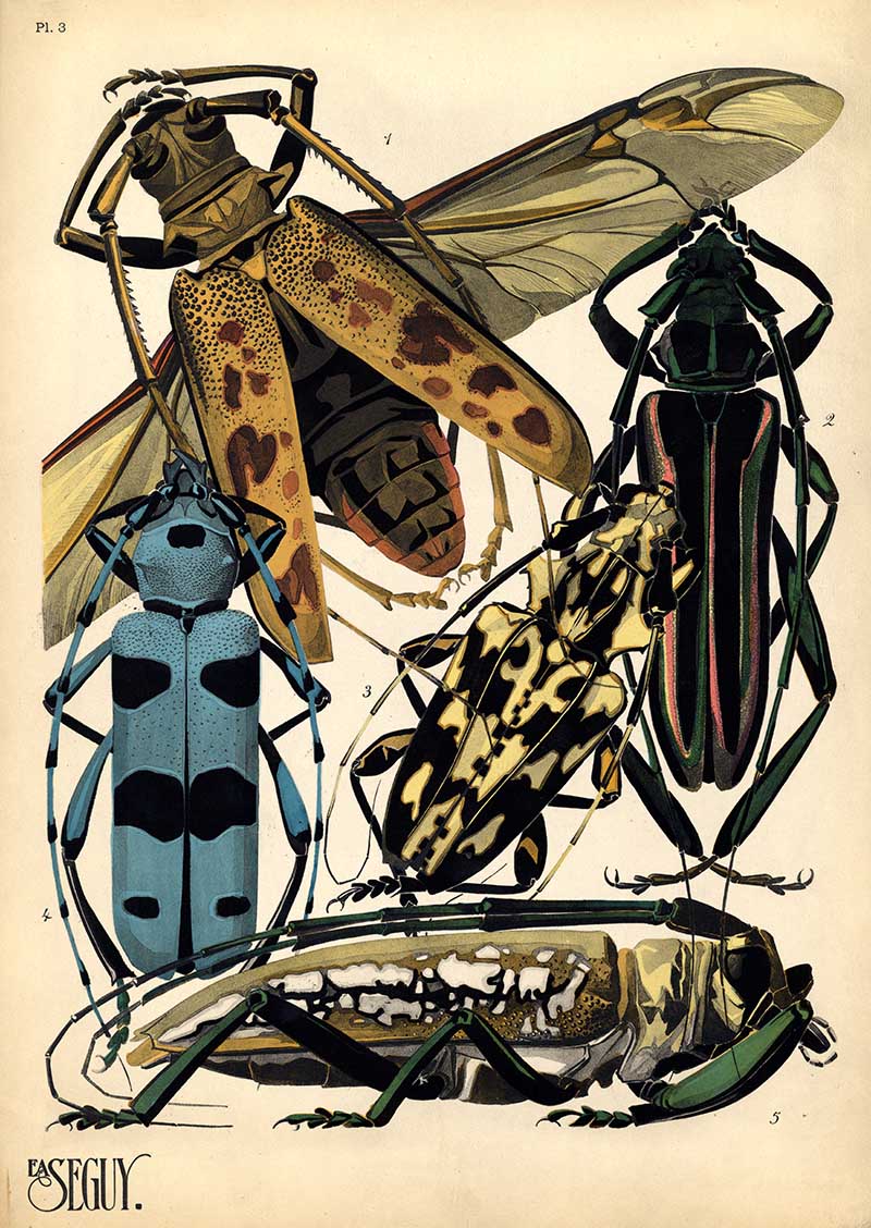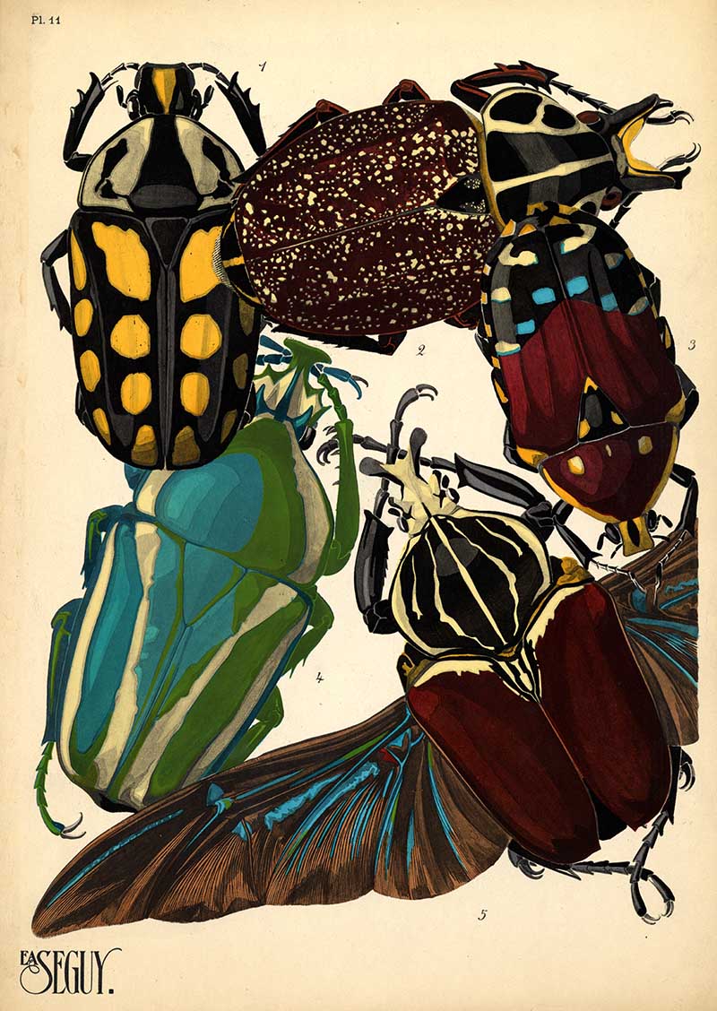 Seguy’s other insect pochoir prints include the designs featured here of beetles, dragonflies, and other winged insects. Like his butterfly designs, these prints are highly stylized, with abstracted forms and bold graphic patterns.