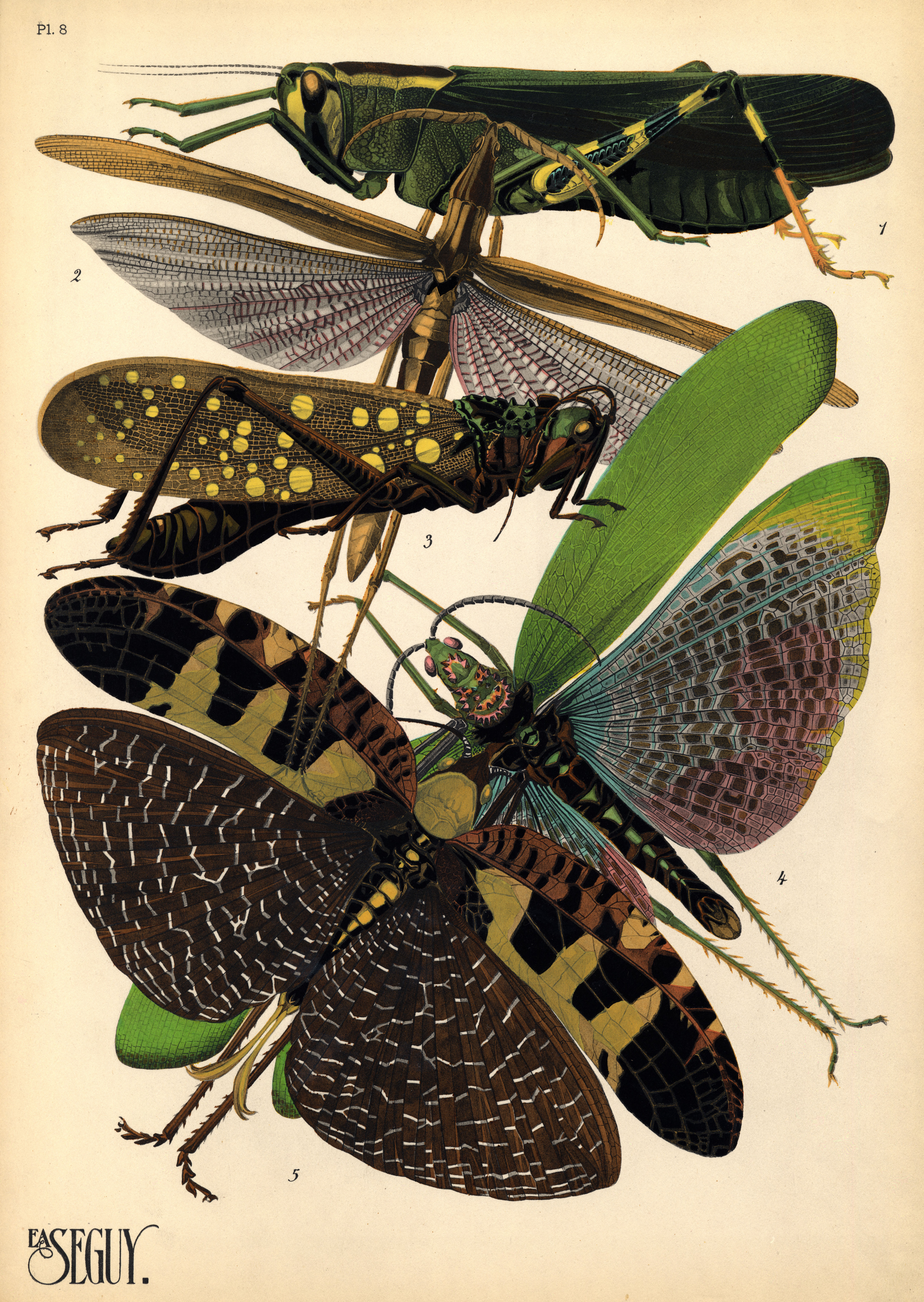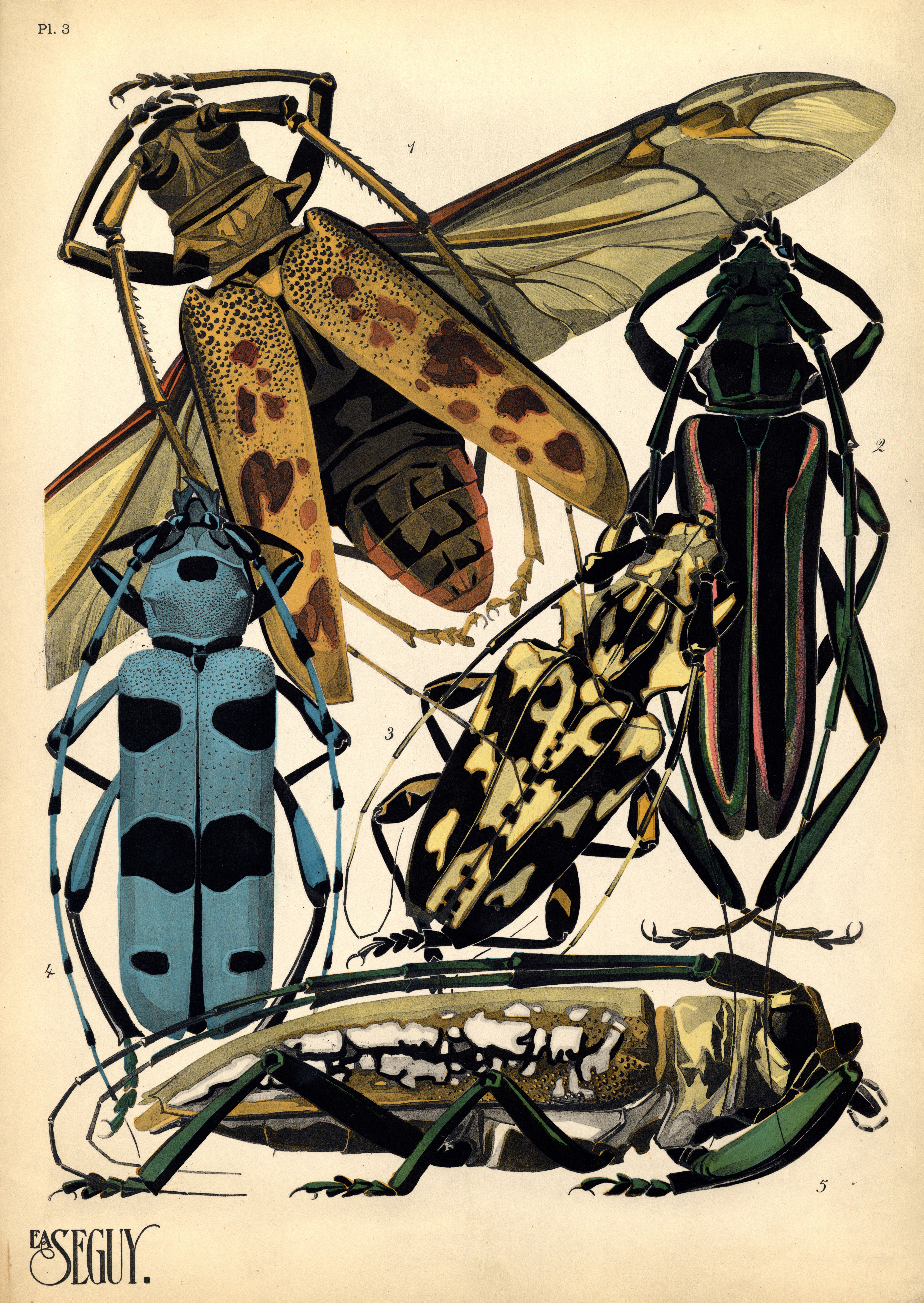 Click on the title above the insect print you want to download. A high-resolution illustration will open in a new window, where you can save or print it. Seguy’s pochoir insect prints are in the Public Domain and thus copyright-free.