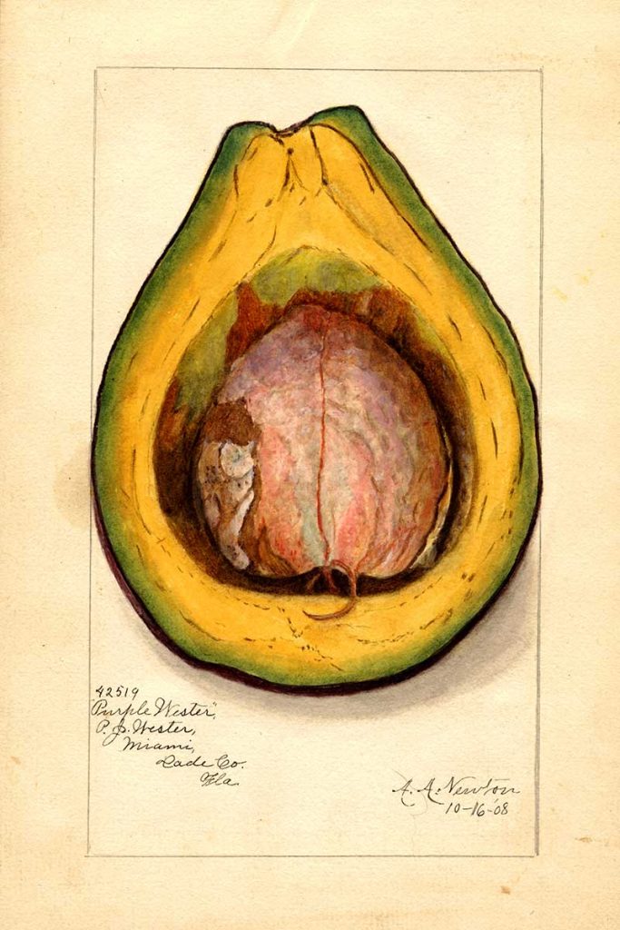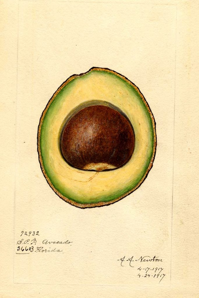 McDonald variety of avocados, with this specimen originating in Florida and painted by Amanda Almira Newton in 1917. The cross-section of this variety it below.