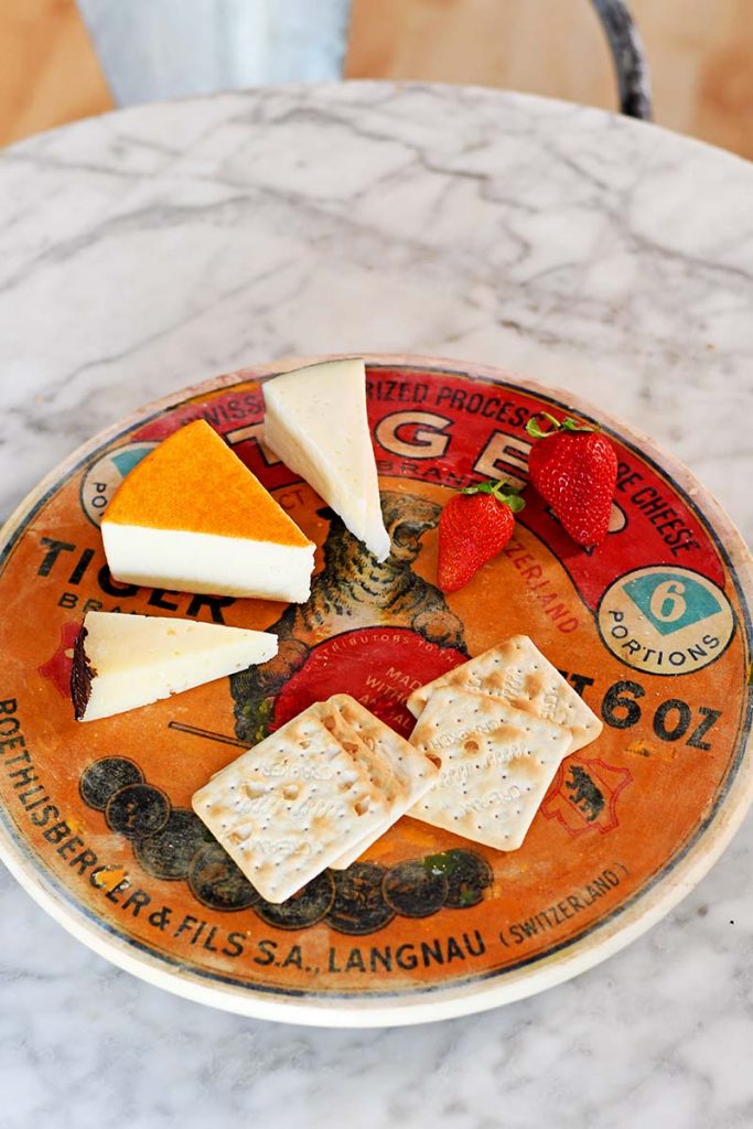 Inside: A tutorial on how to print on wood to upcycle a lazy susan with vintage cheese labels. The post includes free vintage cheese label printables.