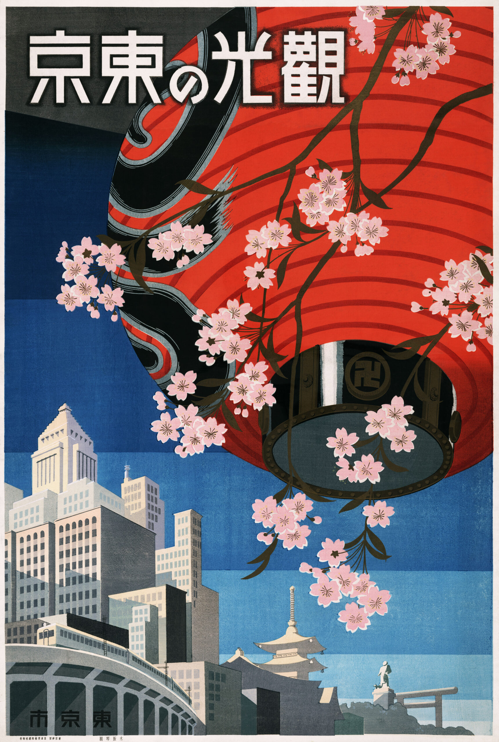 A 1930s travel poster with some Cherry blossom illustration. There are more free vintage Japanese travel posters here.