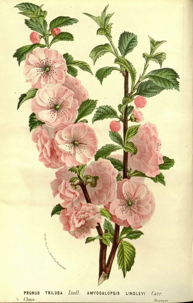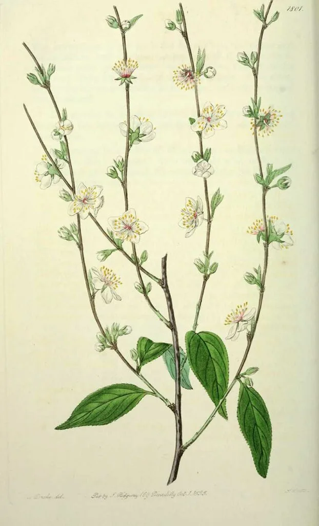 A drawing of Prunus japonica more commonly known as the Japanese Bush Cherry. The illustration is from “Edwards’ botanical register, or, Ornamental flower-garden and shrubbery”.