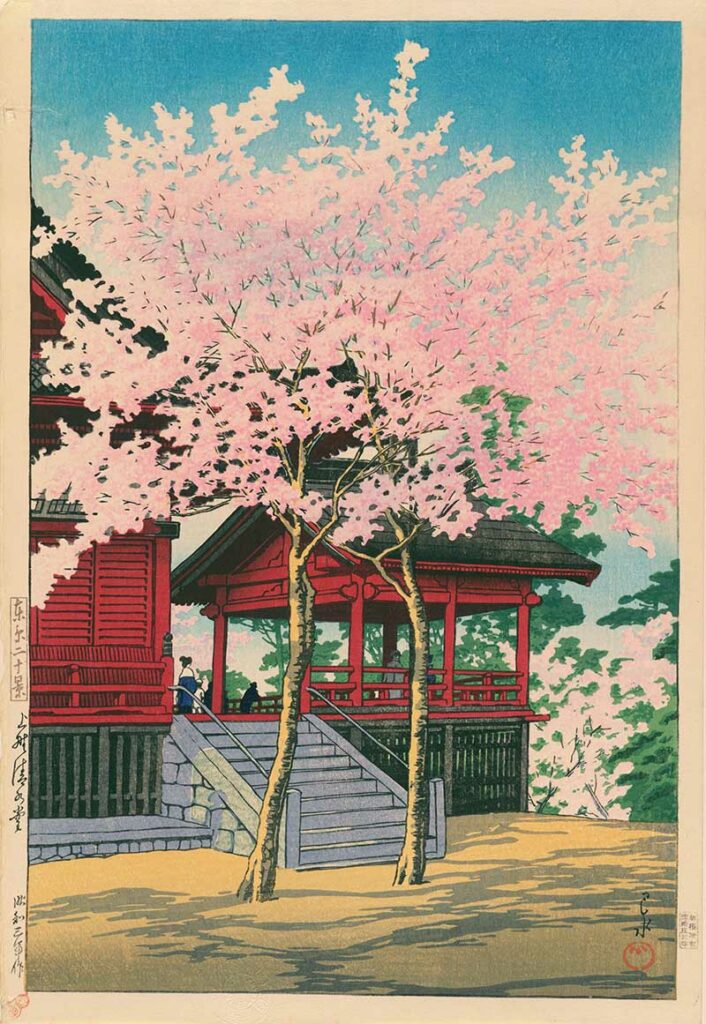 A woodblock print of cherry blossom by Hasui Kawase as of Kiyomizu-dō Temple in Ueno, from the series Twenty Views of Tōkyō.