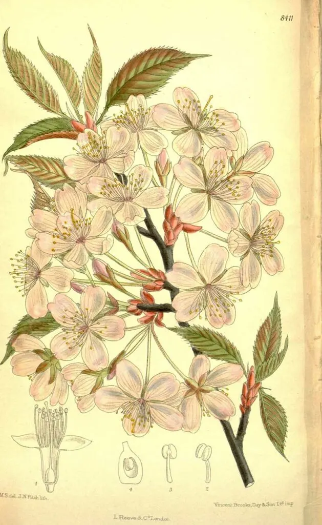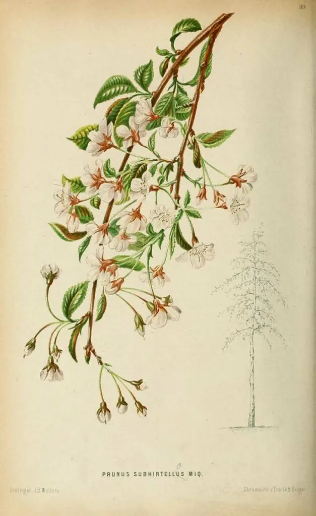 Winter flowering cherry blossom from 2Neerland’s_Plantentuin”, 1867. A wild species of cherry trees native to Japan.