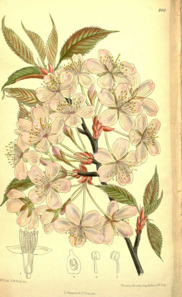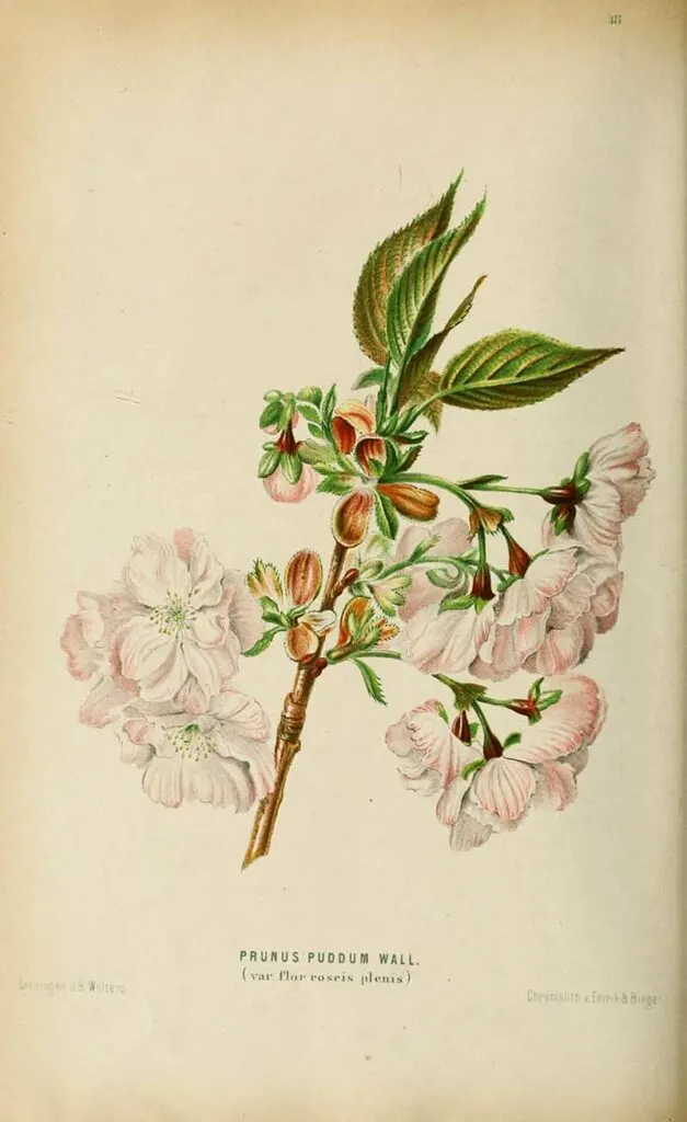 A cherry blossom painting of Prunus Puddum (wild Himalayan Cherry) from the book “Neerland’s Plantentuin“, (1867).
