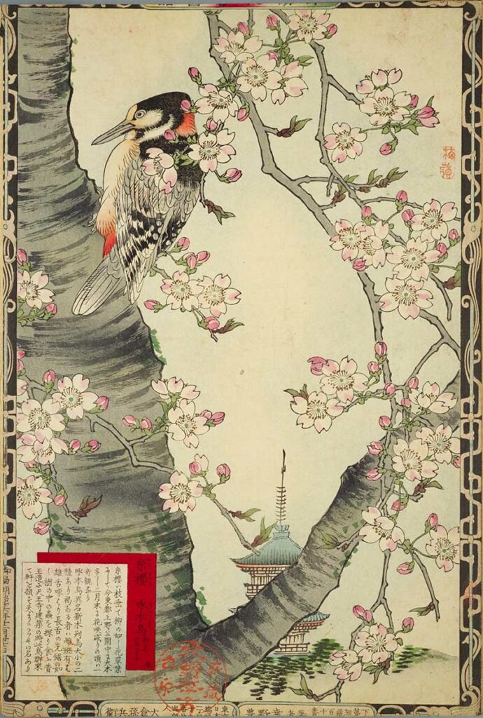 A Japanese woodblock print of a woodpecker and drooping cherry blossom by the artist Kono Bairei, 1883. The painting is from his well-known album of paired bird and flower paintings.