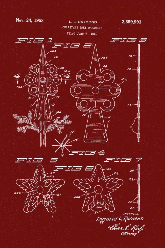 As a child, I used to love to take things apart to see how they were made.  That is probably why I’m fascinated with patent art.  Google has a great search engine where you can search for original patents.  As it’s coming near Christmas, I thought it would be cool to curate a collection of patents related to Christmas inventions.
