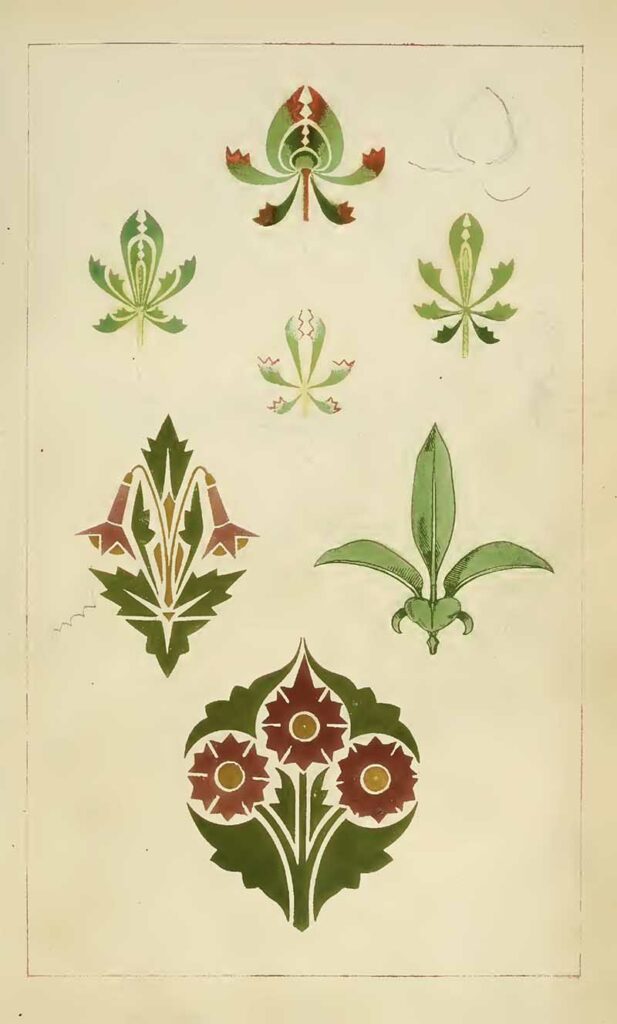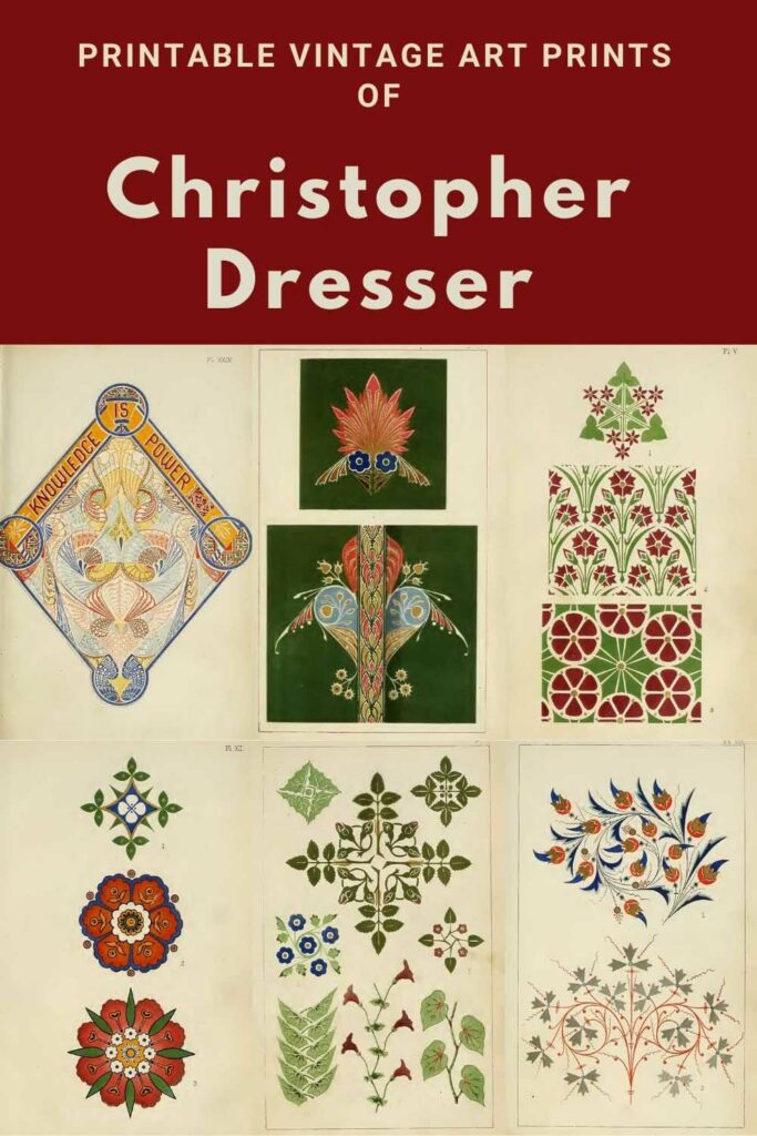 Two collections of Christopher Dresser design prints are featured here: one from an antique textbook on decorative design art and the other from a vibrant selection of design drawings from the Metropolitan Museum.