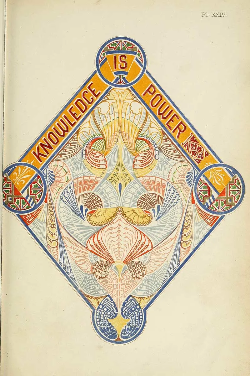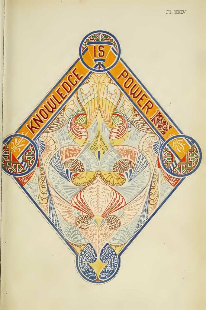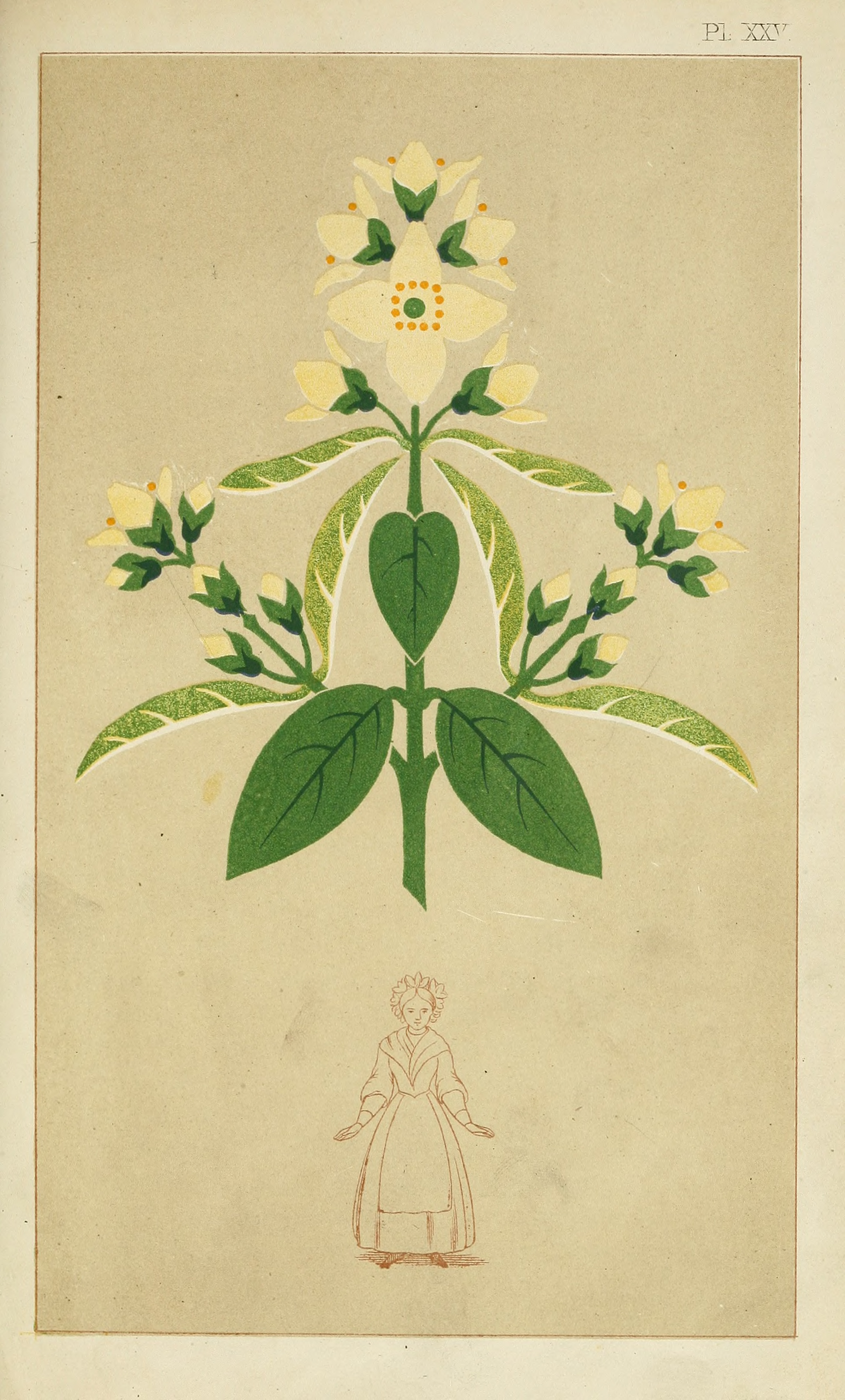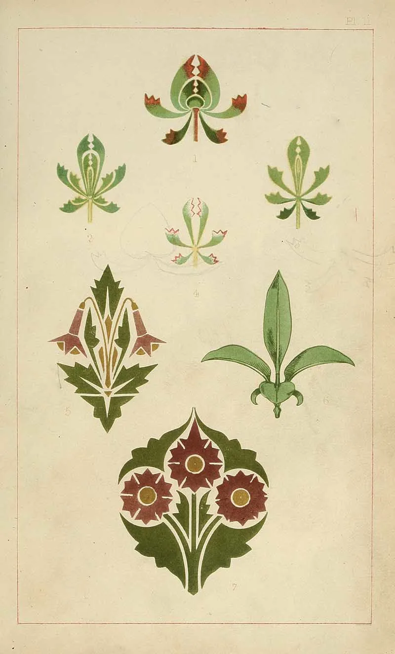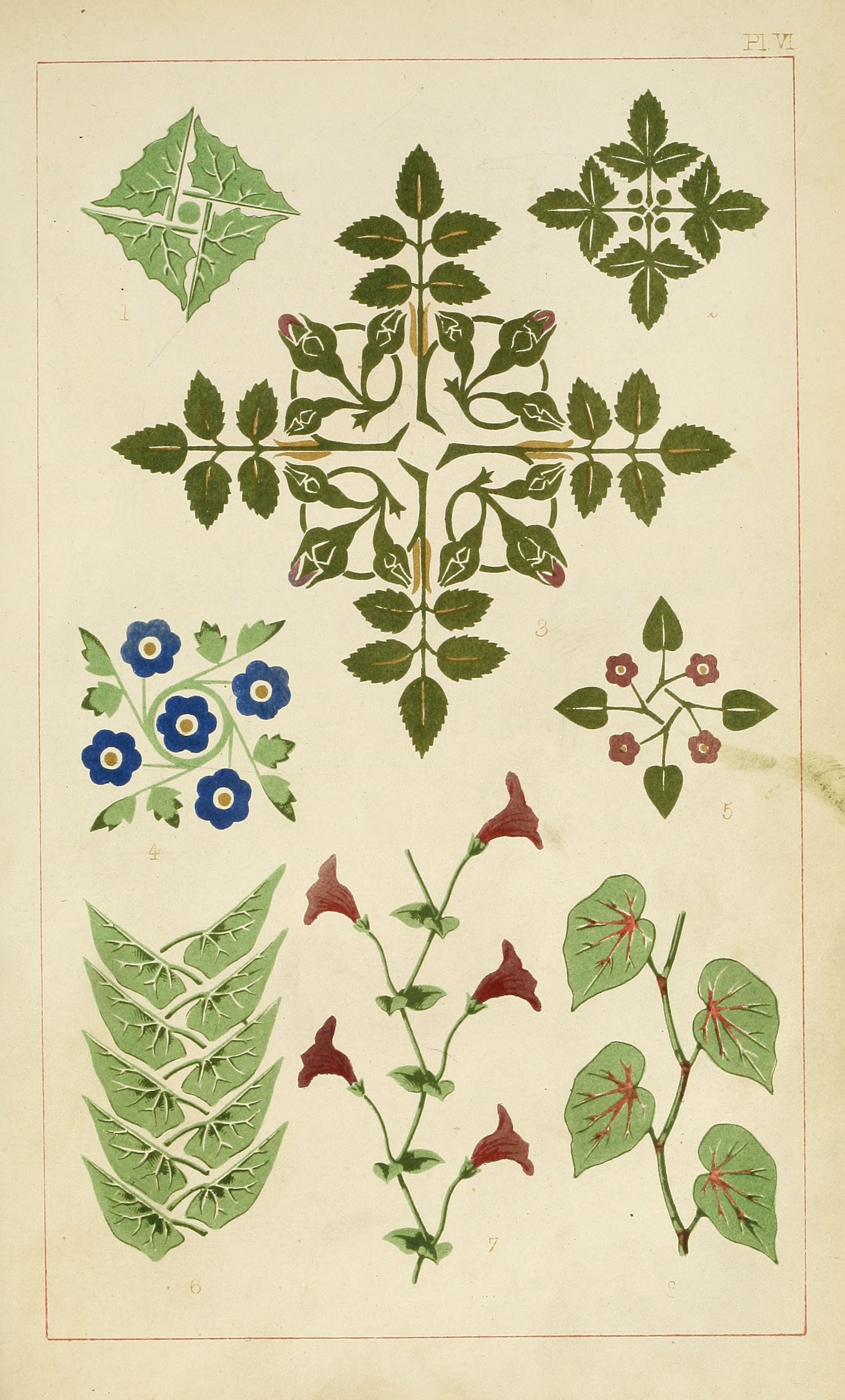 The book’s full title is “The art of decorative design: with an appendix, giving the hours of the day at which flowers open (the floral clock); the characteristic flowers of the month (both indigenous and cultivated), of all countries, and of the diversified soils“, by Christopher Dresser 1862.