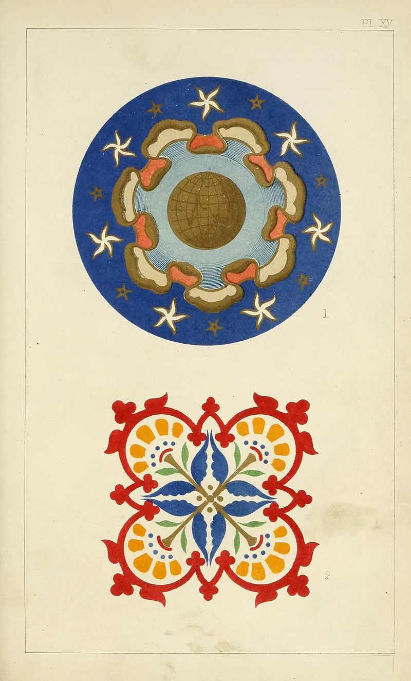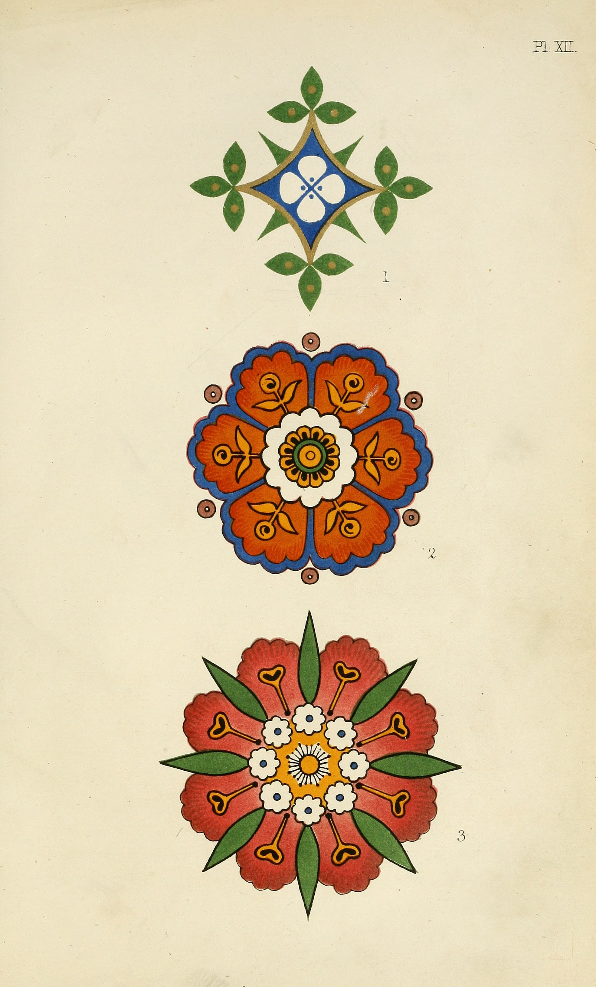 Dresser notes that the radiation of colourful shapes from a common centre can convey the idea of a flower. Although the design is recognized as floral, it doesn’t resemble any specific species of flowering plant.
