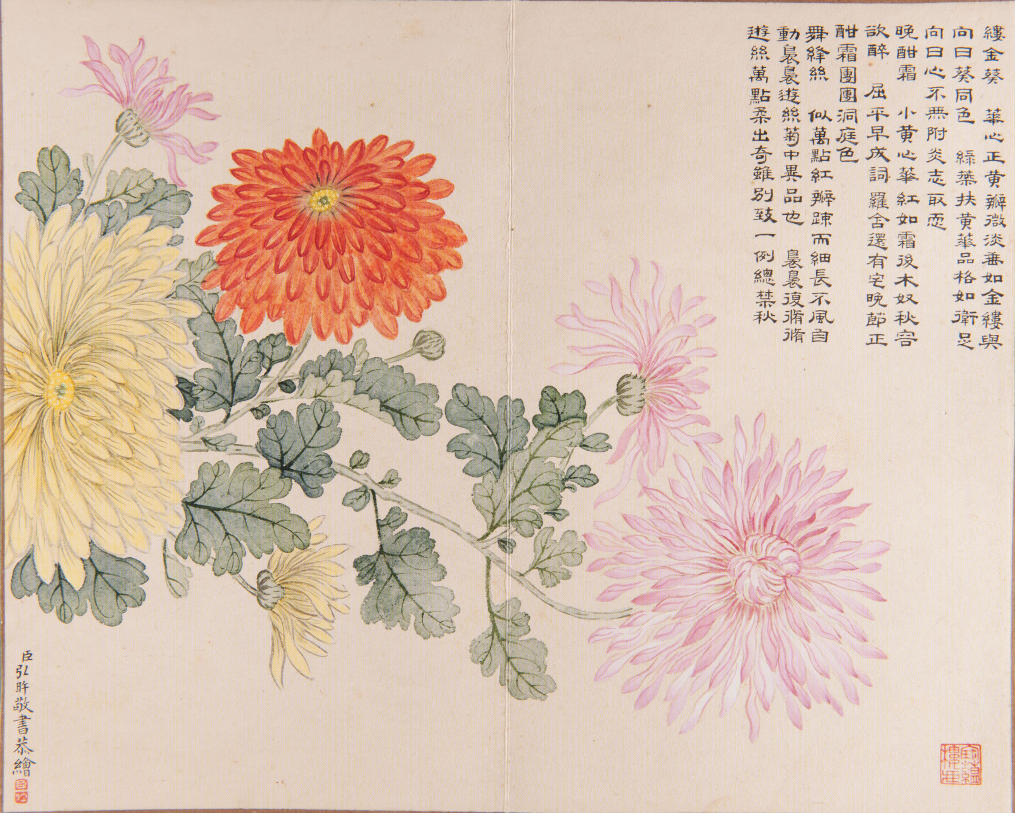 A painting of yellow, orange and pink Chrysanthemums from the Palace Museum in the Forbidden City Beijing.