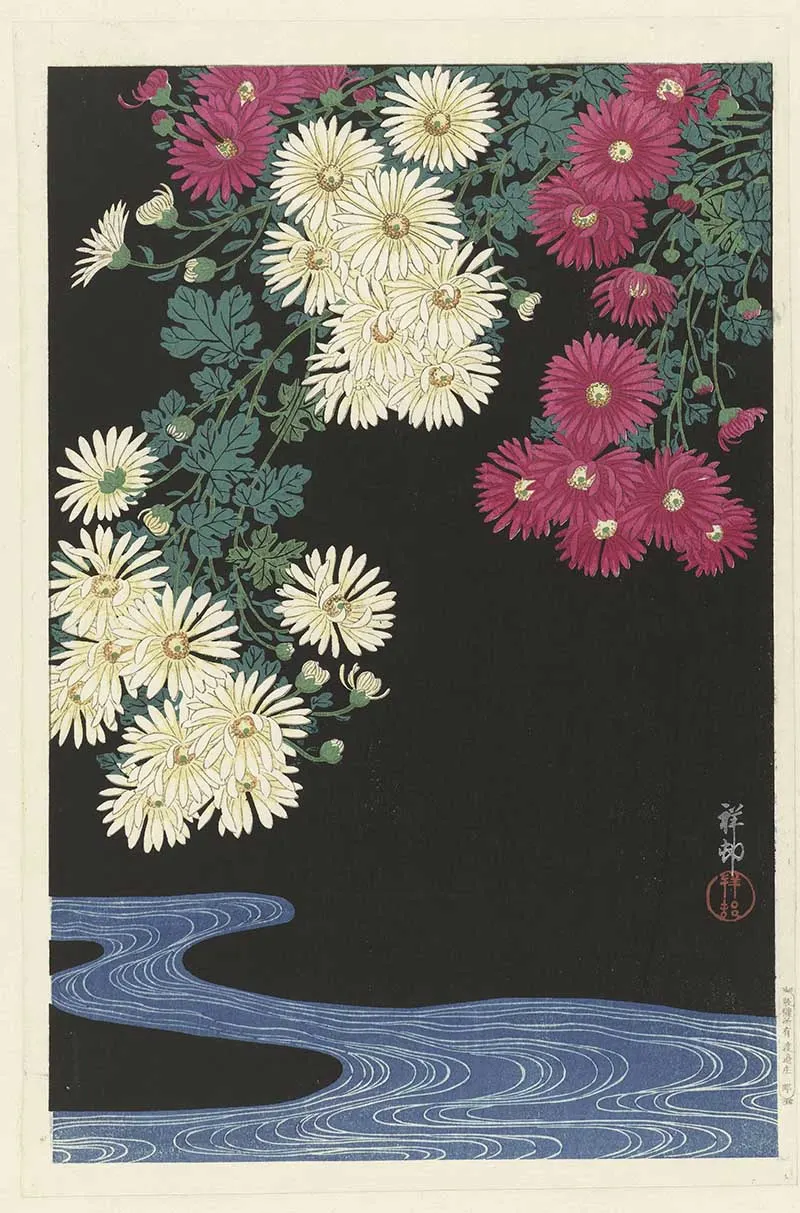 A Japanese painting of Chrysanthemums by the artist Ohara Koson.
