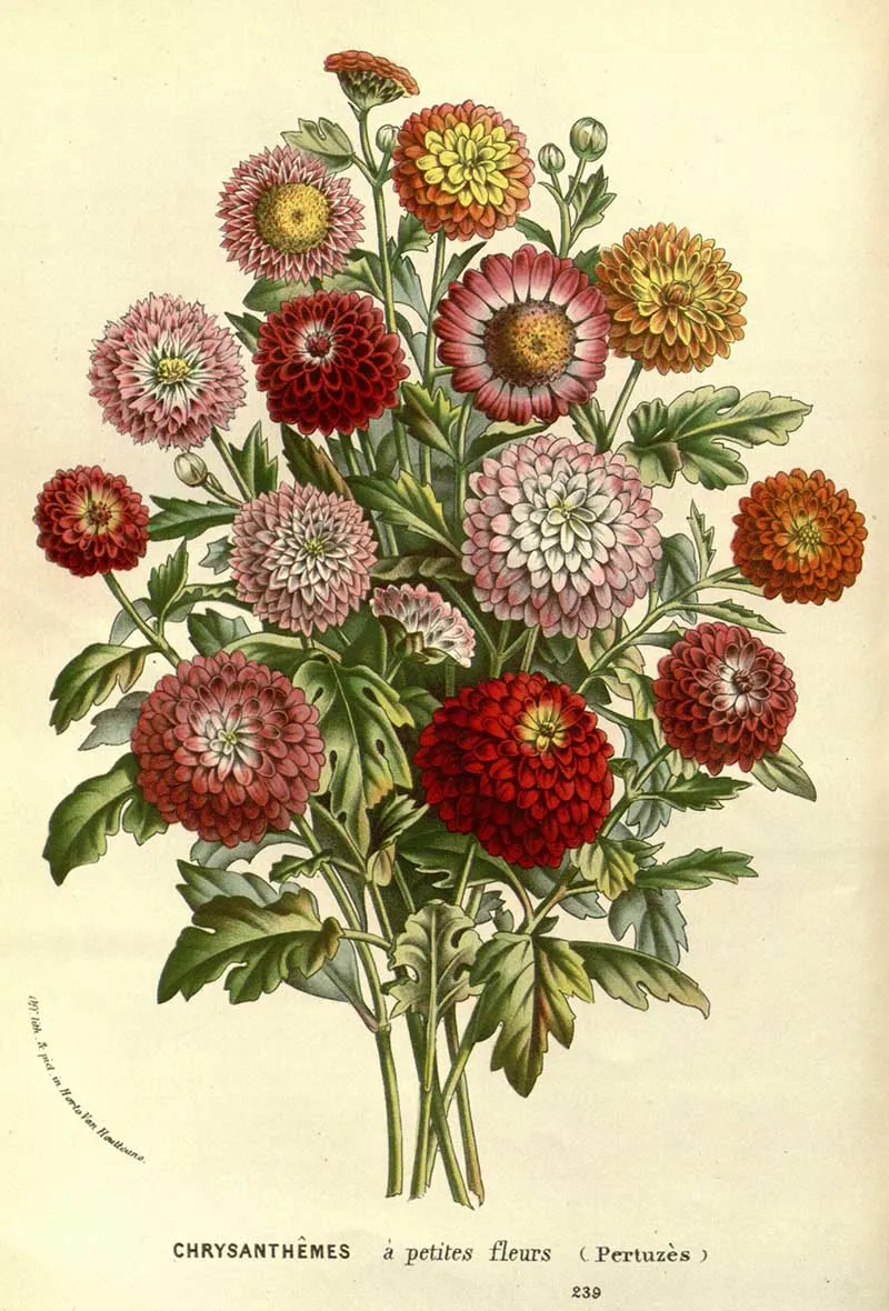 Inside: A collection of free Chrysanthemum botanical illustrations, art and drawings in the Public Domain.