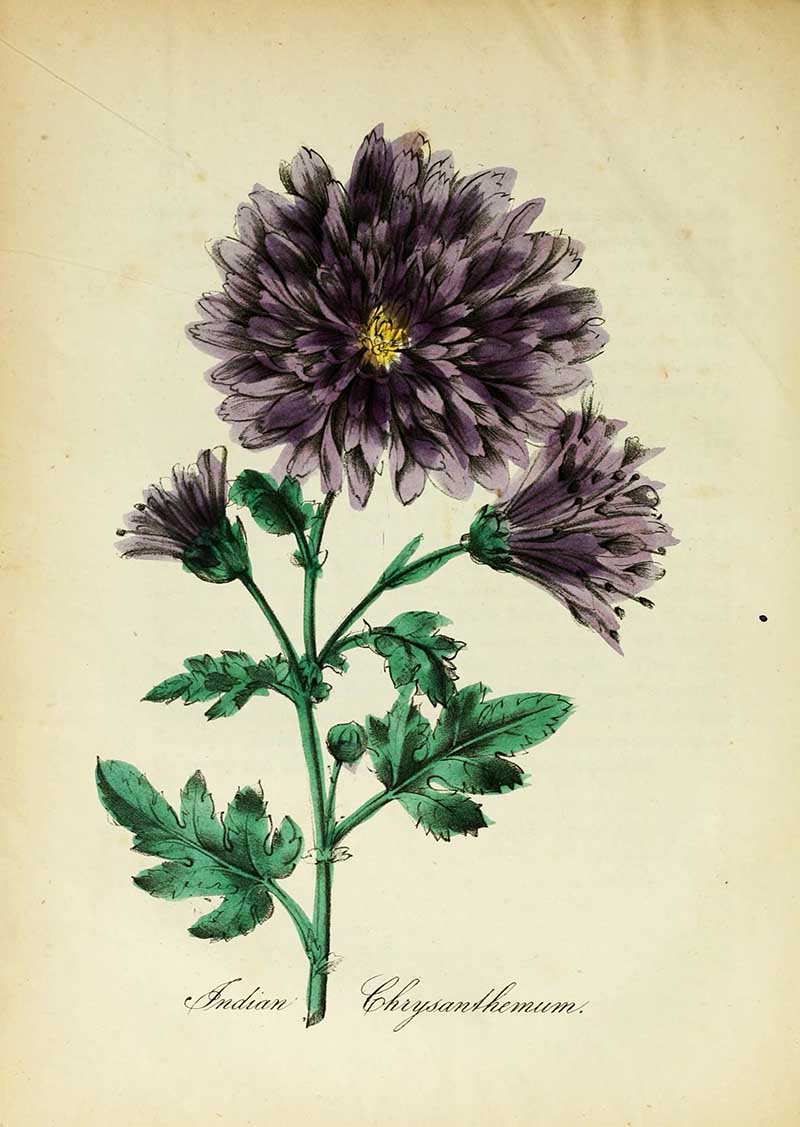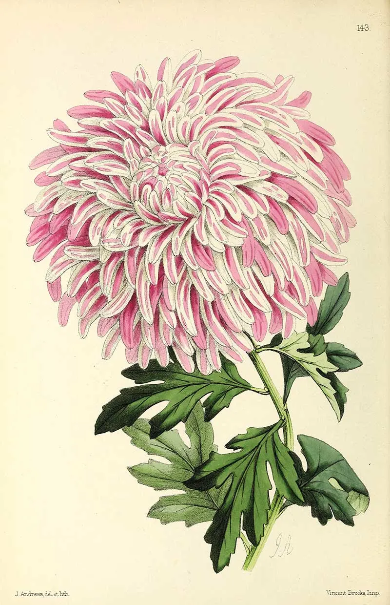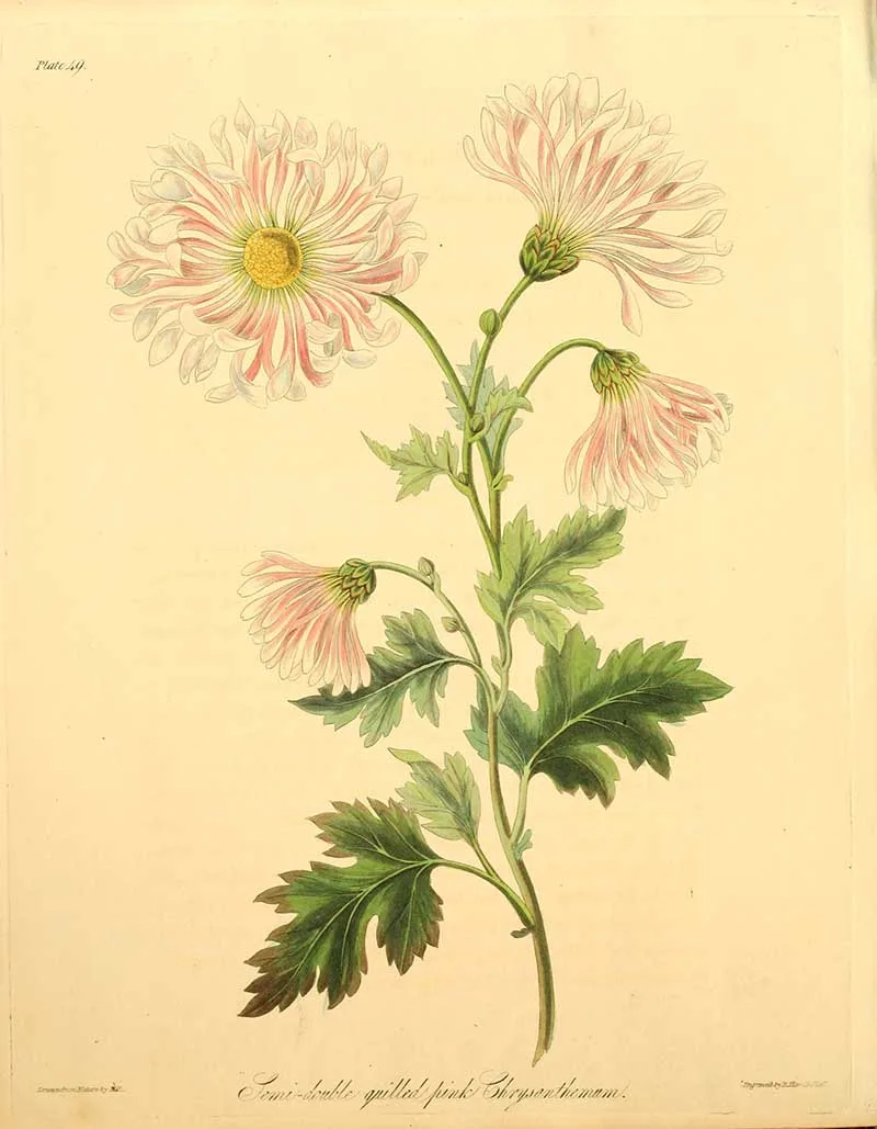 Semi-double quilled pink Chrysanthemum from the book “Floral Illustrations of the Seasons”m1829, by Margret Roscoe.
