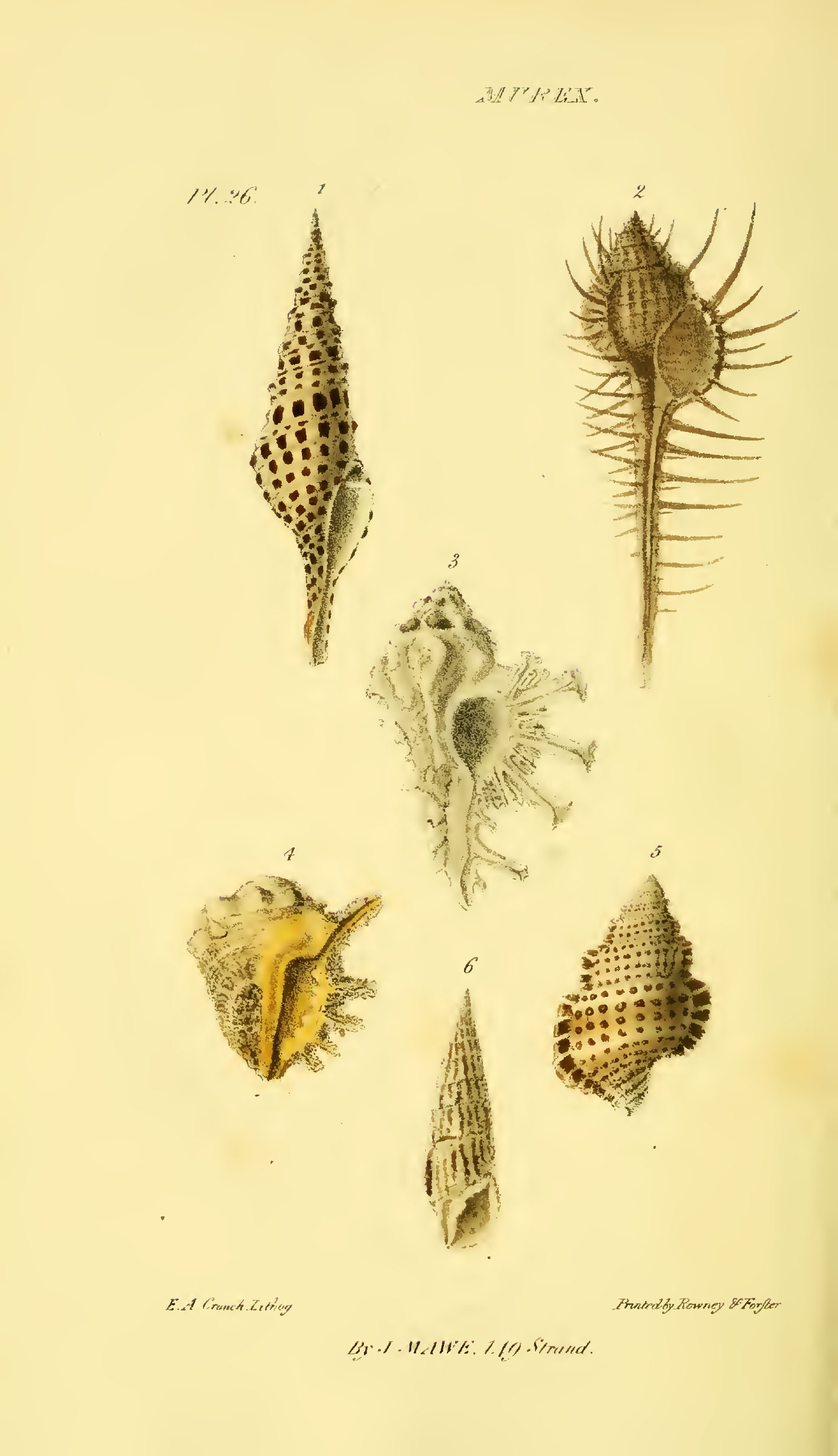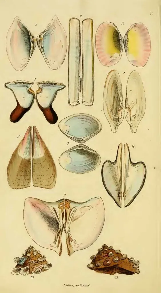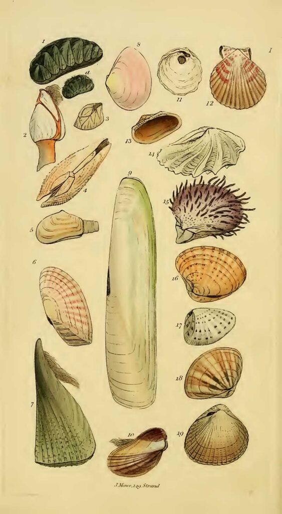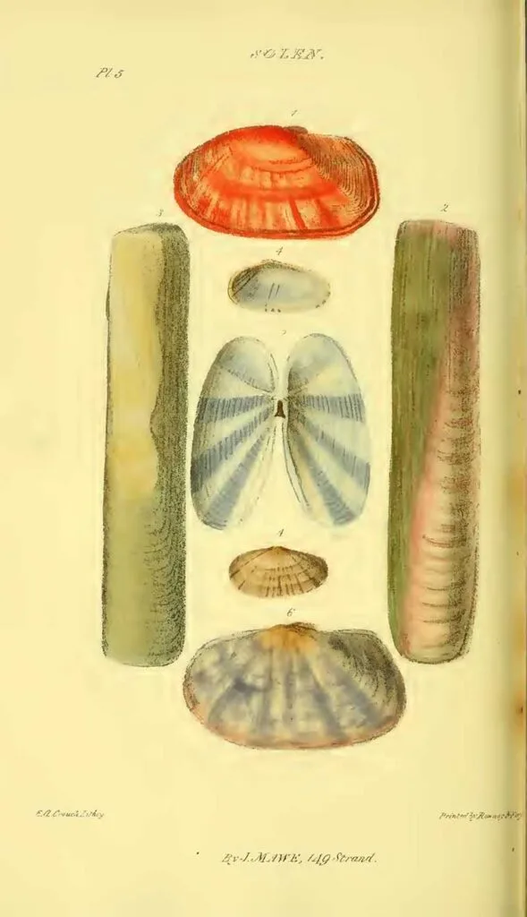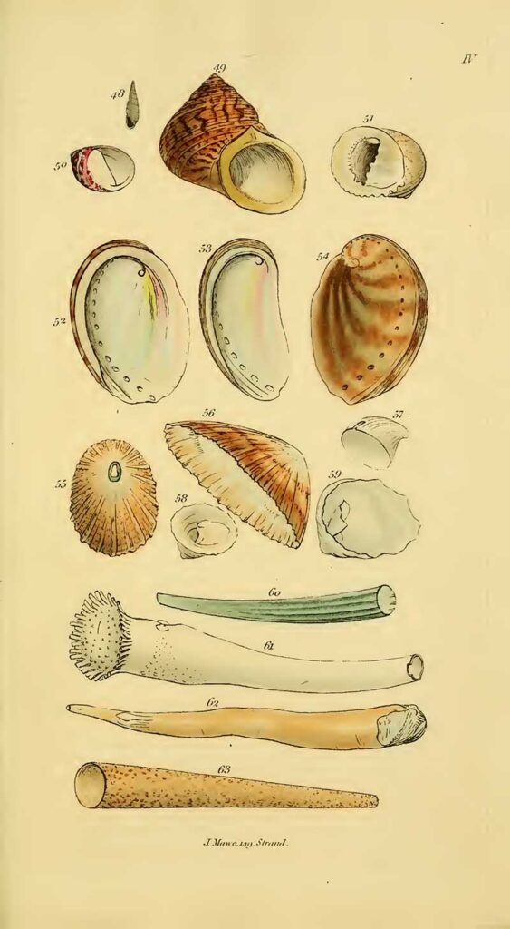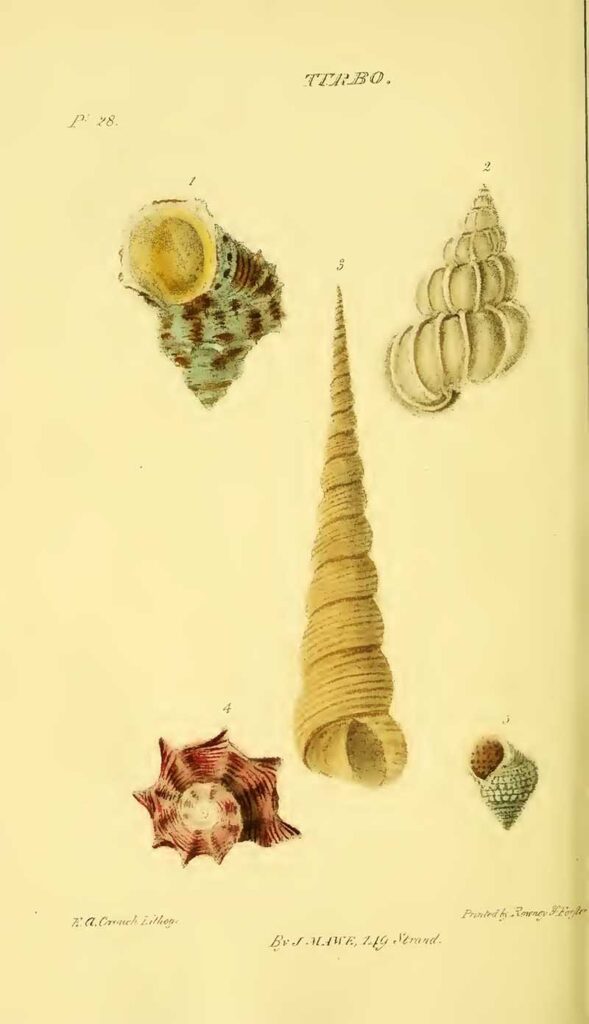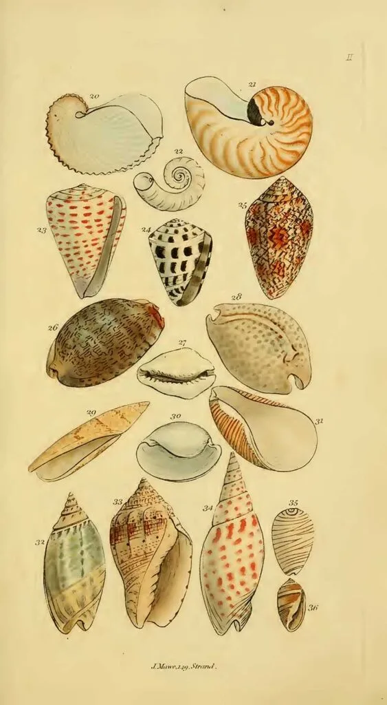 Many of the following conchology illustrations are from various editions of “Wodarch’s introduction to the study of conchology: describing the orders, genera, and species of shells: with observations on the nature and properties of the animals and directions for collecting, preserving, and cleaning shells”, by Wodarch, Charles; John Mawe; Crouch, Edmund A.