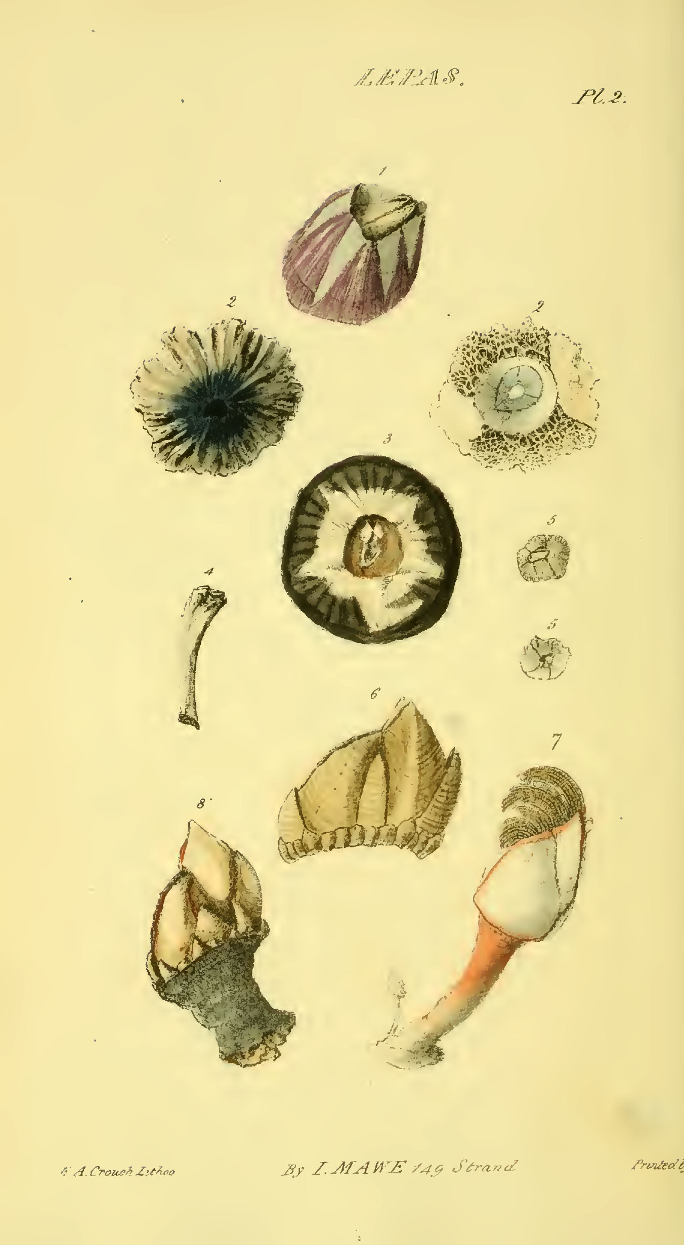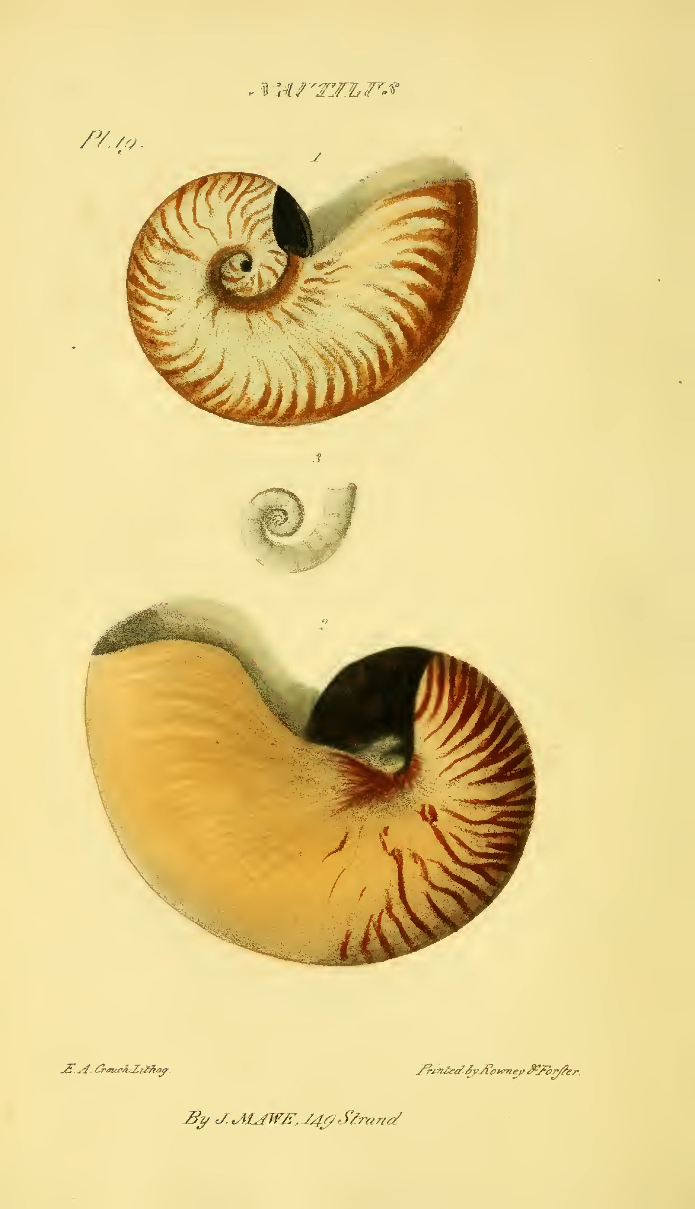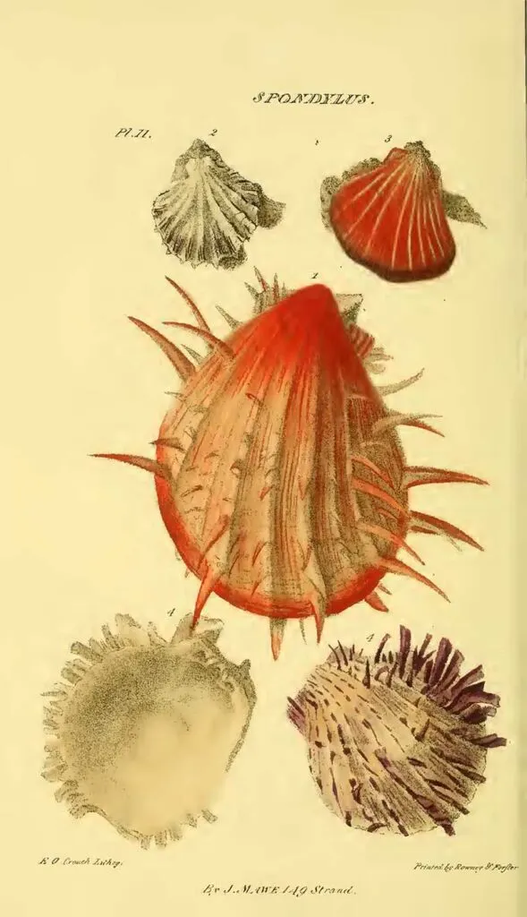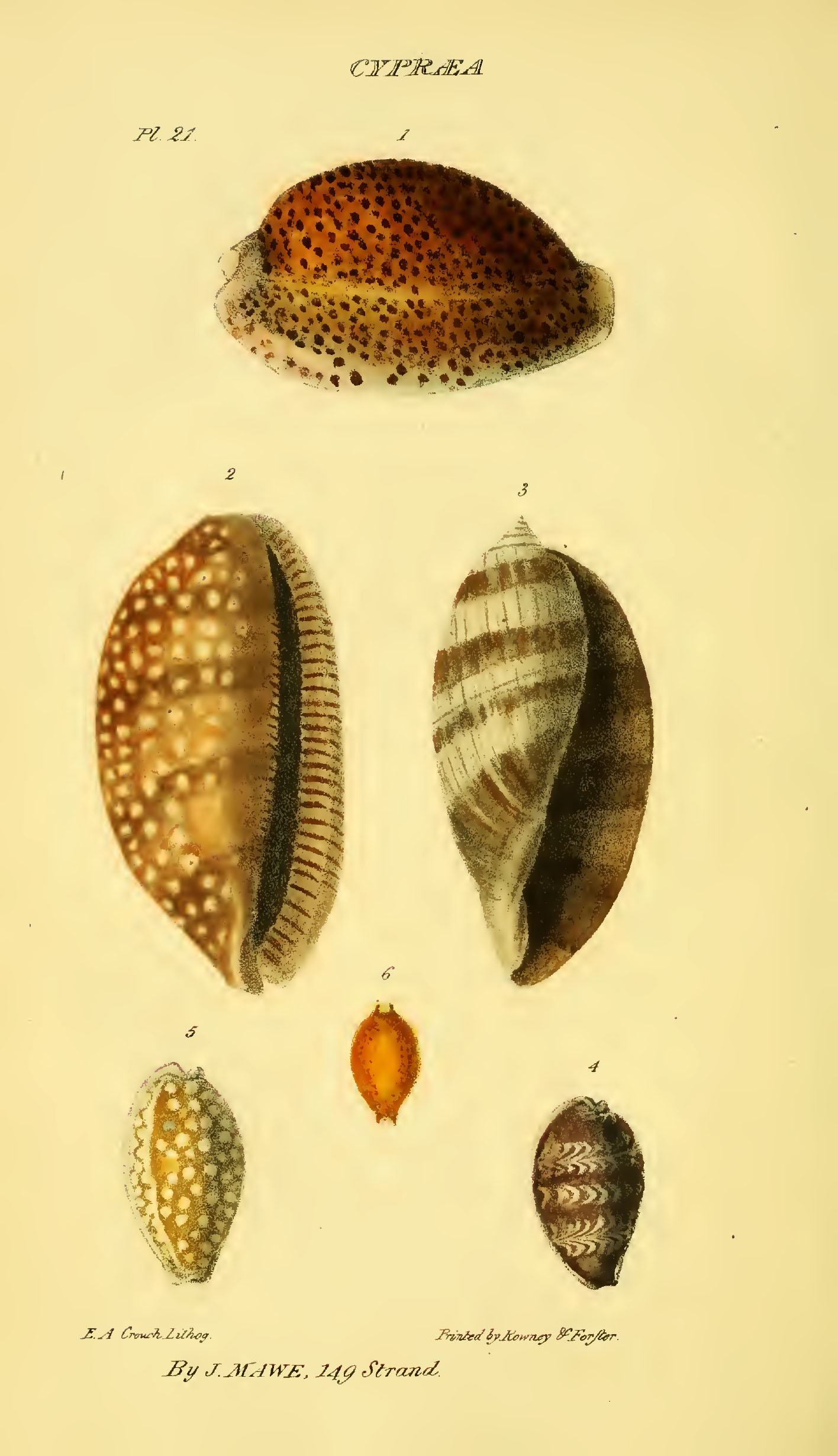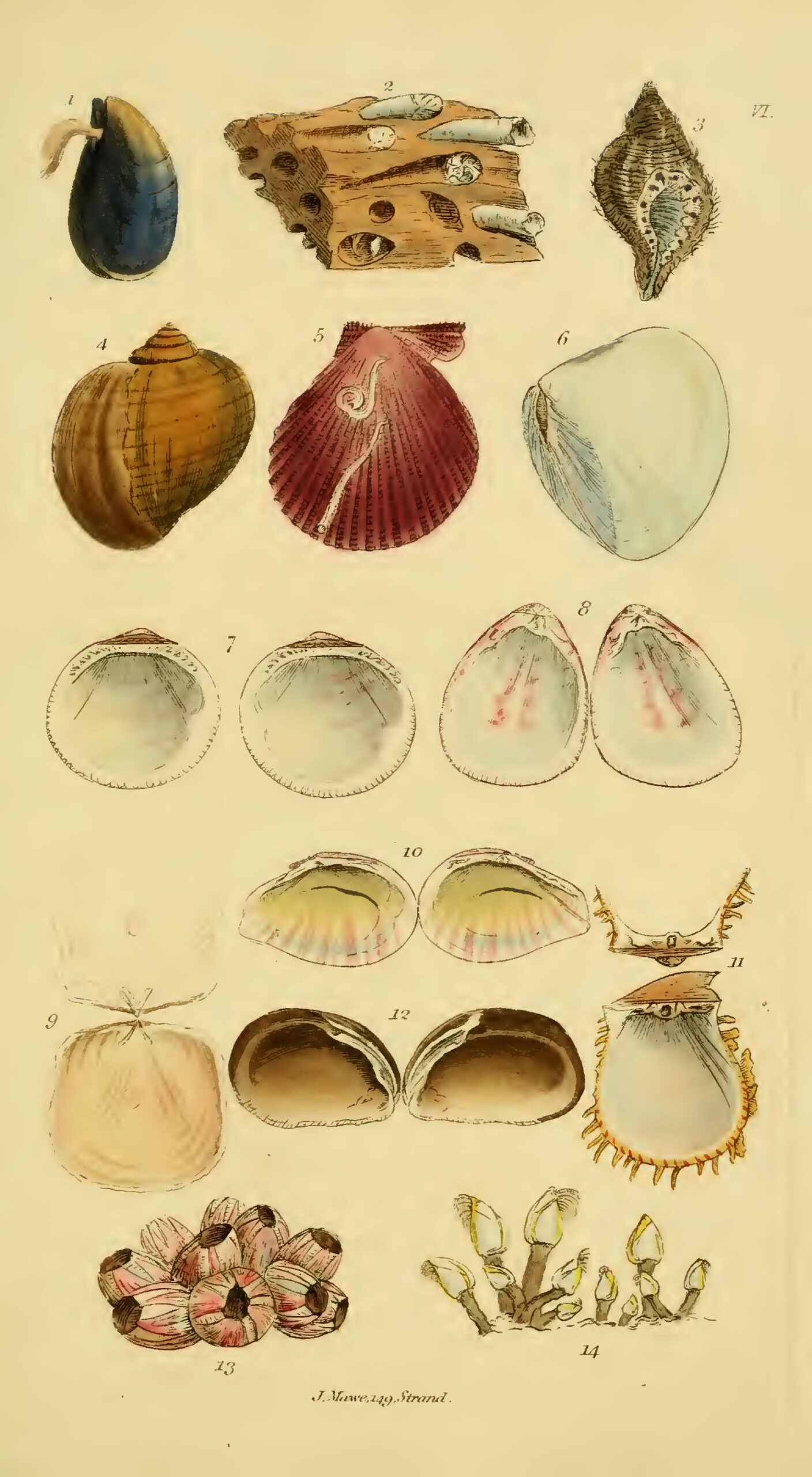 Many of the following conchology illustrations are from various editions of “Wodarch’s introduction to the study of conchology: describing the orders, genera, and species of shells: with observations on the nature and properties of the animals and directions for collecting, preserving, and cleaning shells”, by Wodarch, Charles; John Mawe; Crouch, Edmund A.