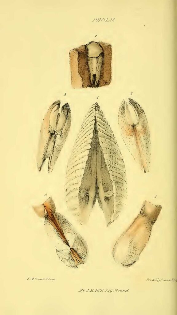 John Mawe describes Pholas as “Shell having two primary valves, divaricate, with several smaller, differently -shaped accessory valves at the hinge: — hinge recurved, united by a cartilage; in the inside, beneath the hinge, is an in- curved tooth.”