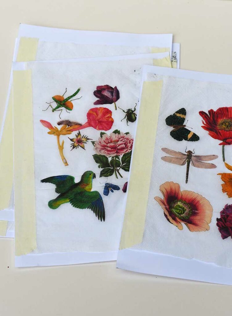 Step 4: I recommend printing the images onto paper napkins for the best results. To do this, get a plain white paper napkin and separate the ply (most napkins are 3-ply) so that you have just one very thin ply of paper. Tape the single napkin ply to a piece of computer paper using masking tape around the edges. Then feed this paper through your printer as usual.