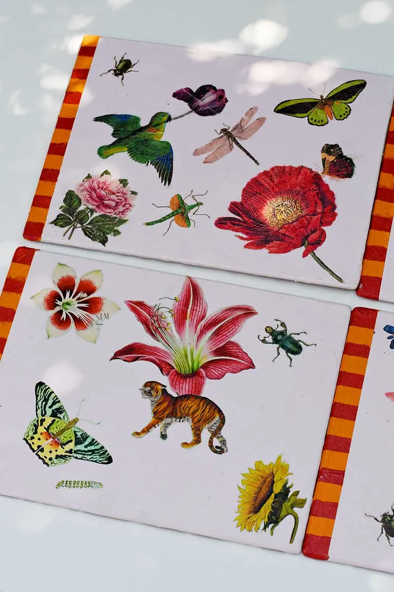 Printed paper napkins give a very flat finish to the decoupage mats as the paper is so thin. It will look like the image is printed on the mats rather than decoupage with paper napkins.