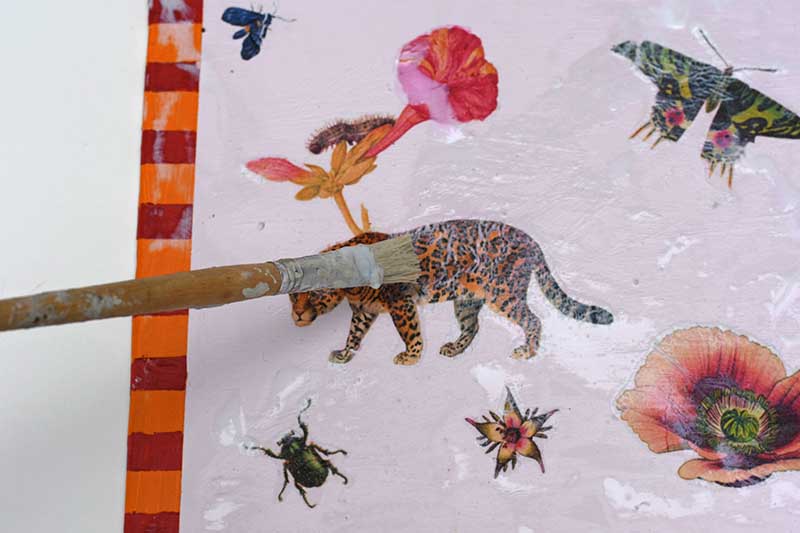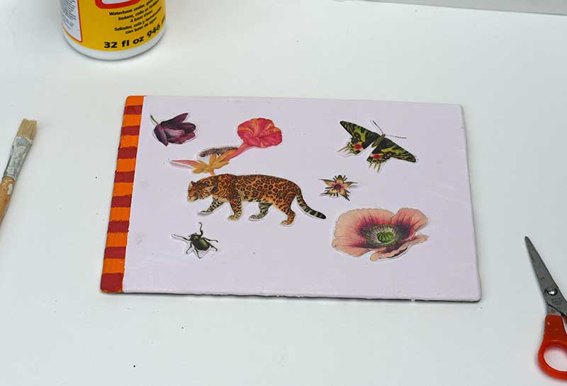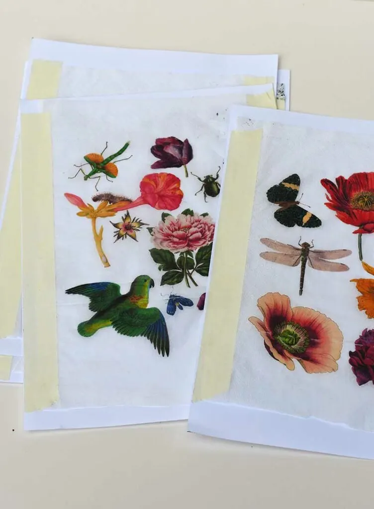 Step 5: Carefully cut out all the vintage images you want to use for the decoupage. I went for a mixture of flowers, animals and insects for each placemat. Play around with the layout before sticking any images down.