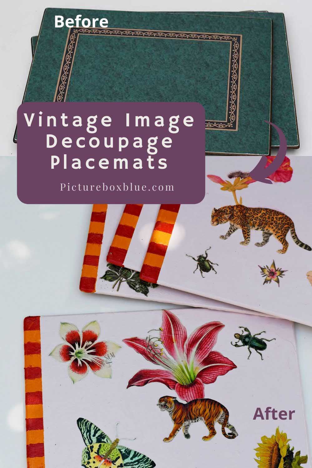 I’m always looking for fun ways to use fabulous vintage images on this site. This time I have used them to make these fun decoupage placemats.