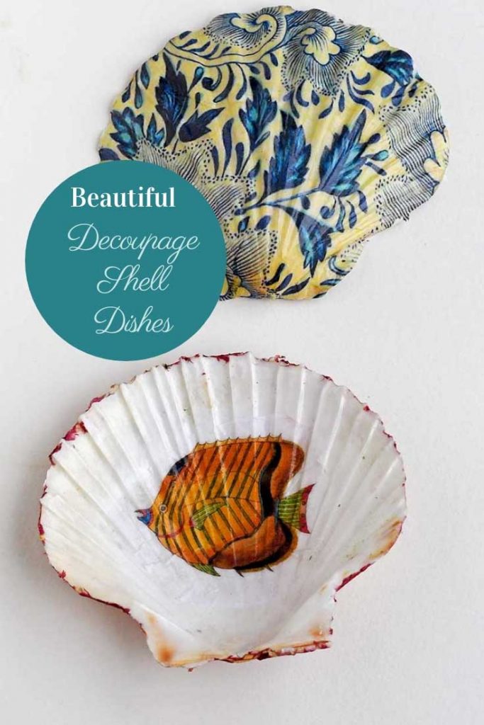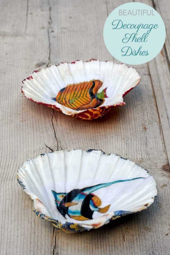You could also use the decoupage shell dish as a trinket dish and make shell ornaments. Just use smaller shells and drill a small hole from some ribbon into each one.