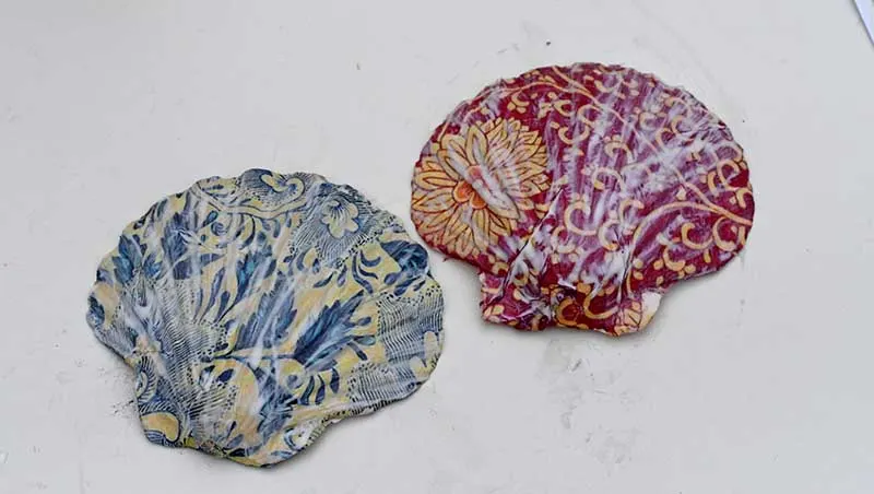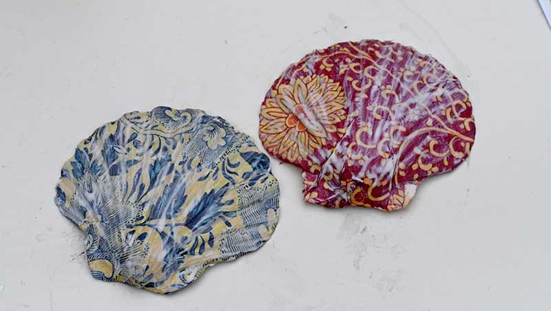 Step 5: Next, turn over the shell and decoupage the outside of the shell dish the same way, applying the glue to the shell and using a brush.