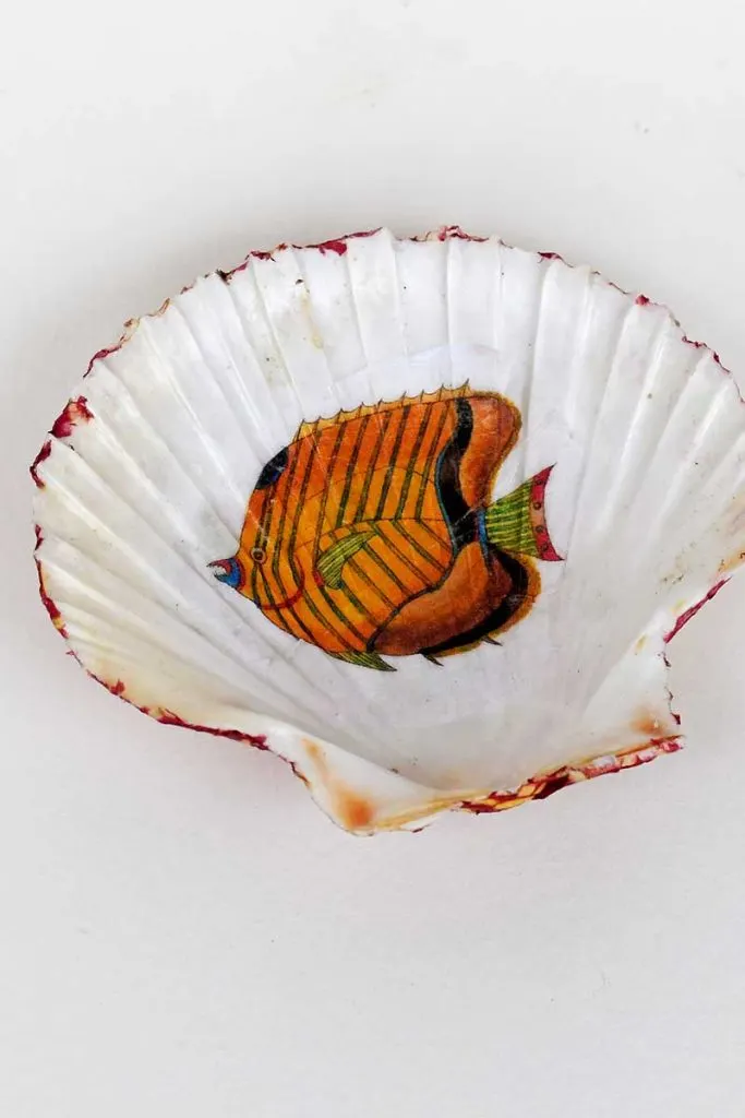 Step 4: Next, carefully cut out the printed tissue paper fish. Apply Mod Podge or other decoupage glue to the inside of shell. Carefully lay the fish onto the glue and then use a clean brush to remove any air bubbles.