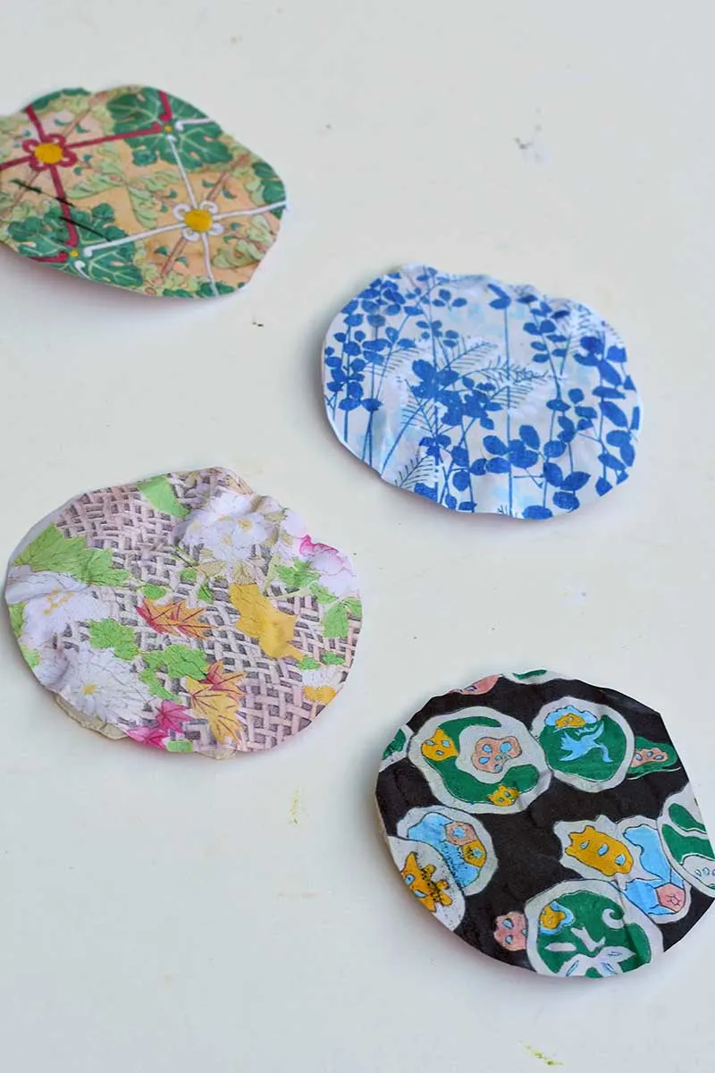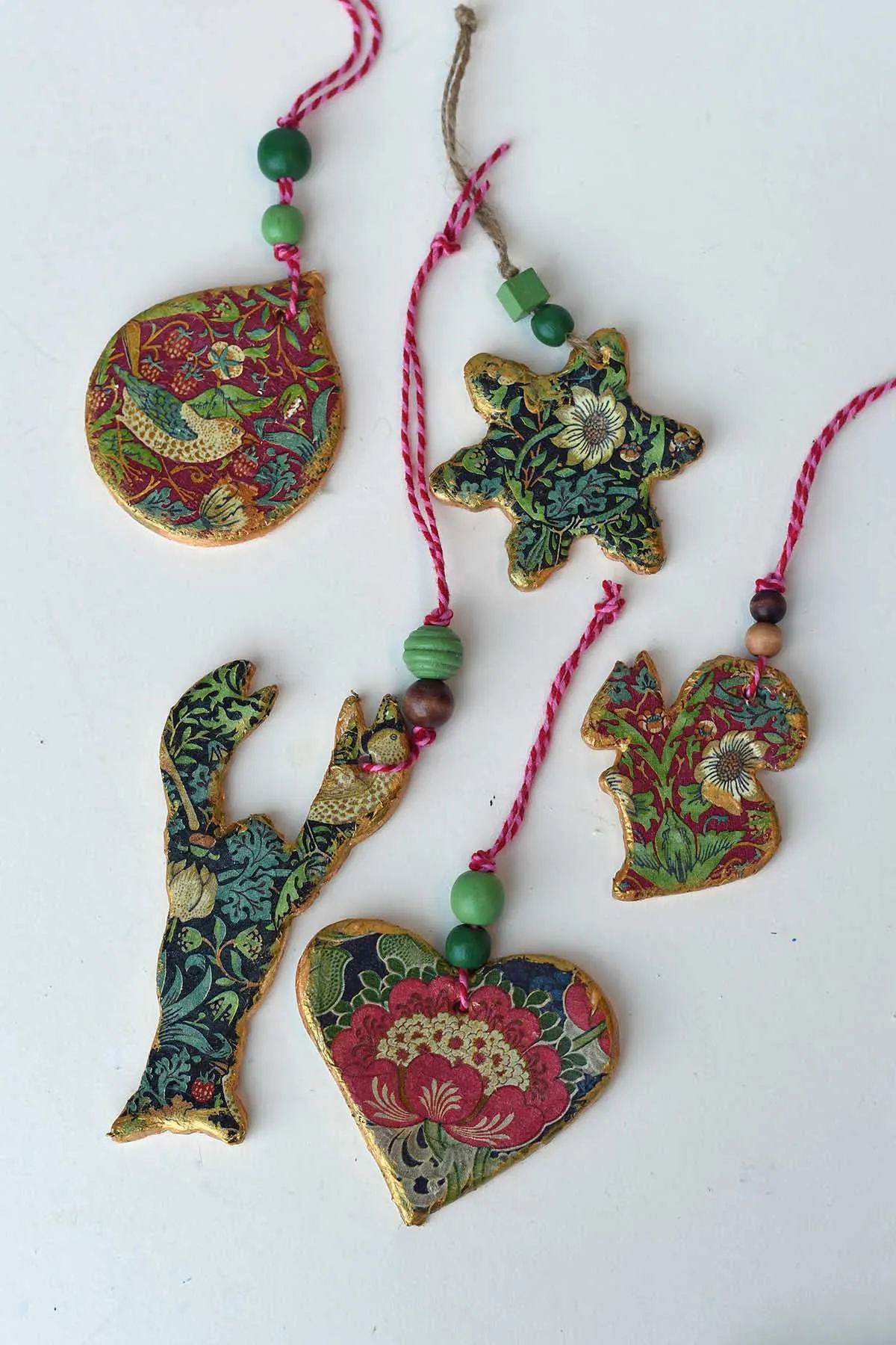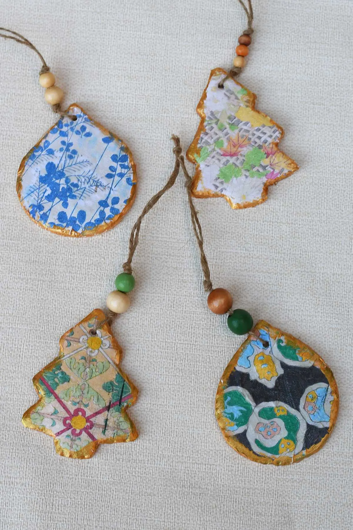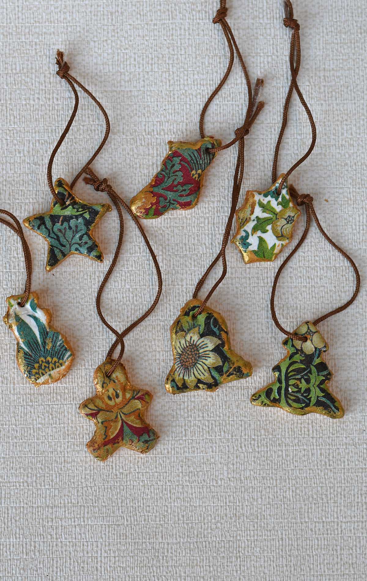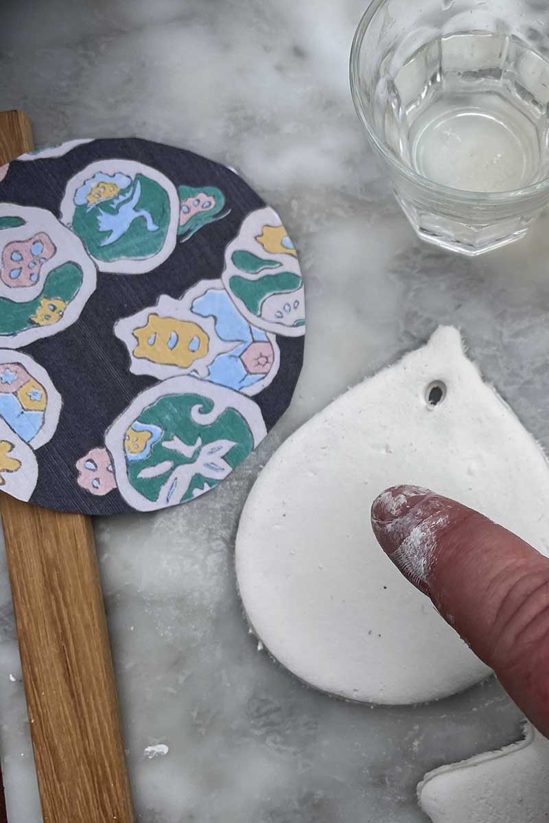 There are two ways to decoupage the clay ornaments: one while the clay is fresh using a small amount of water, and the other is after the drying process with Mod Podge decoupage glue. I went with the former.