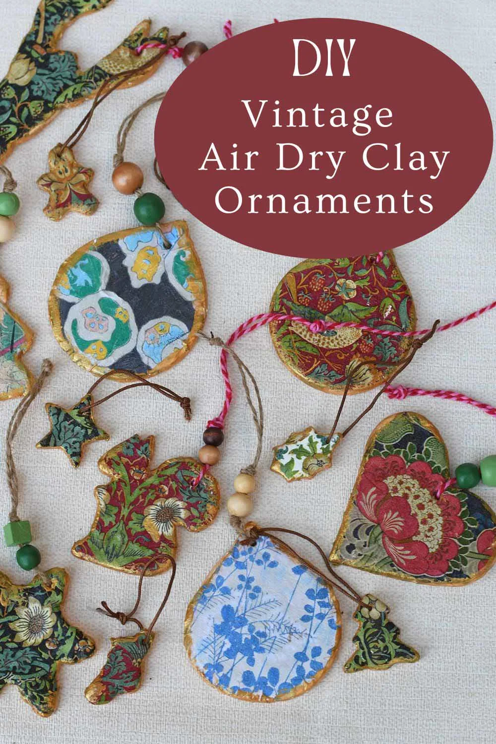 If you’re like me and love having unique designs around your home, you’ll enjoy this vintage image craft. I’ve decided to make air dry clay Christmas ornaments and give them a special touch by decoupaging them with vintage patterns.