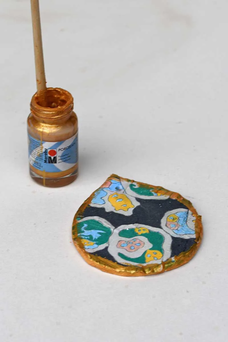 Then paint to the edges of the ornaments with gold acrylic paint, this adds an elegant flair to your Christmas decorations.