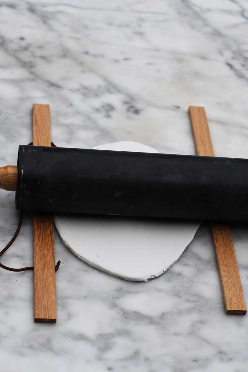 Step 2: Start with a small piece of clay, rolling it out with a rolling pin to ensure a smooth surface. Use two guides (wooden rulers) to ensure that the clay is rolled out to an even thickness.