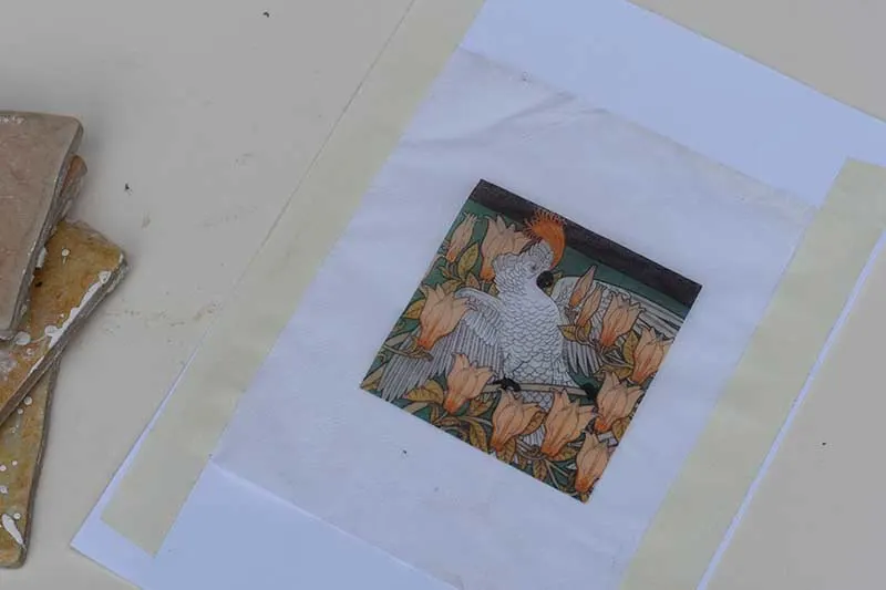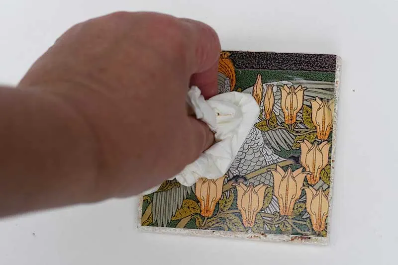 Screw up a paper napkin into a ball and then use this to press the image onto the top of the tile. At the same time, push out any air bubbles. Then leave the tile coaster to dry.