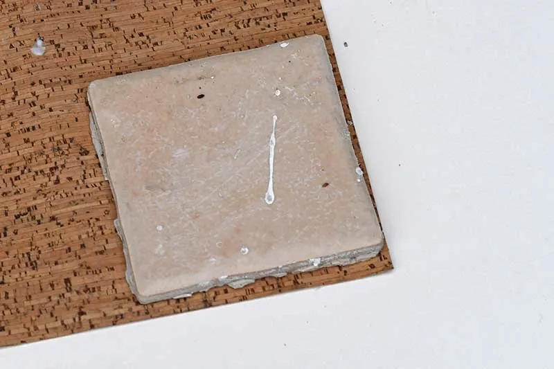 Step 4: Place the tile coaster onto the cork fabric mat and draw around it. Then cut out the cork and glue it to the underside of the tile. This will protect your table from being scratched by the ceramic tile.