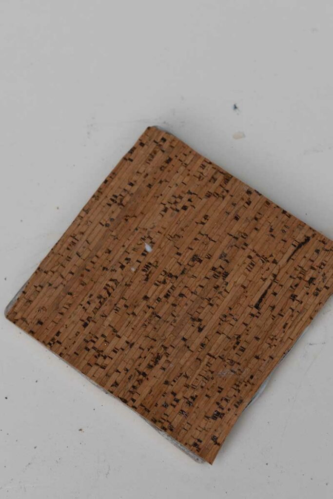 Step 4: Place the tile coaster onto the cork fabric mat and draw around it. Then cut out the cork and glue it to the underside of the tile. This will protect your table from being scratched by the ceramic tile.